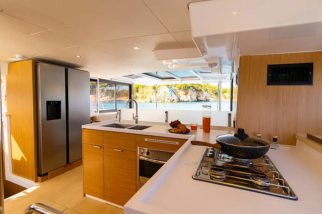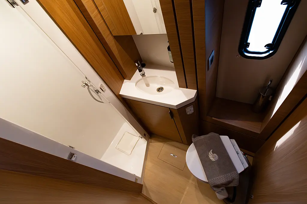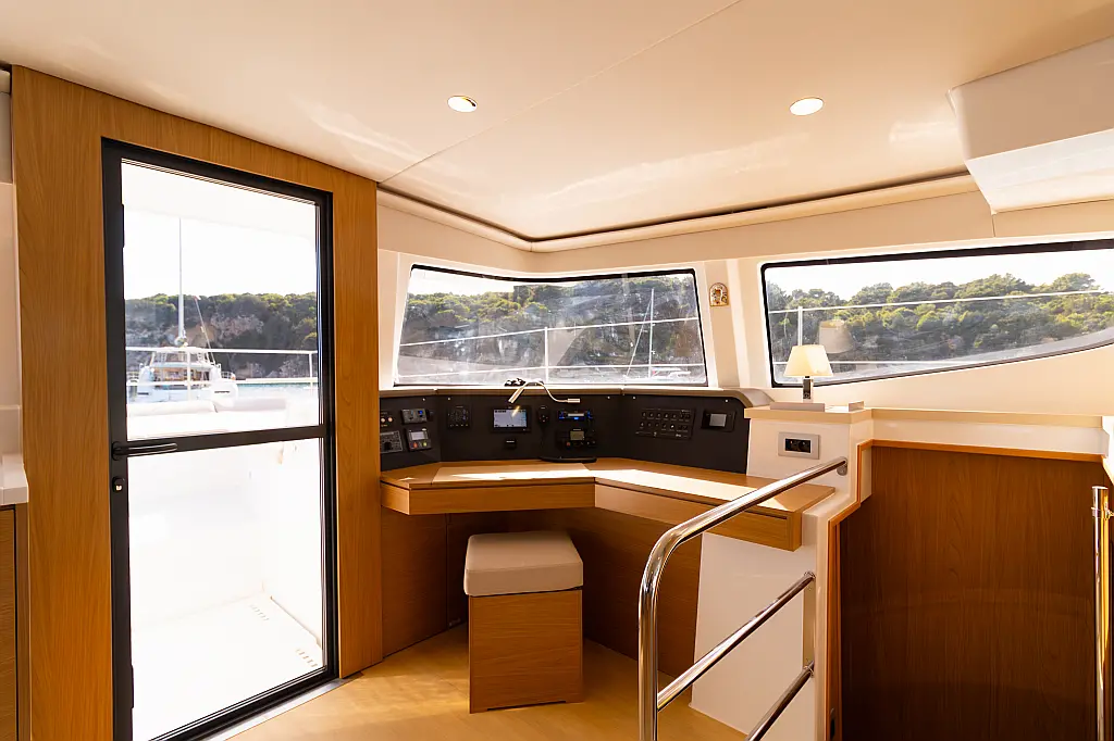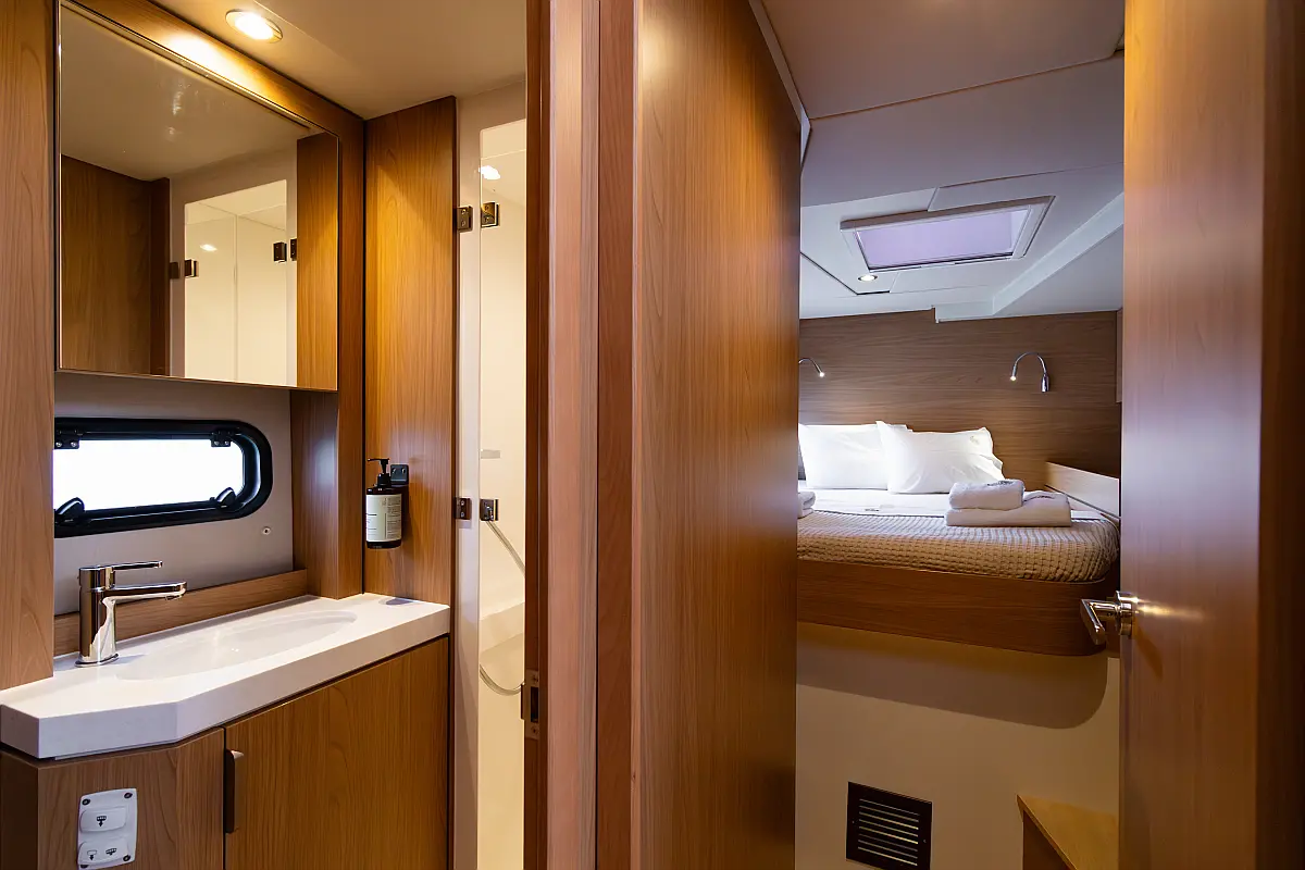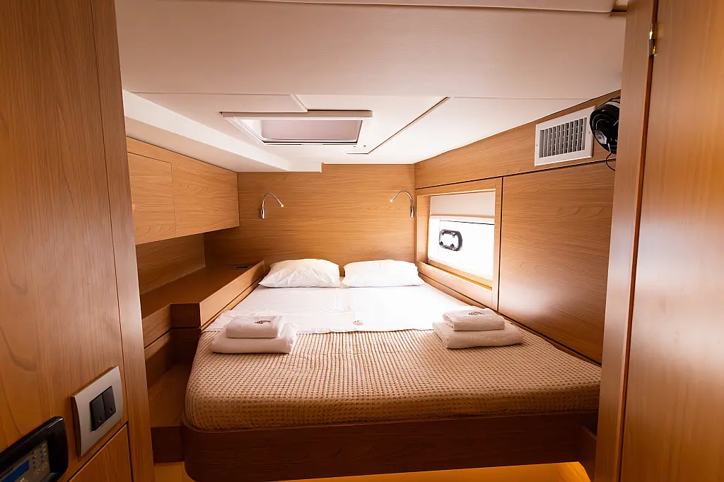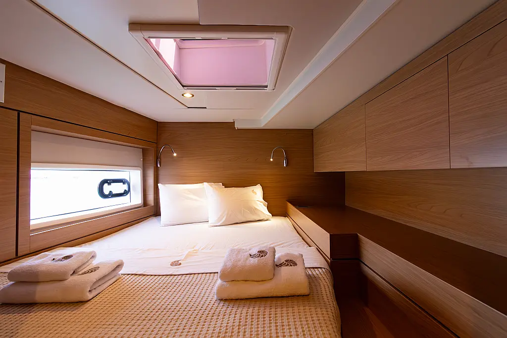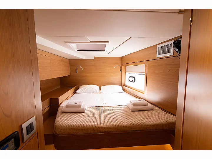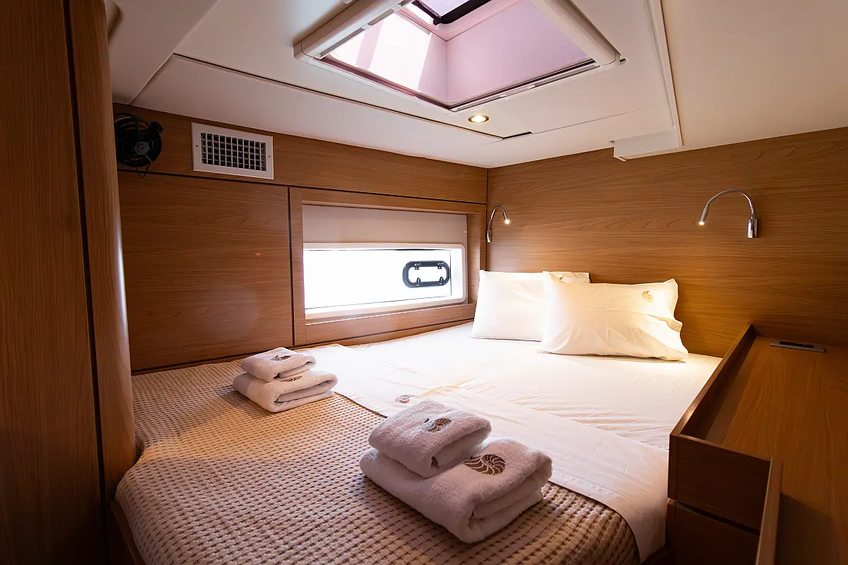 Furling Genoa, Lazy bag, Lazy Jacks (true), Autopilot, Dinghy with Outboard motor, Full Set of Charts, Fly Bridge Bimini, Cushions on the flybridge and sunbathing deck, Cockpit Cushions, Cockpit Shower, Electric Anchor Windlass, Electric Winch, Wind Instruments, Depth Sounder, Hot Water, Cabin Fans, Electric Toilet Pump, Generator, Independent A/C in all cabins, Watermaker, Battened mainsail, Solar panels, Inverter, VHF