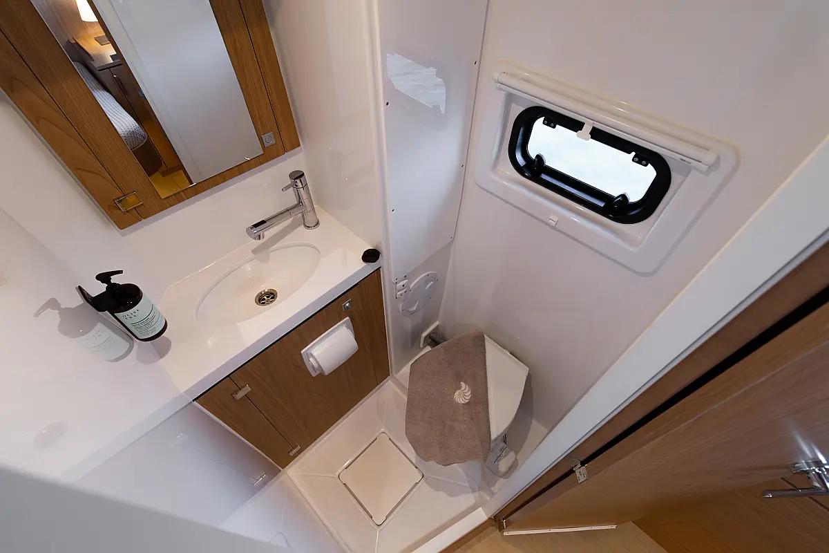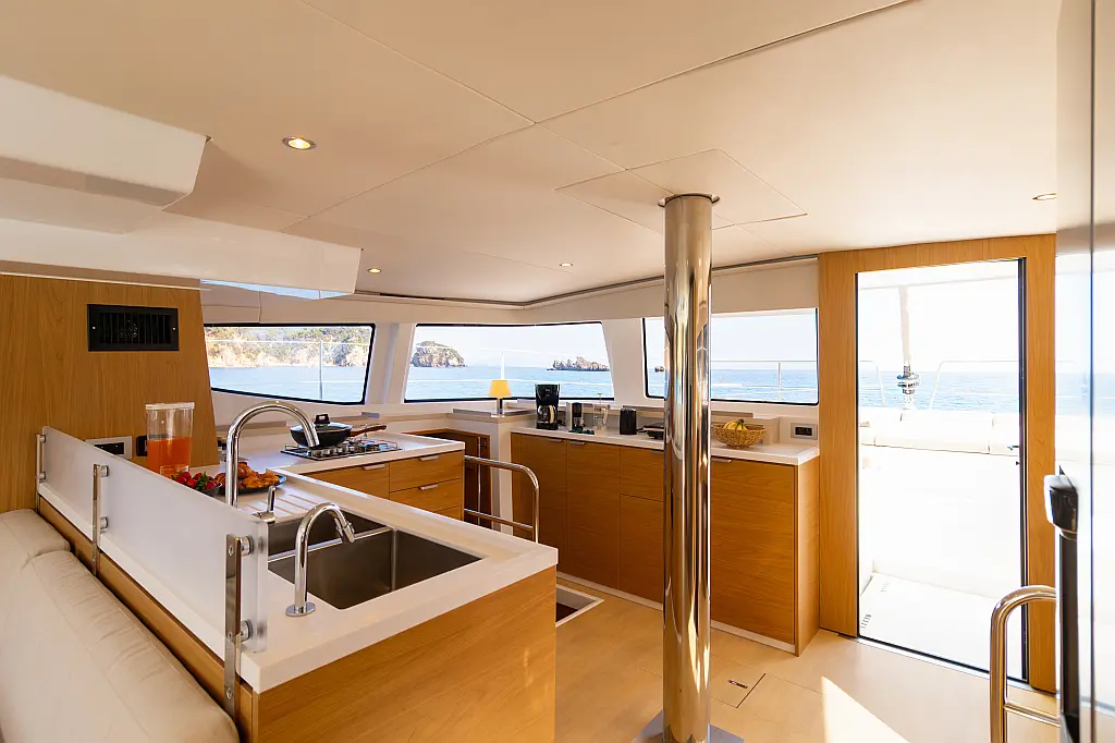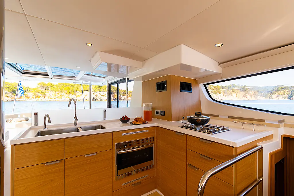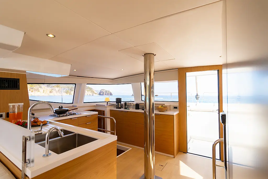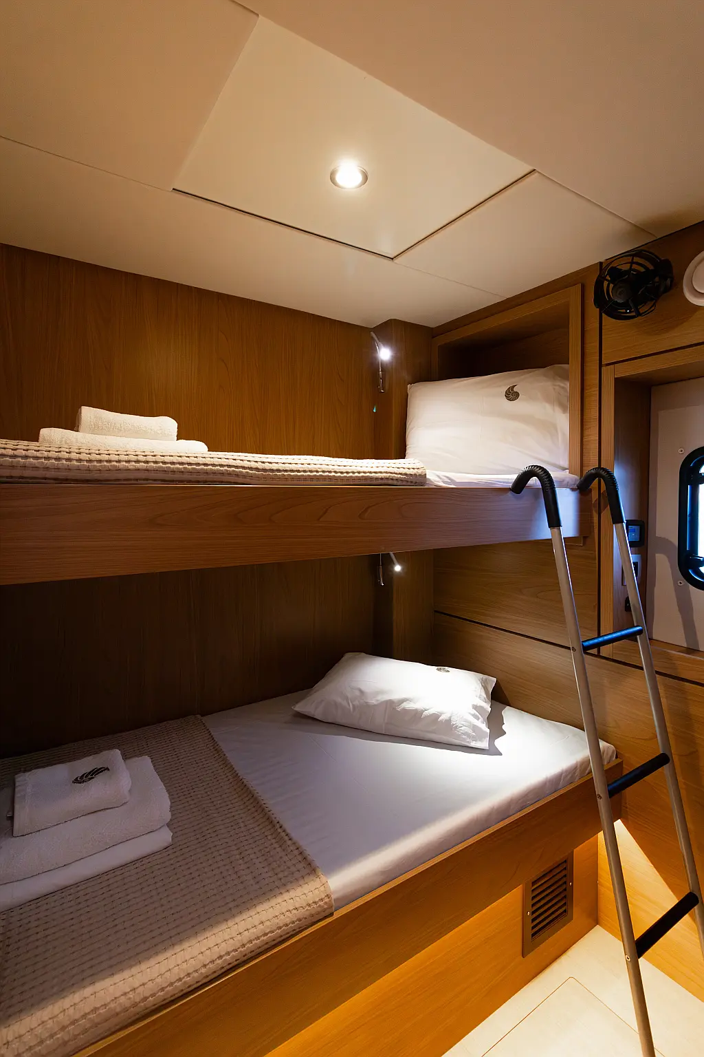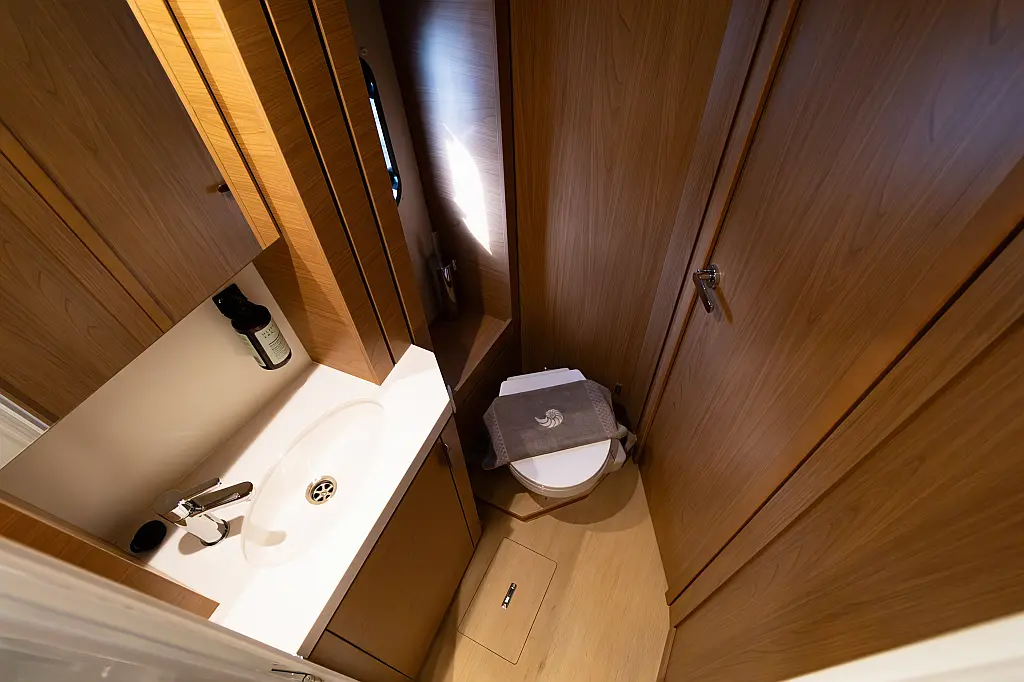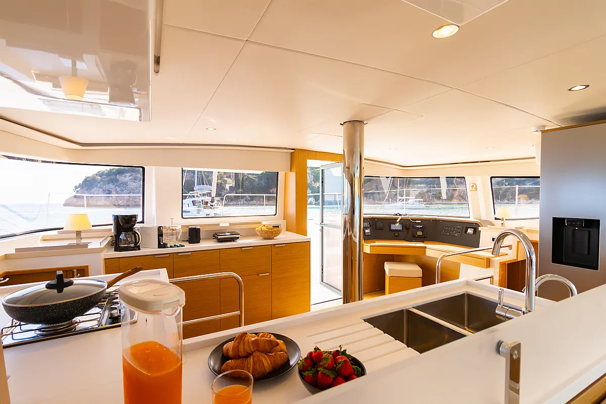 Furling Genoa, Lazy bag, Lazy Jacks (true), Autopilot, Dinghy with Outboard motor, Full Set of Charts, Fly Bridge Bimini, Cushions on the flybridge and sunbathing deck, Cockpit Cushions, Cockpit Shower, Electric Anchor Windlass, Electric Winch, Wind Instruments, Depth Sounder, Hot Water, Cabin Fans, Electric Toilet Pump, Generator, Independent A/C in all cabins, Watermaker, Battened mainsail, Solar panels, Inverter, VHF