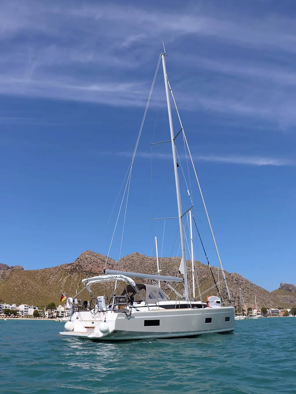 Anchor light, Automatic charger 220V, Cockpit Shower, Bimini, Bathing ladder, Bilge pump electric, Boat hook, Boatswain's chair, Bow and stern pulpit, Steamer light, Deck brush, Dinghi, Double sea railing, Electric shore connection cable 220V, 25 m, Electric windlass, Holding tank, Halyard winches 2 pieces, fenders 6-8 pieces, mooring ropes 4 pieces (30 m), Gangway, Main anchor with 50 m chain, national flag, Position light, contactor, towing line 25 m, Schootwinsche, Sprayhood, Diving goggles and snorkel (1 Set), Second anchor, Shroud cutter, tool box, yacht & engine key