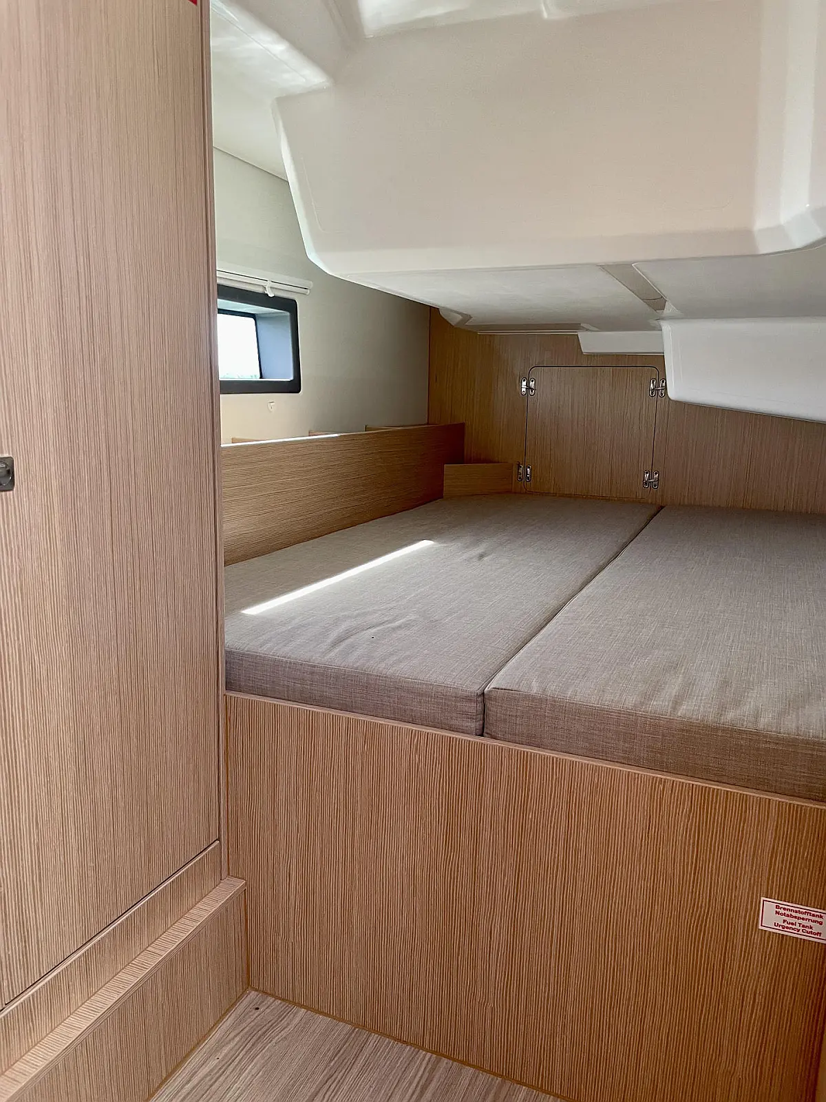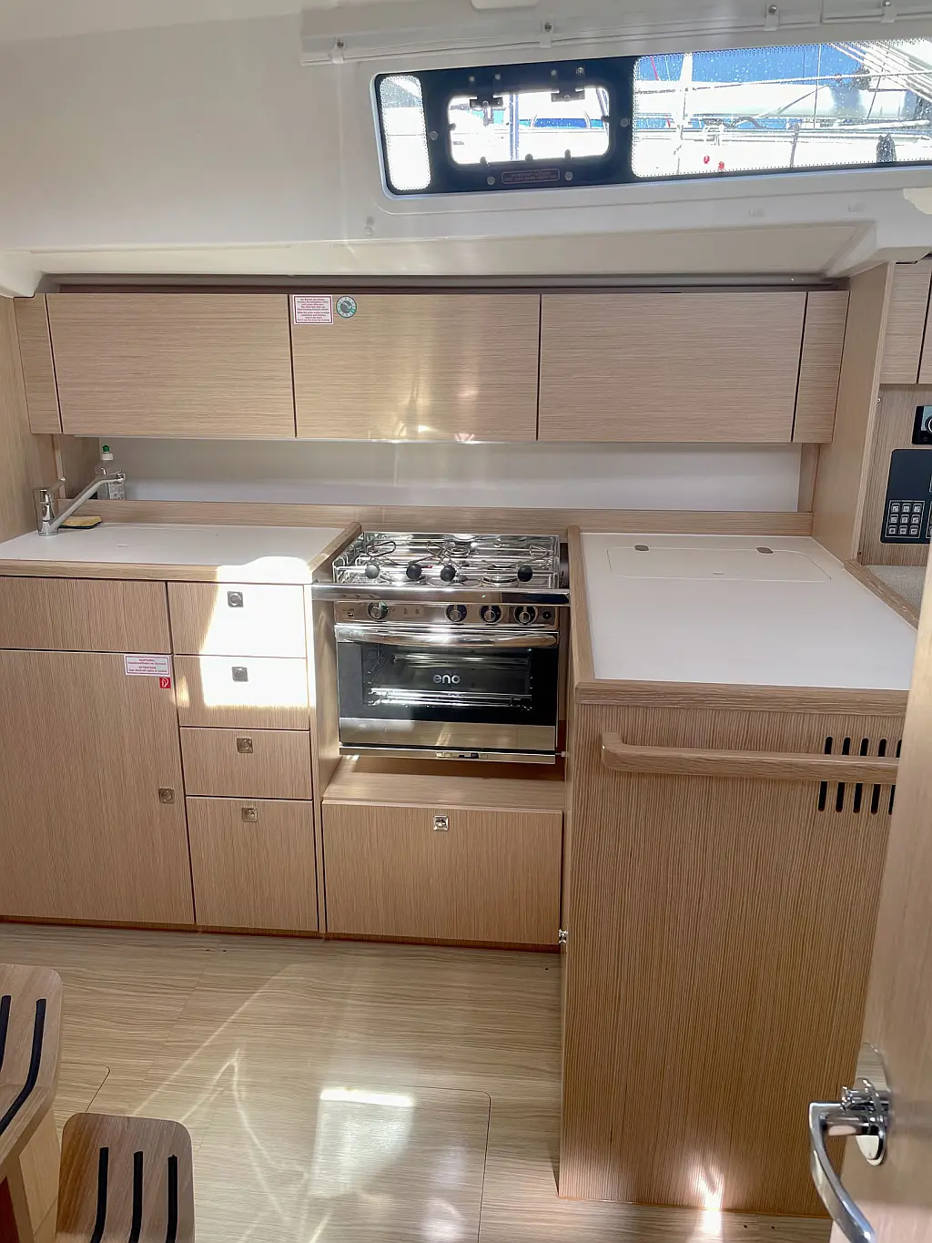 Flat keel, teak on the bathing platform - in the saloon and on the cockpit benches, Electric sheet winches, 3-blade folding propeller, pleated blinds in the saloon and cabins