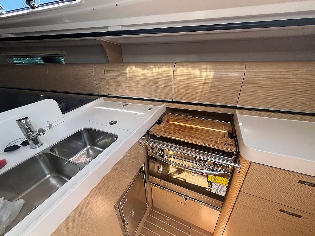 Pantry accessories, Holding tank, Refrigerator, Bed linen, Sprayhood, Cockpit table, Outdoor - stern shower, Bathing platform, Heating, Radio - CD, MP3, USB, AUX, Outdoor speakers, Oven, Stove