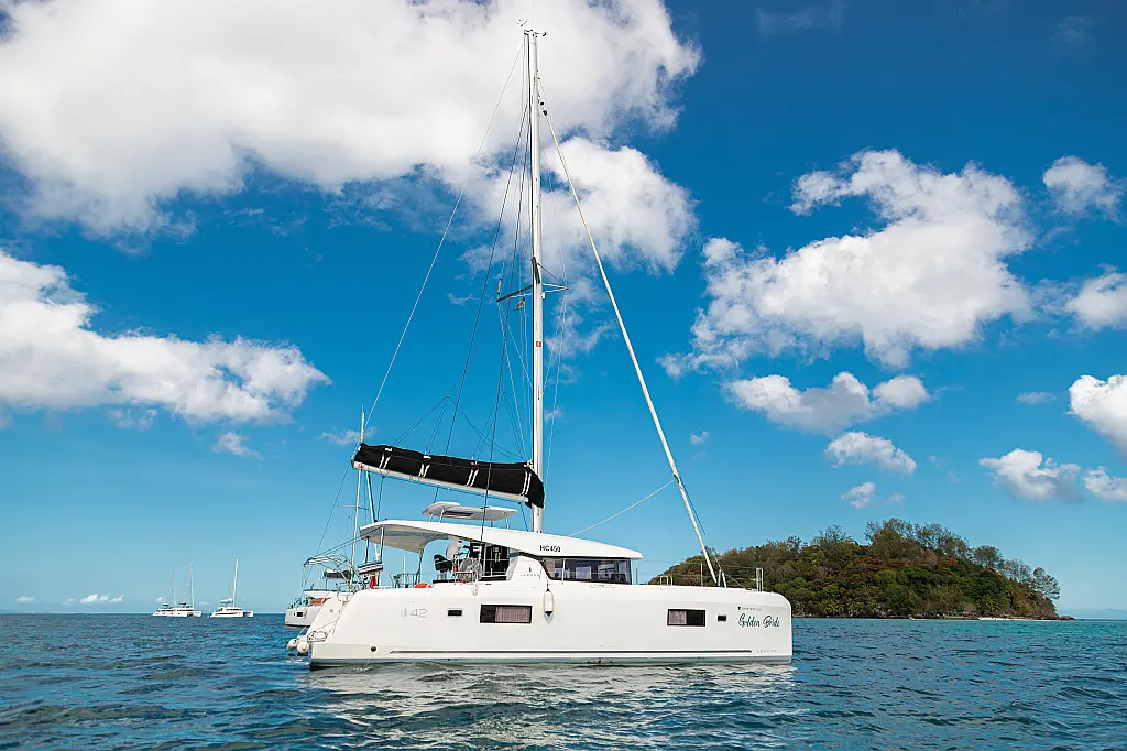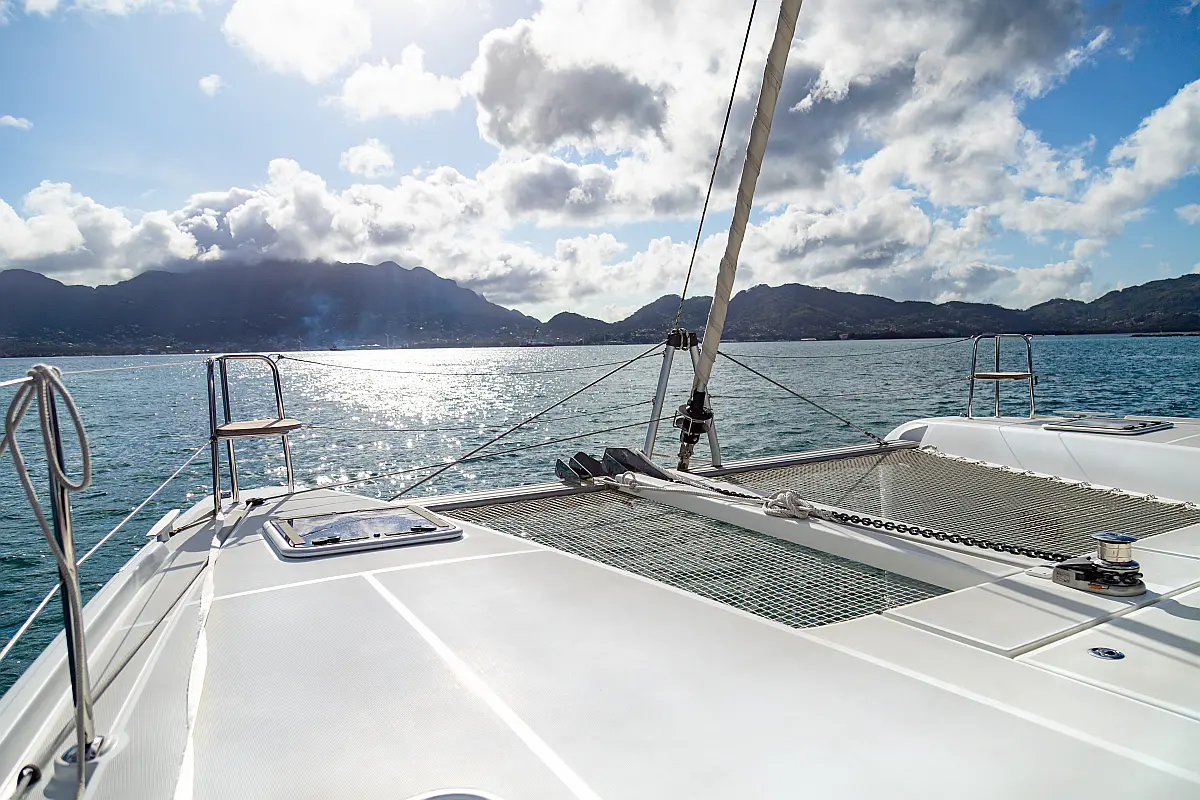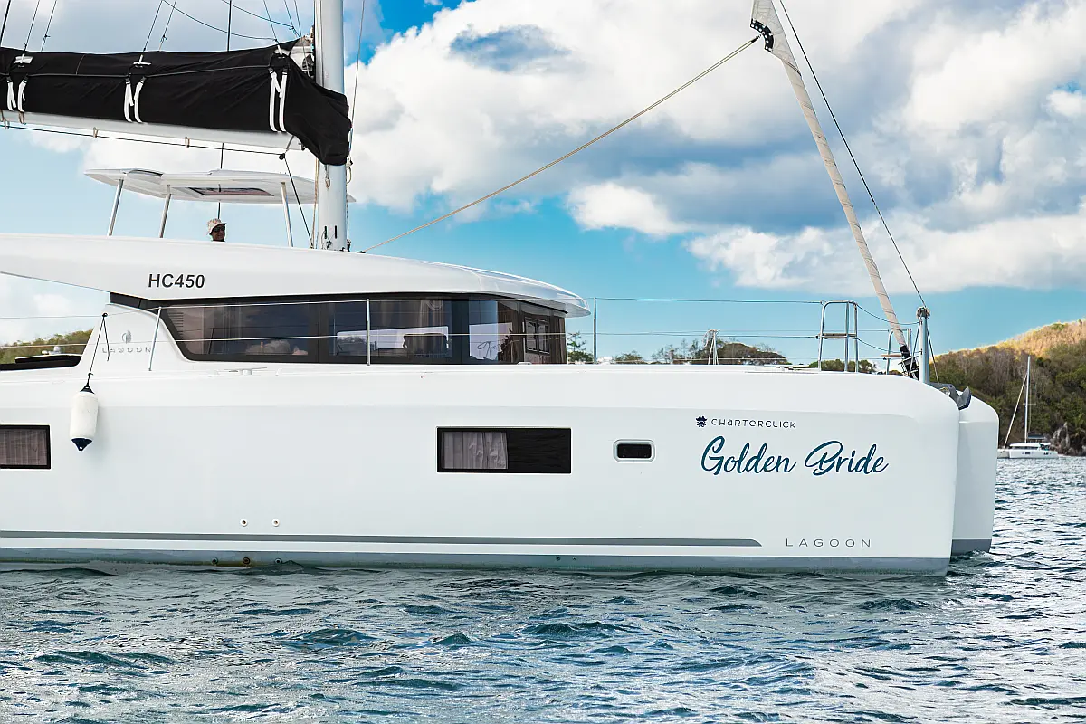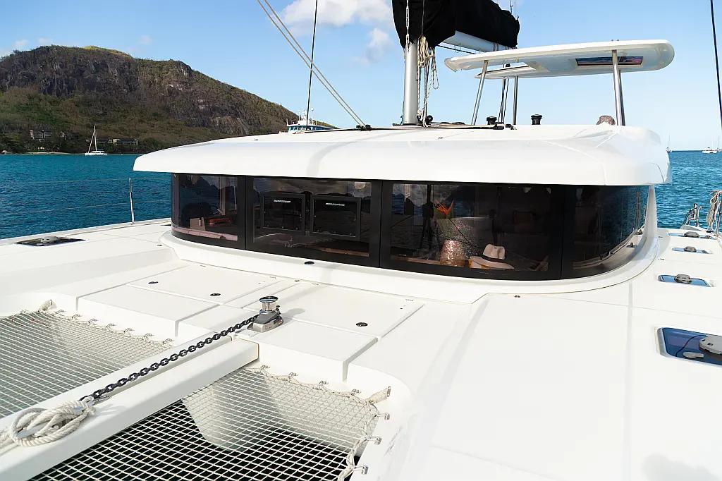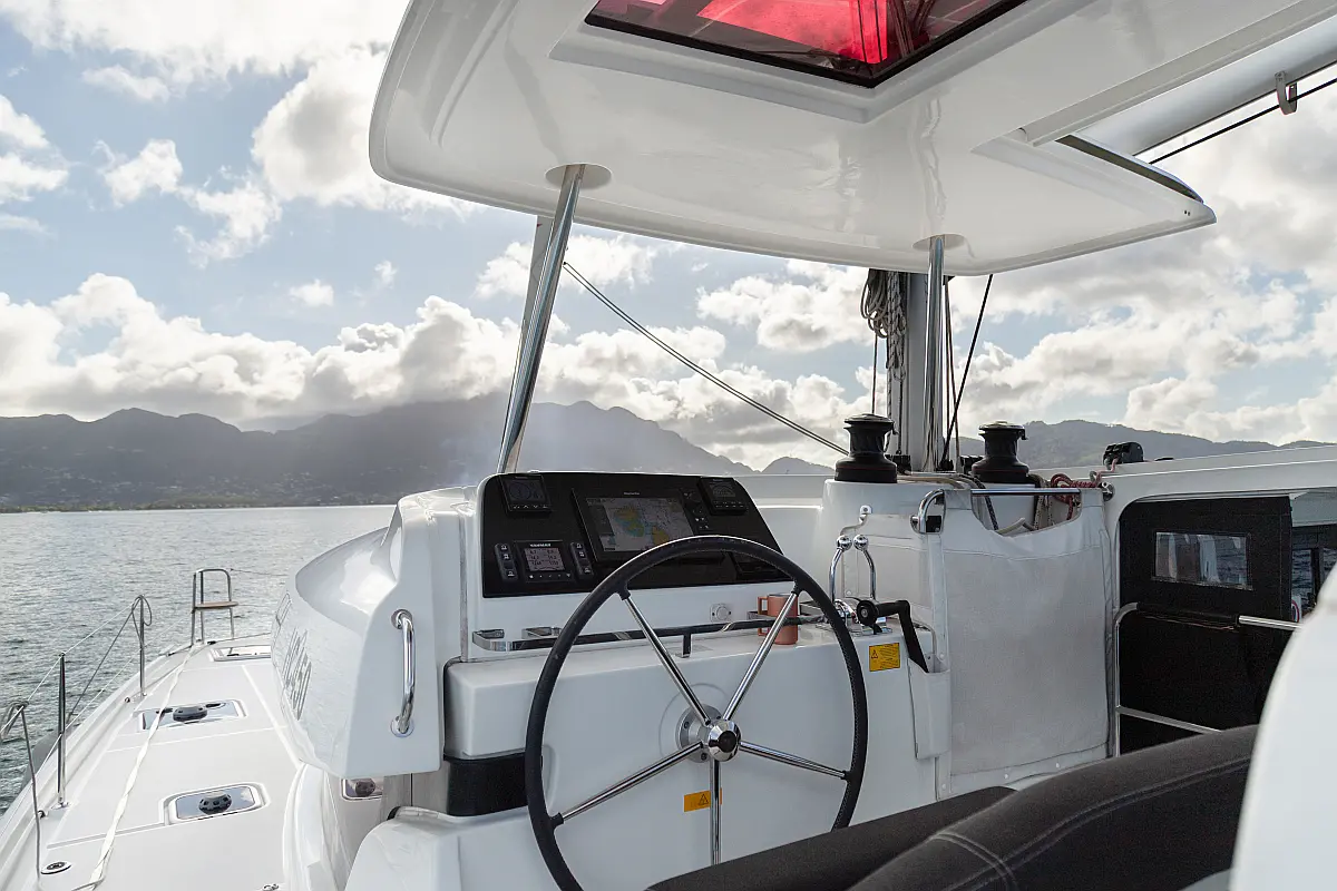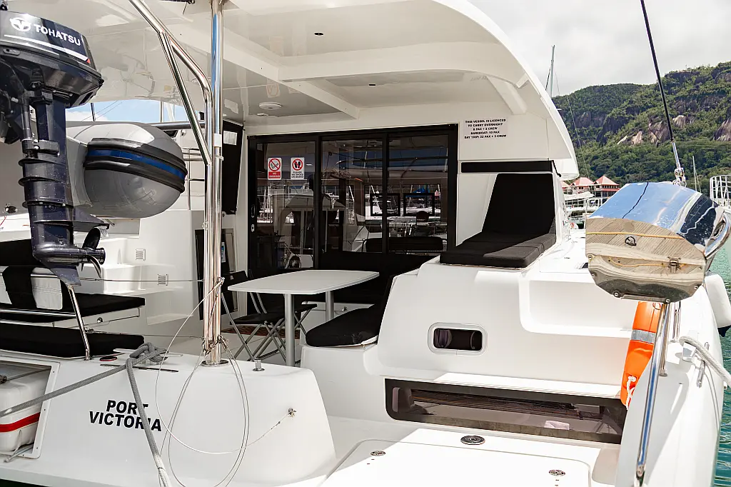 Bilge pump - mechanic, Hardtop, Dinghy with petrol engine, Boat hook, LED outdoor ambiance lights, Gangway, Spare anchor (Reserve, Auxiliary anchor), Spring cleats, Cockpit, Bosun's chair (Safe seat) (boatswain's chair), Flybridge, Jerry can for fuel, Fenders, Electric anchor windlass, Mooring cleats, Mooring ropes, Round/globular fender, Water hose, Winch handles, Sponge, Swimming ladder, Anchor with chain, Cockpit/stern, outside shower, Deck brush, Cockpit table, Cockpit cushions, Cockpit fridge, Deck lights