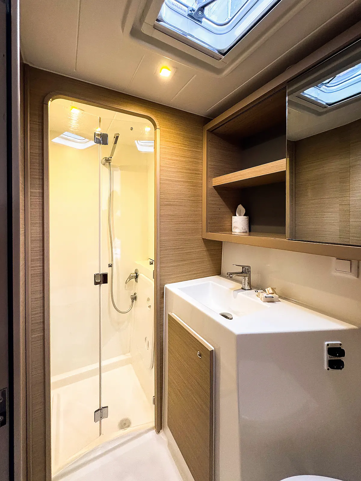 Aircon, raw water cooling pumps, Battery charger, Bilge pump - Electric, 220V sockets, Air condition, DSC station, Generator, Inverter, Motor hours counter, Start battery, Service batteries, Shore power cable, Watermaker - desalinator 100L/H, USB socket, WC pump, Water heater