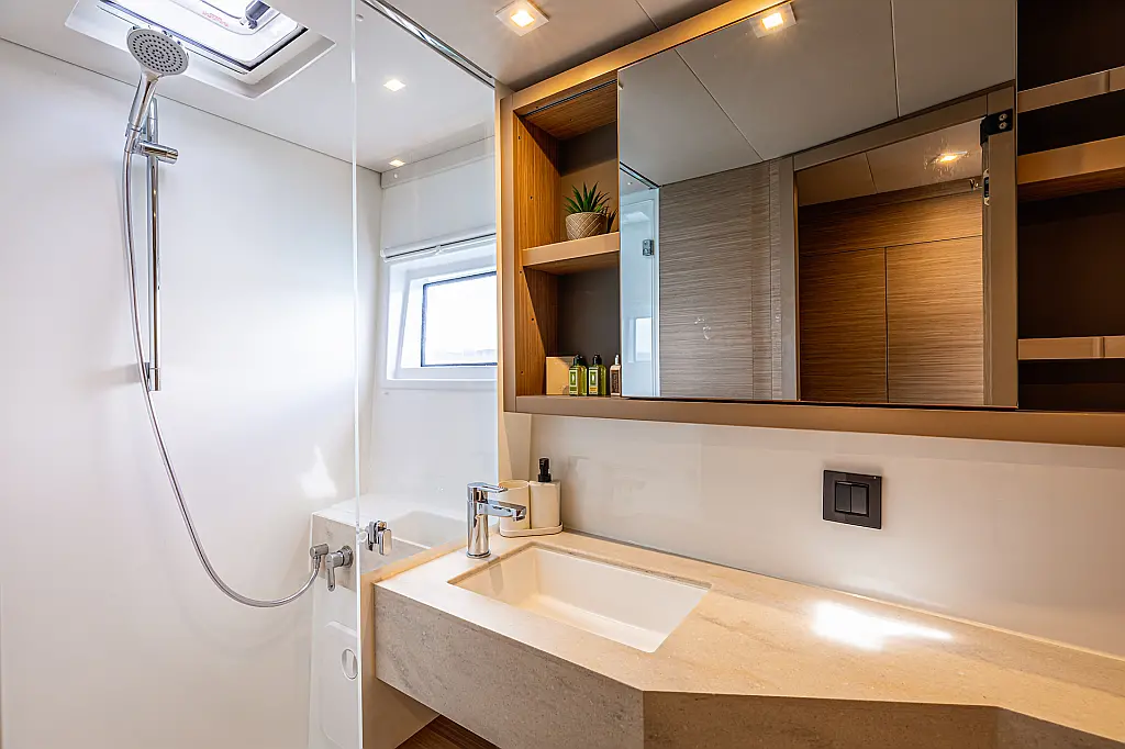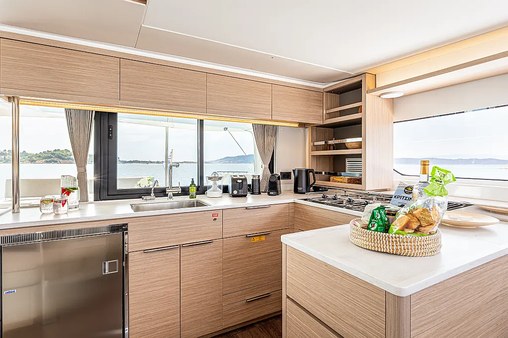 A/C, Teak Deck, Dinghy with outboard engine 10 hp, Bluetooth speakers/sound system connection, Smart TV, Generator, Fusion audio system, USB plugs, Espresso machine, Electric toilet, Hydraulic passarella, Hydraulic Platform (true), Inverter, Watermaker