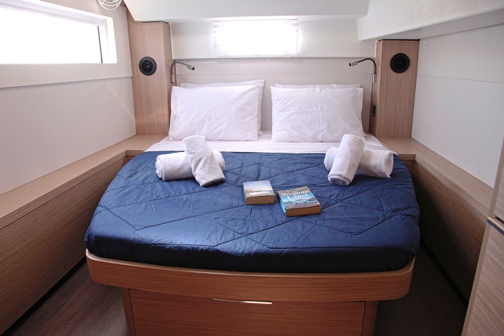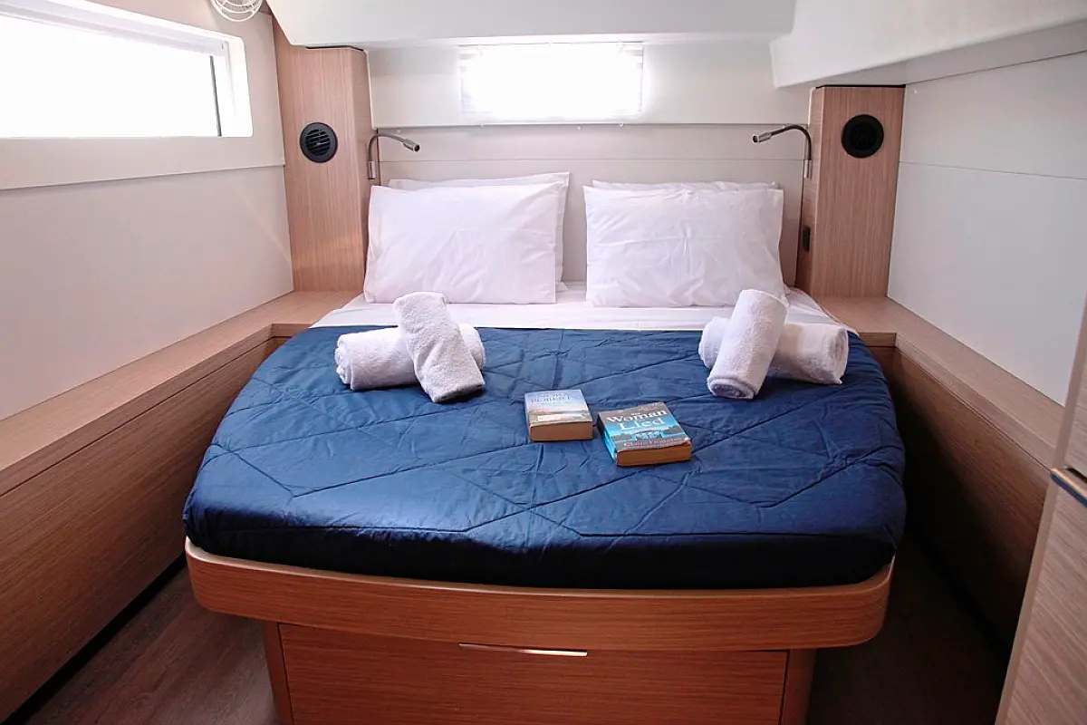 220 Volt sockets, Air Conditioning, Battery Charger, Berth in port bow comp. (1), Berth in starboard bow comp. (1), Convertible table in the saloon, Refrigerator (2), El. toilets (4), Fans in cabins/saloon, Freezer, Generator, Hot Water, Hydraulic gangway, Ice-maker, Inverter, Pax onboard (max) (12), Refrigerator in cockpit (80 lt), USB sockets in cabins (4), Water maker, WC/Shower+sink in port bow compartment (1), WC/Shower+sink in starb bow compartment (1), Additional Fridge (90 lt), Cushions, Holding tanks (4)