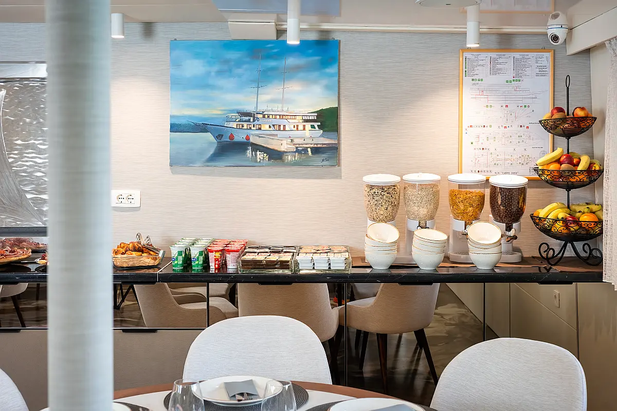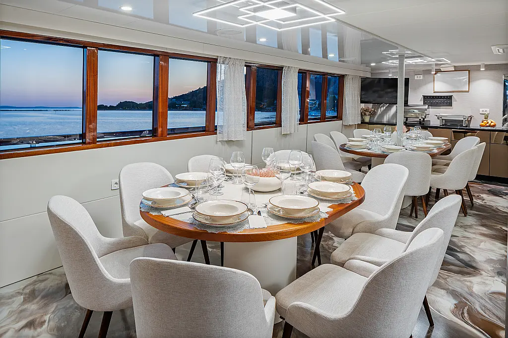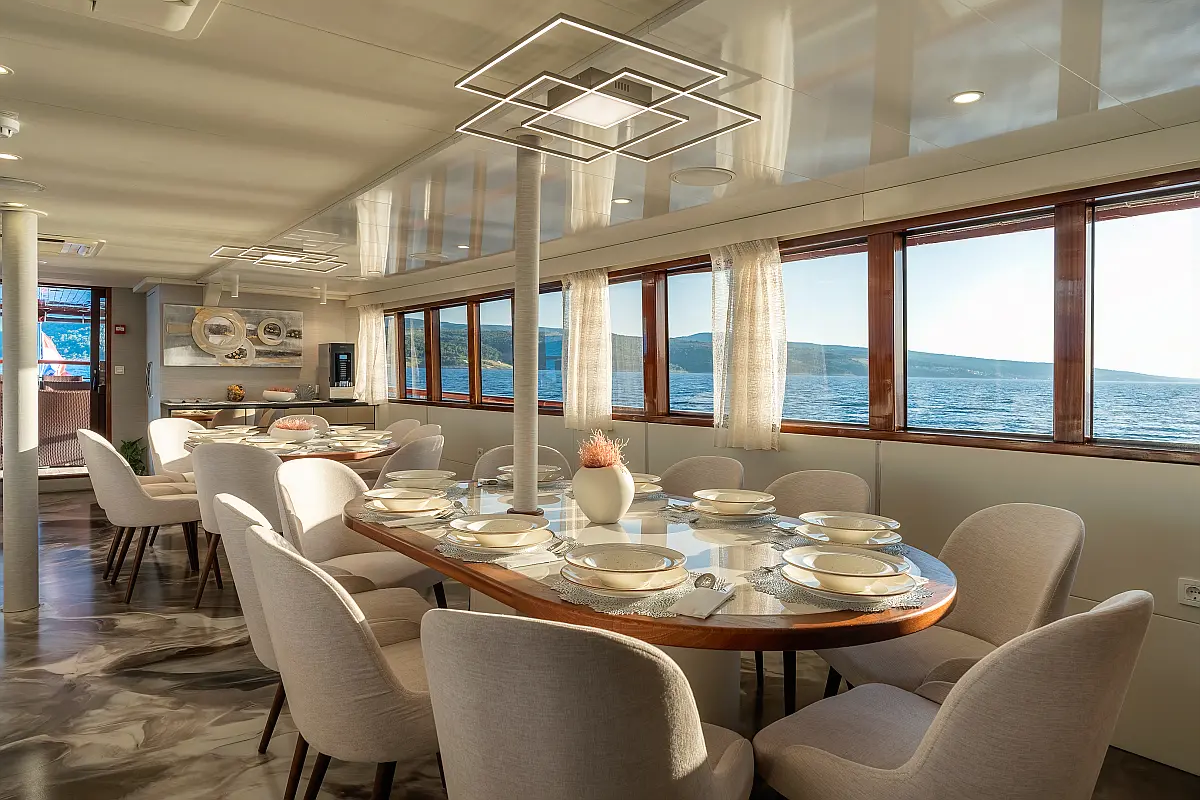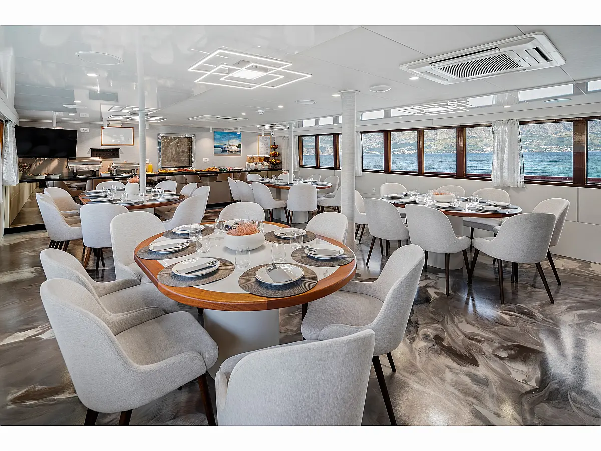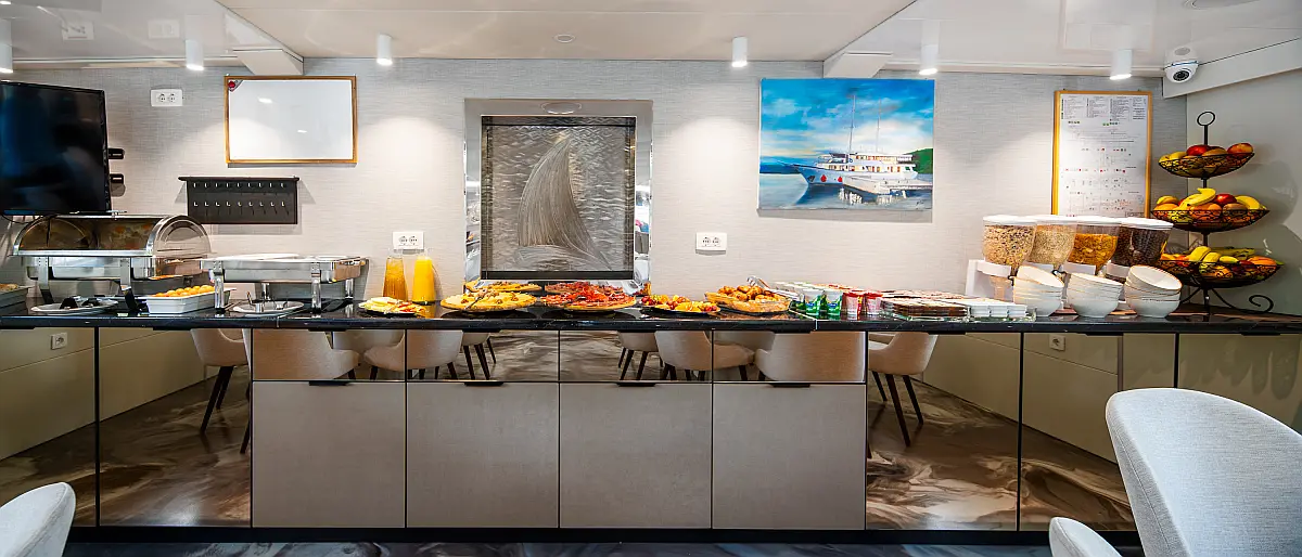 VHF radio, Compas, True heading autopilot, Samyung color radar, Echo sounder, Standard solas navigation lights, Two horseshoe bouys with warning lights, Solar life jackets for each passenger, Automatic inflatable liferaft for 50 people, Central alarm for fire equipment, Smoke detectors in each cabin, Portable fire extinguishers for corridors and salon, Fire extinguishers in the engine using aerosol