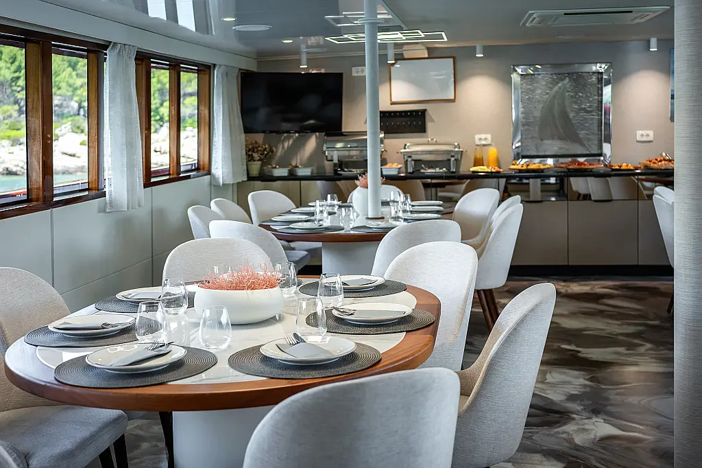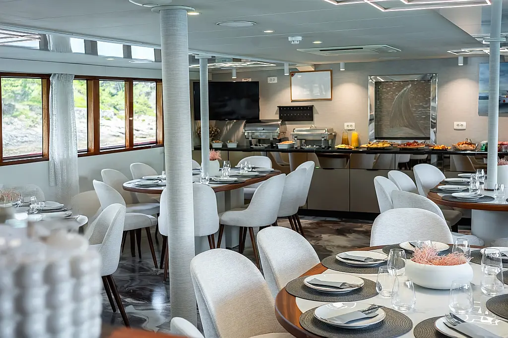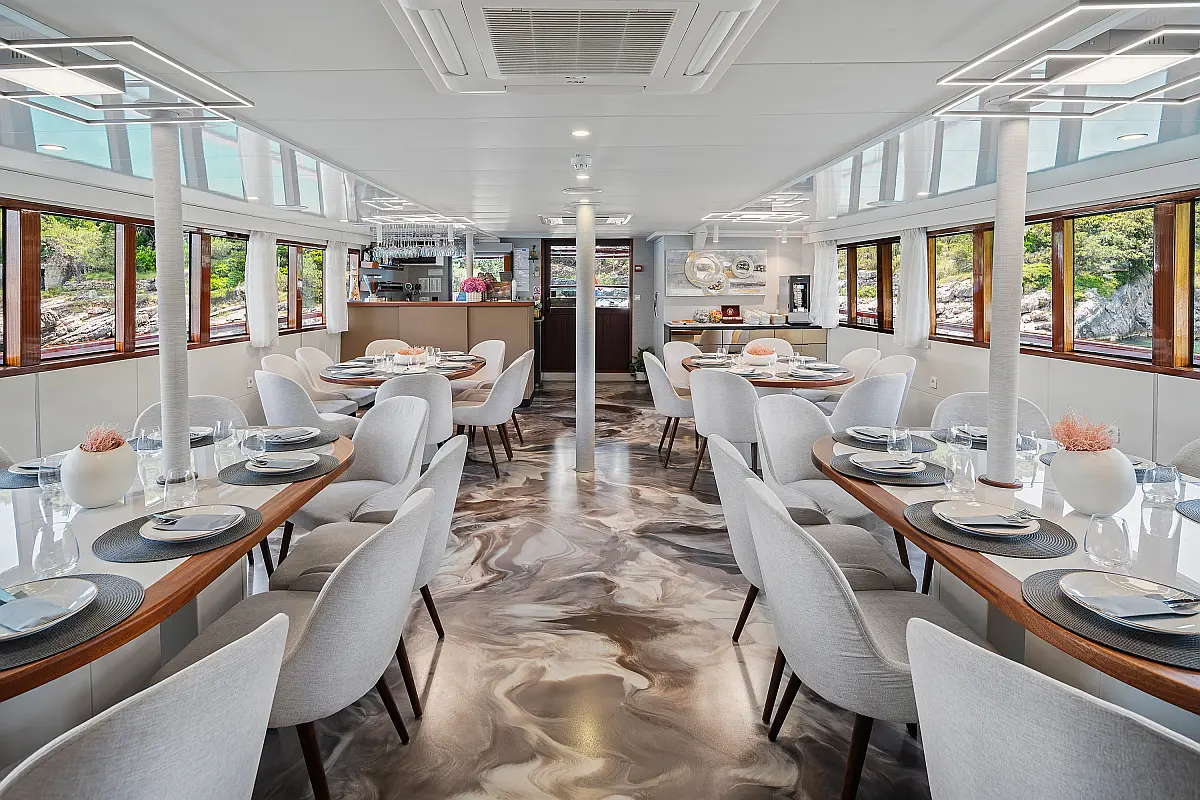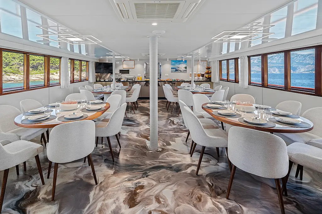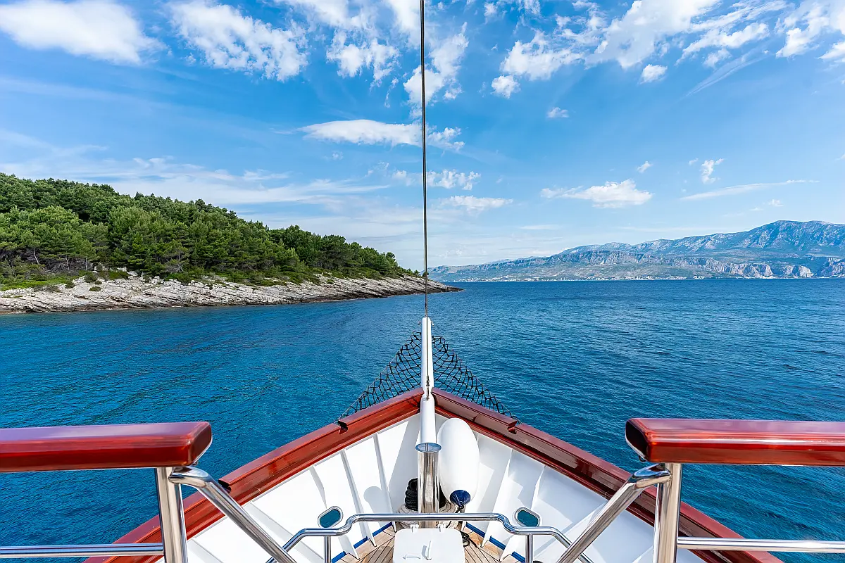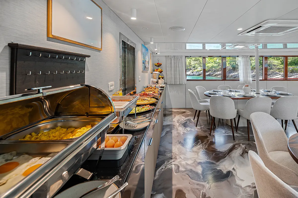 VHF radio, Compas, True heading autopilot, Samyung color radar, Echo sounder, Standard solas navigation lights, Two horseshoe bouys with warning lights, Solar life jackets for each passenger, Automatic inflatable liferaft for 50 people, Central alarm for fire equipment, Smoke detectors in each cabin, Portable fire extinguishers for corridors and salon, Fire extinguishers in the engine using aerosol