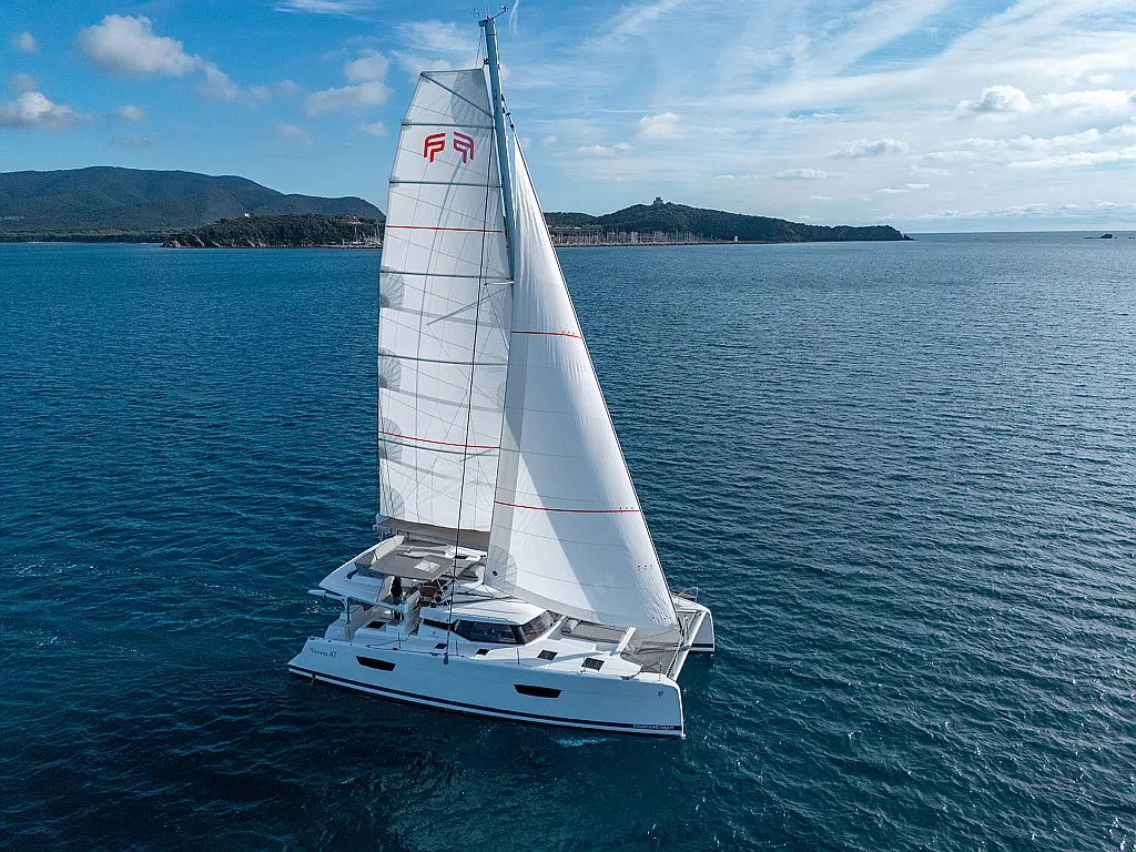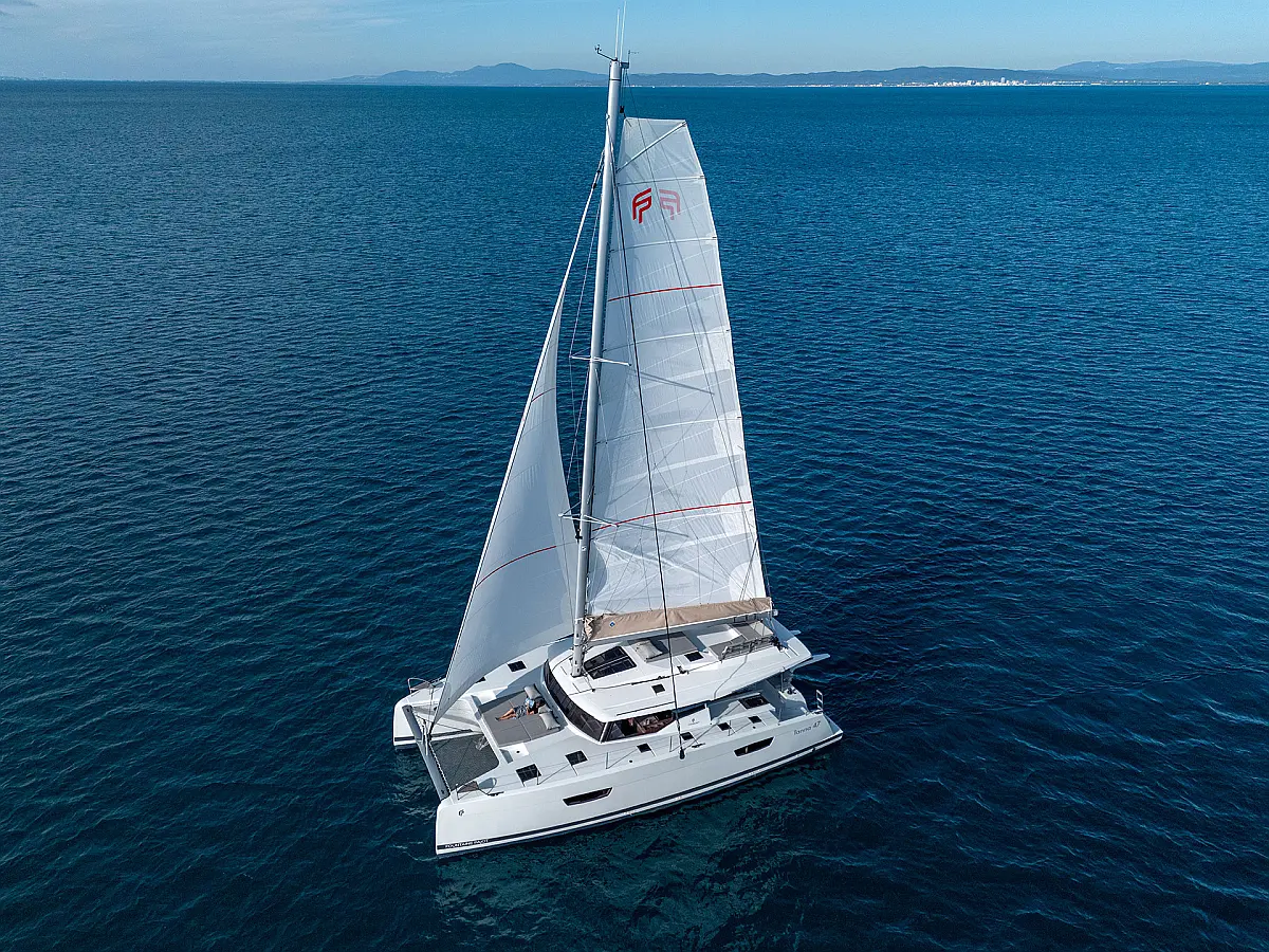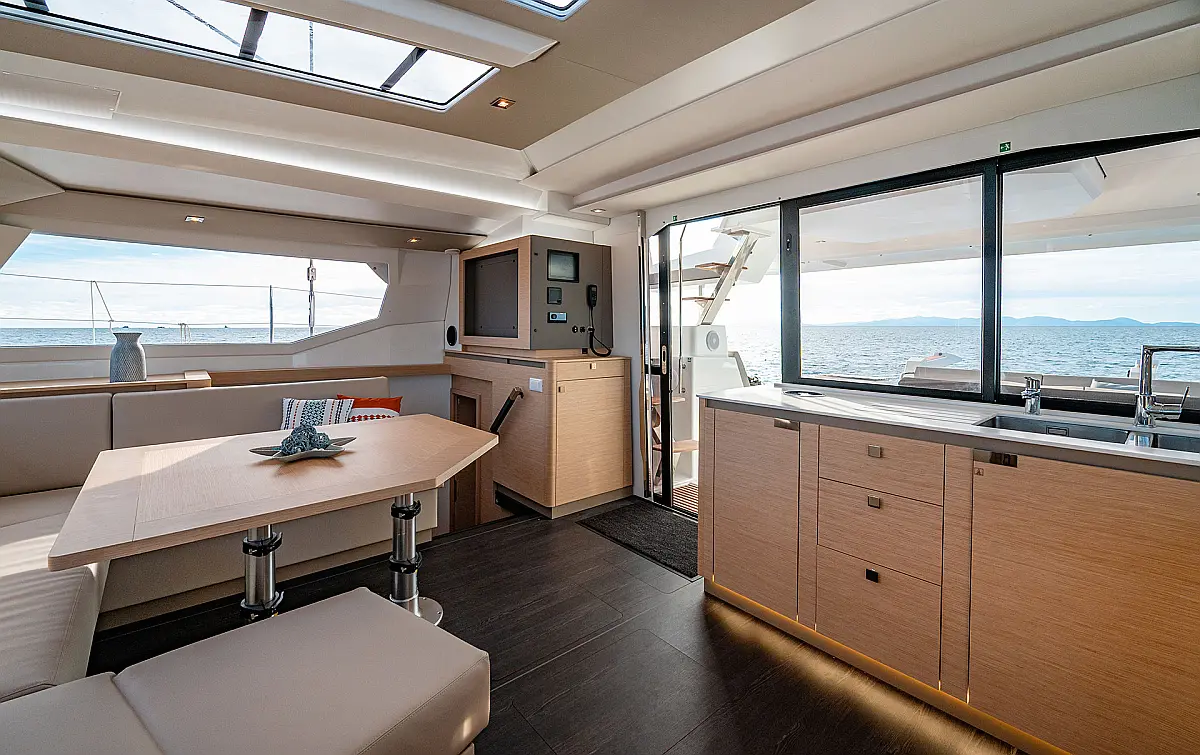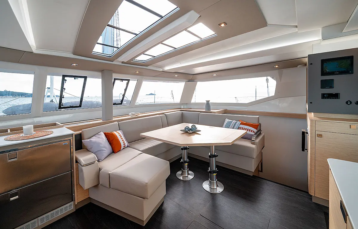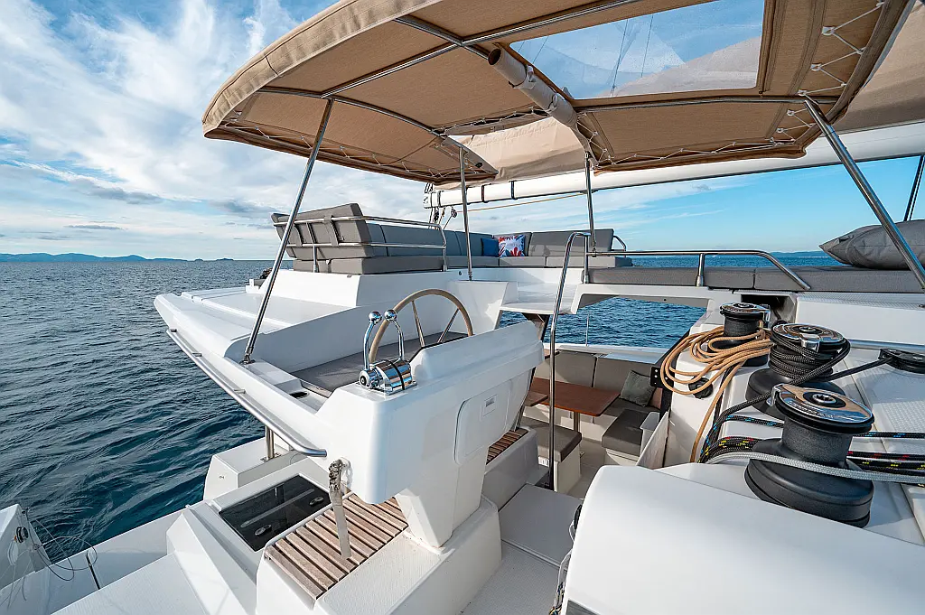 Air conditioning, Autopilot, Battened Mainsail, Bimini top, Eco/Log/Speedometer, Electric toilets, Electric winch for mainsail halyard, Electric windlass, External shower, Fridge and freezer, Furling Self-tacking Jib, GPS plotter, Generator, Flybridge table, Tender, VHF, Wind instruments