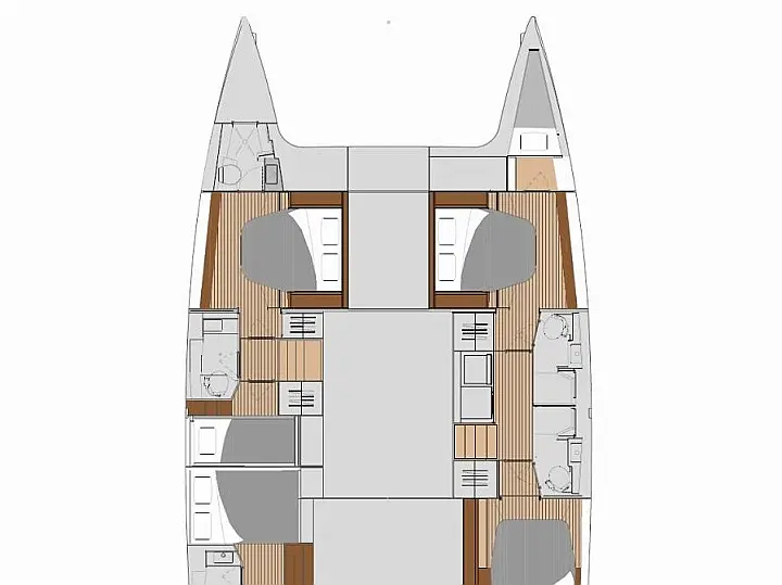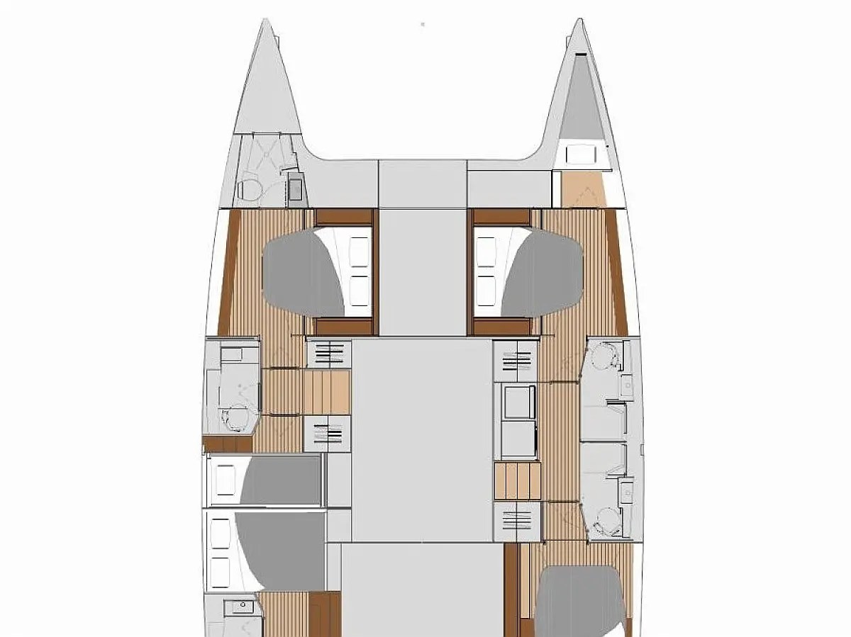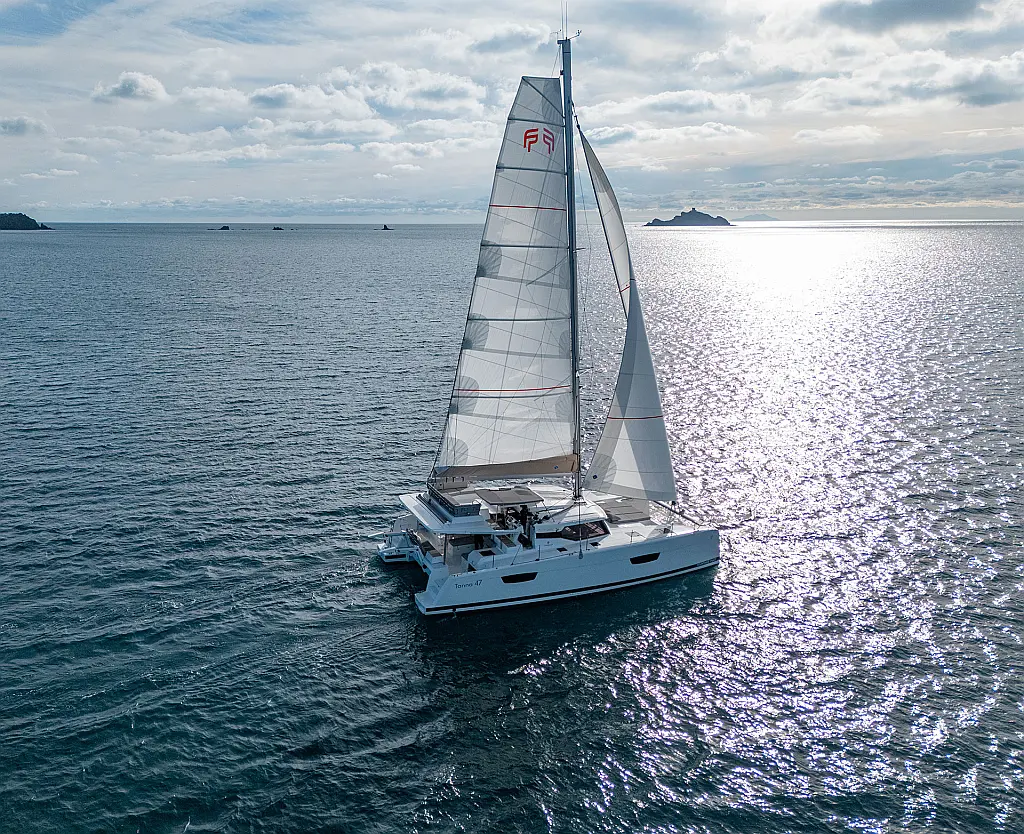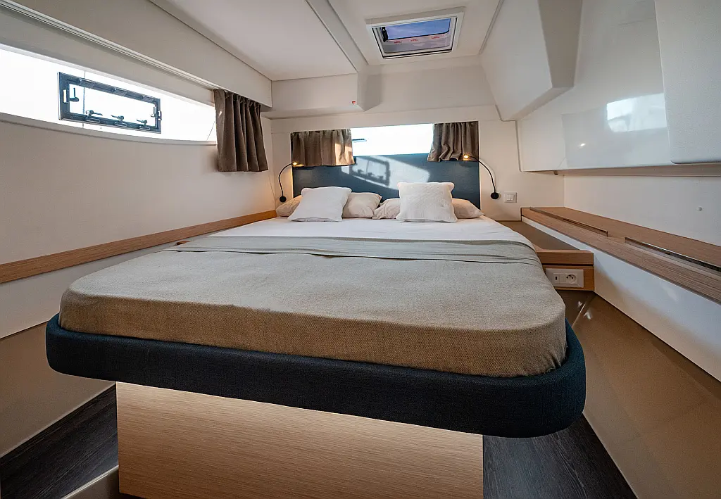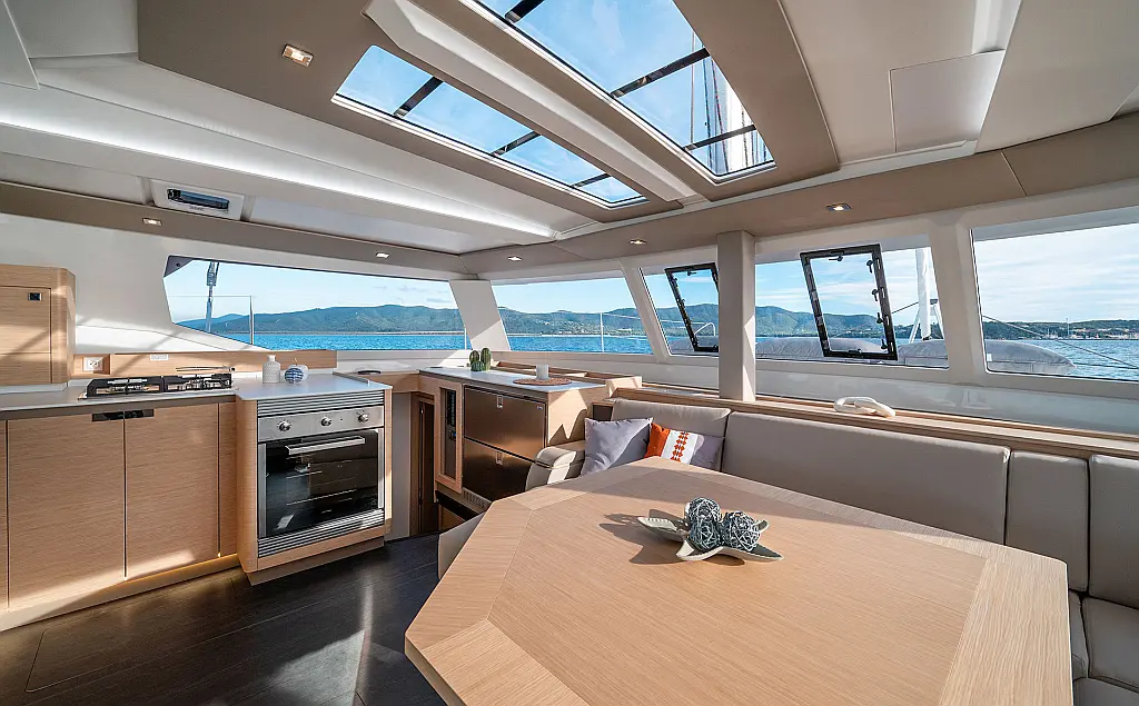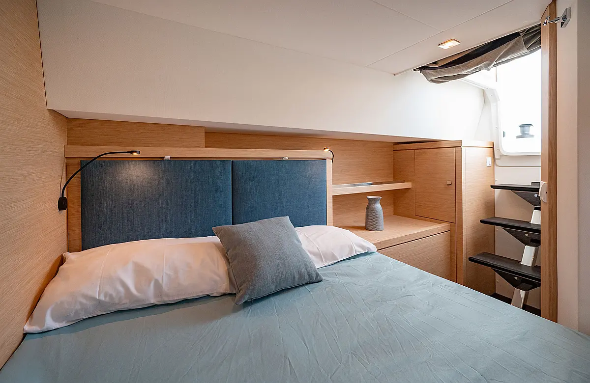 Air conditioning, Autopilot, Battened Mainsail, Bimini top, Eco/Log/Speedometer, Electric toilets, Electric winch for mainsail halyard, Electric windlass, External shower, Fridge and freezer, Furling Self-tacking Jib, GPS plotter, Generator, Flybridge table, Tender, VHF, Wind instruments