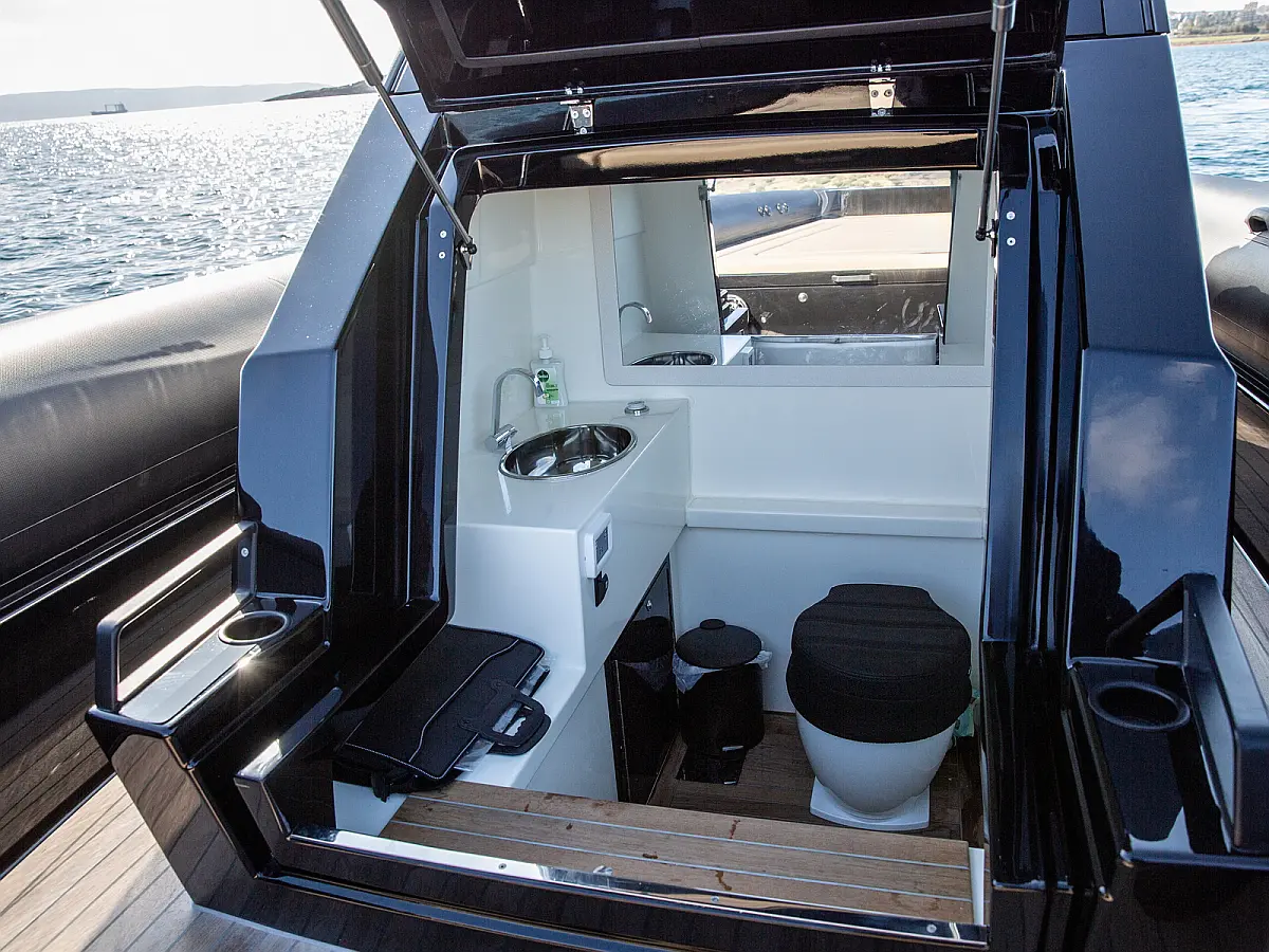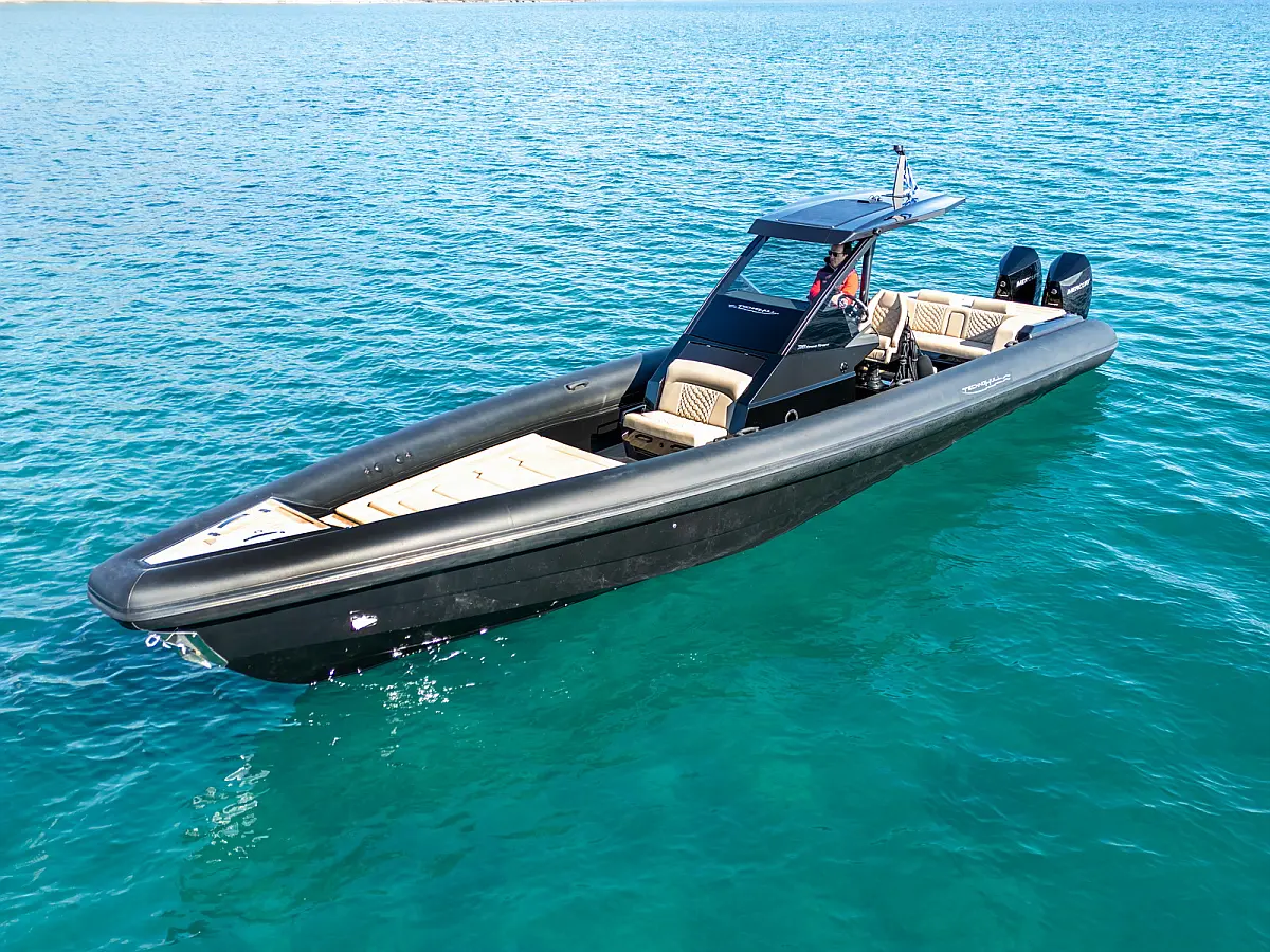 Electric windlass with counter, Dinghy, Fenders, 220V shore power cable, Anchor, Boat hook, Bimini top, Removable teak table with carbon pole, Cabin set up in bow area, Carbon Hard top with full glass and wiper, Sun tent with Poles and 3 side protection tents, Swimming Ladder, Shower on deck, Helmsman seat