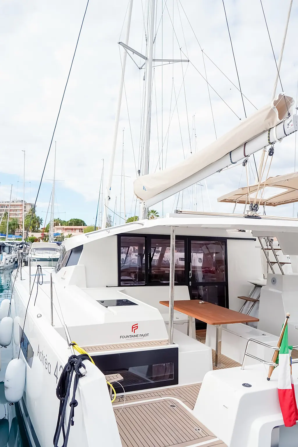 A/C, Lazy bag + lazy jacks, generator, Inverter, watermaker, Holding tank, Electric windlass, External shower, Teak in cockpit, WC electric, Loudspeakers in cockpit, Electric winches, Coffee machine