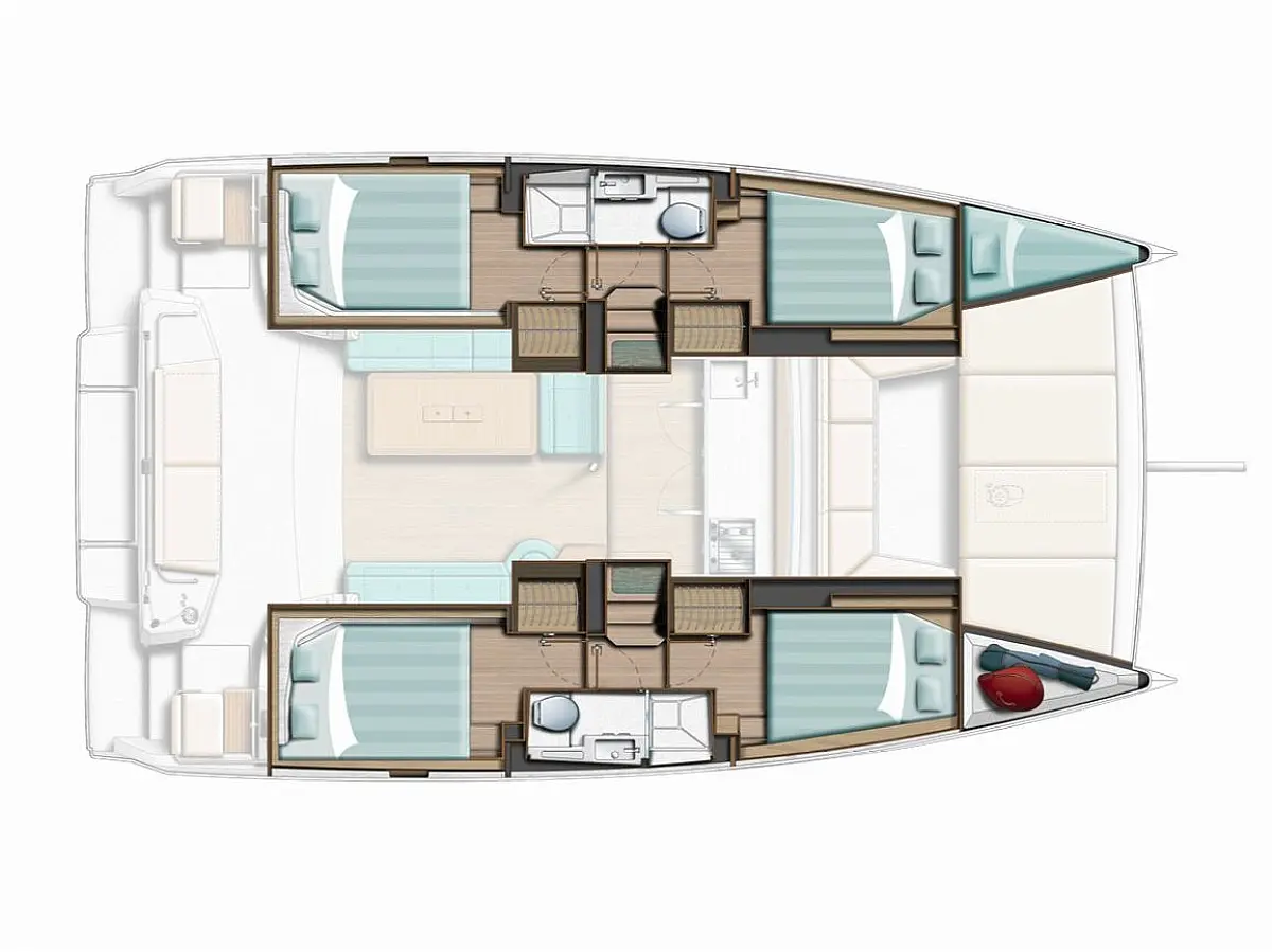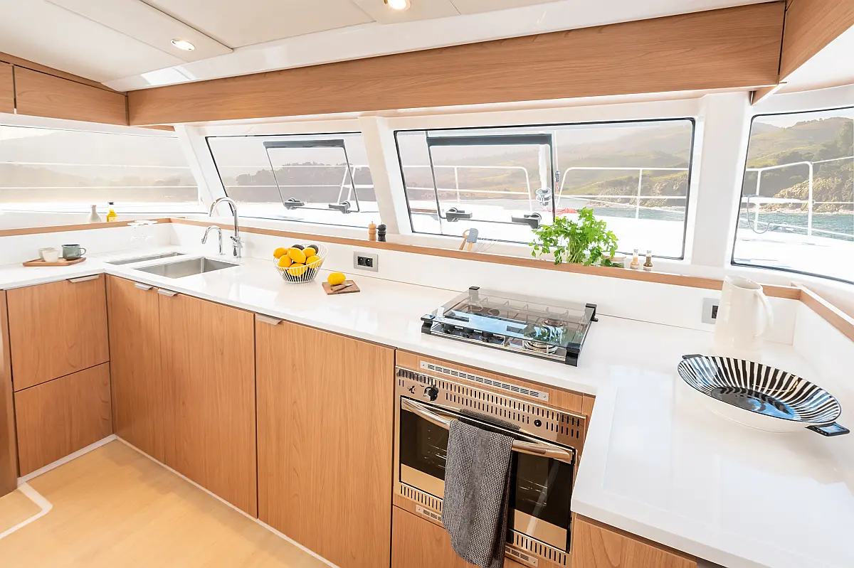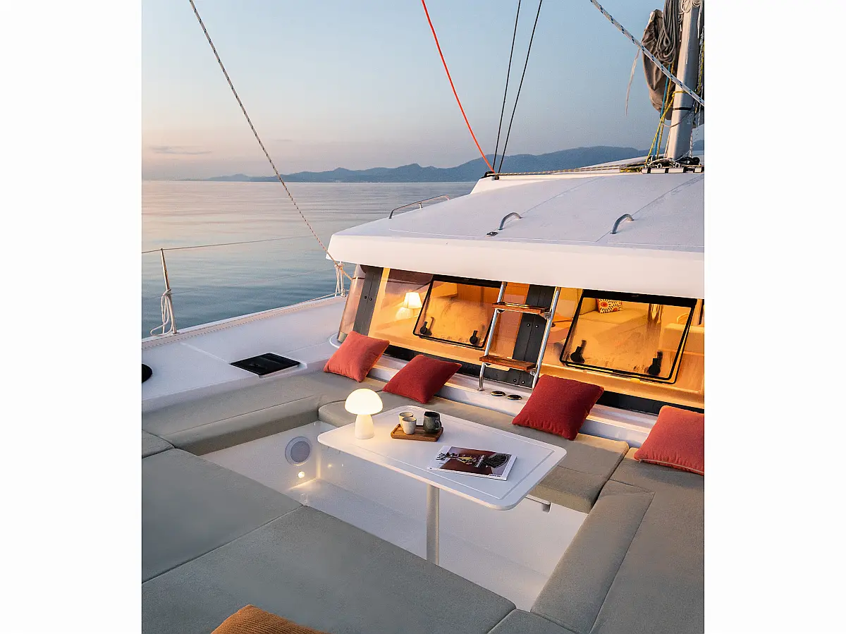 Barbecue and sink in the stern, Cockpit speakers, Dinghy with outbord engine, Electric windlass, Fans in cabins and lounge, Freezer, Navigation lights, Skipper beds on starboard, VHF-GPS chartplotter, Watermaker, second refrigerator on board, Inverter