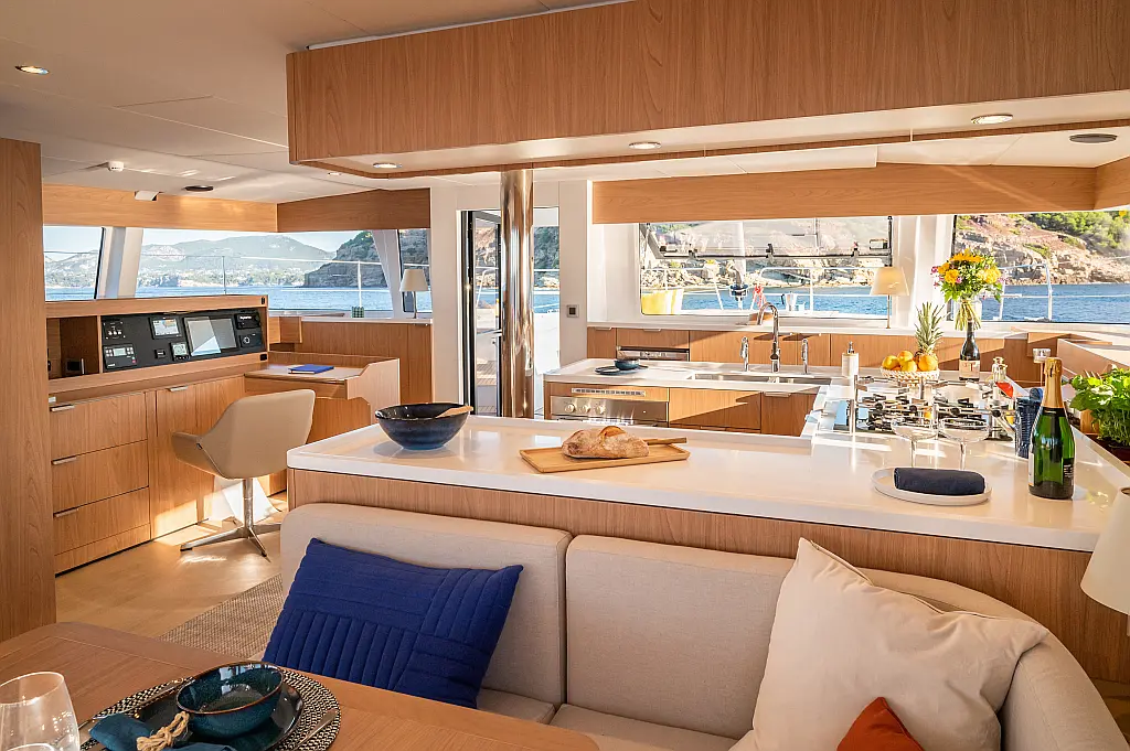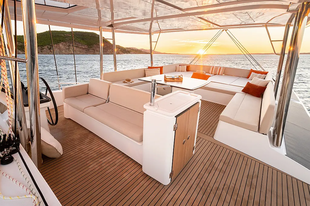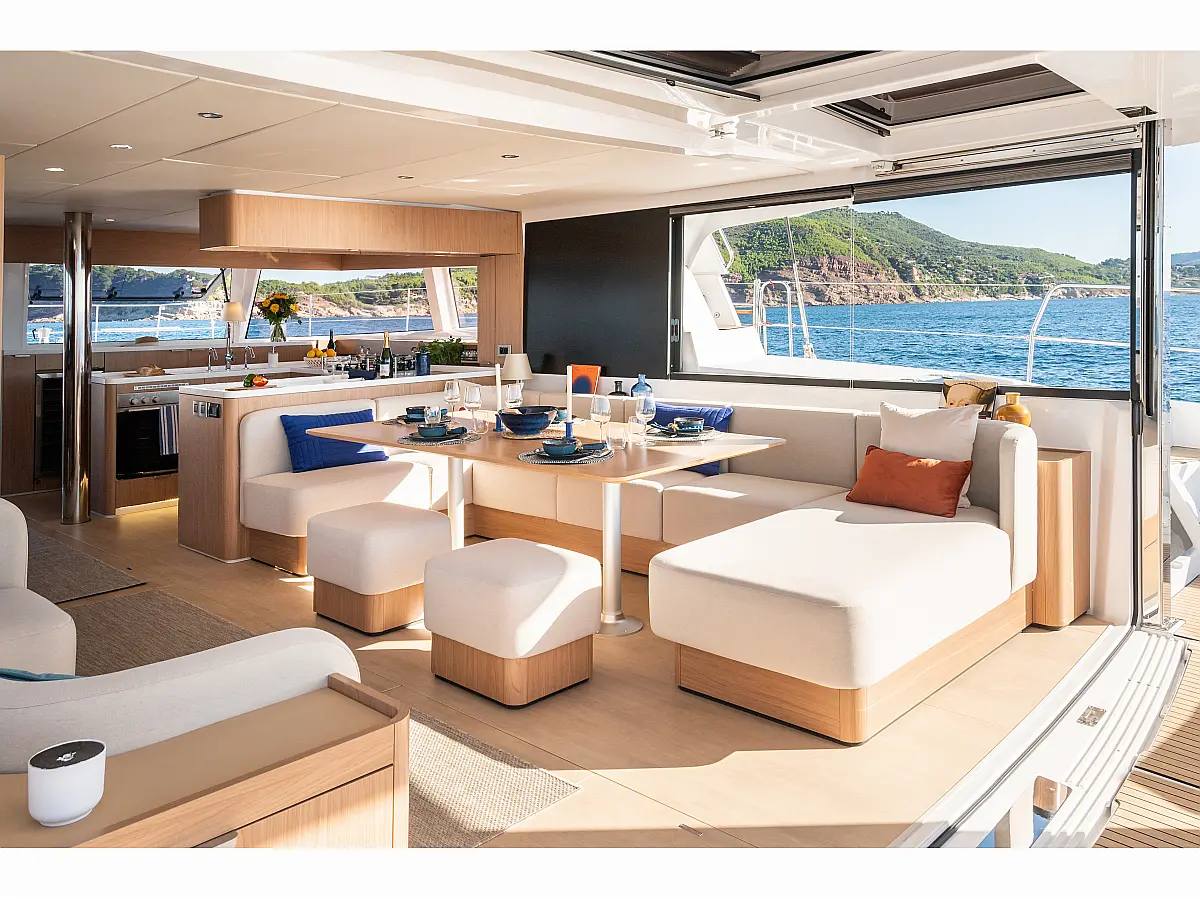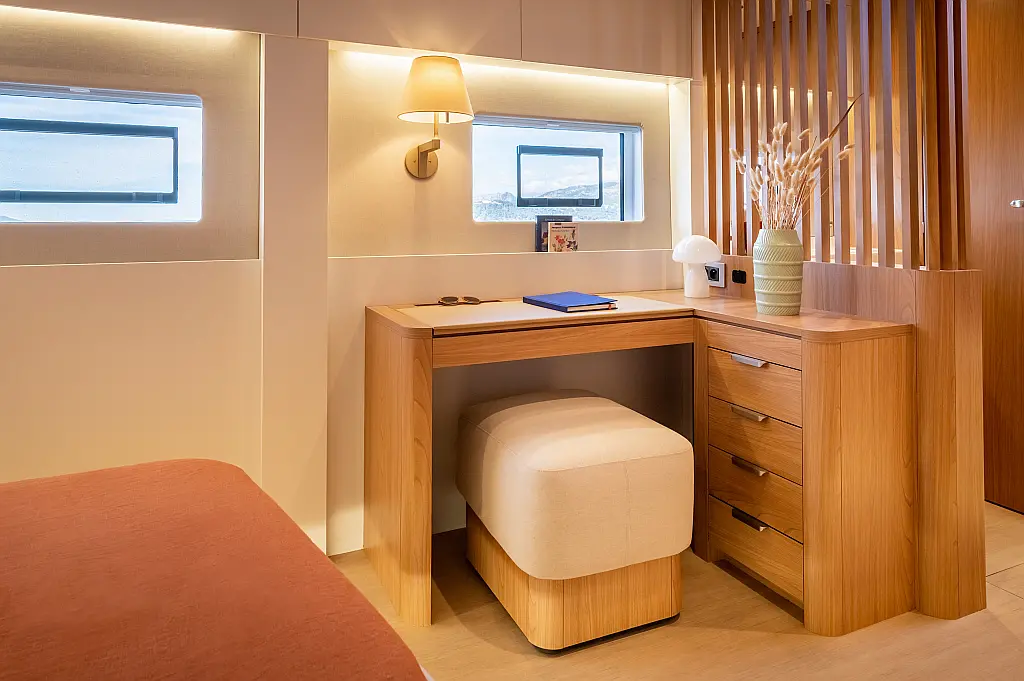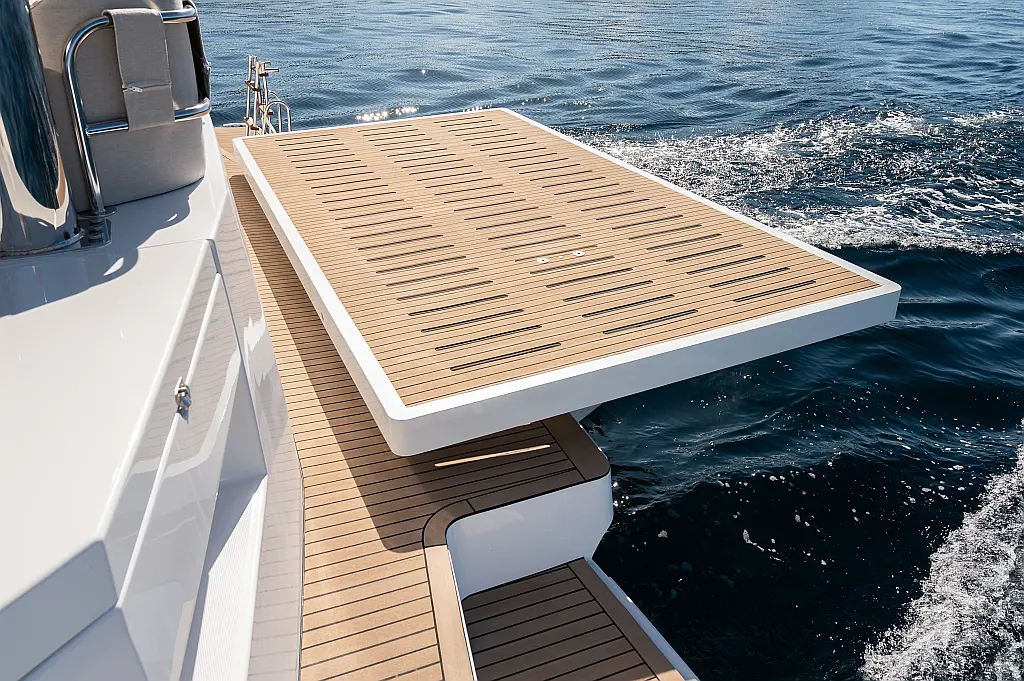 Inverter, Frigorifero, Cuscini in pozzetto, WC elettrico, Dissalatore, Macchina del ghiaccio, Pannelli solari, Altoparlanti in pozzetto, Aria condizionata, Verricelli elettrici, Ponte in Teak