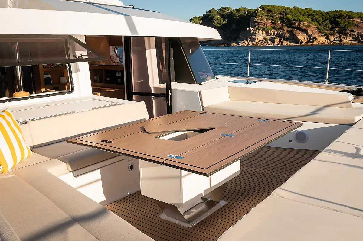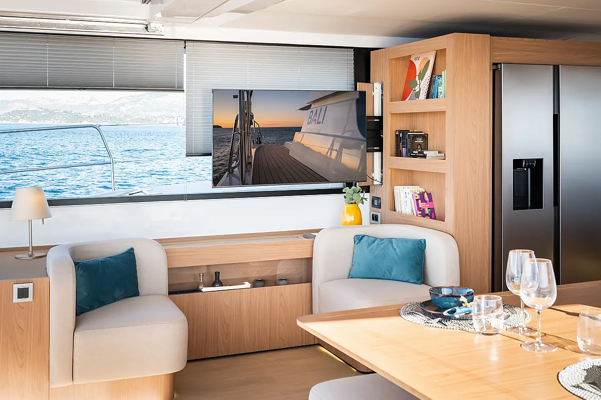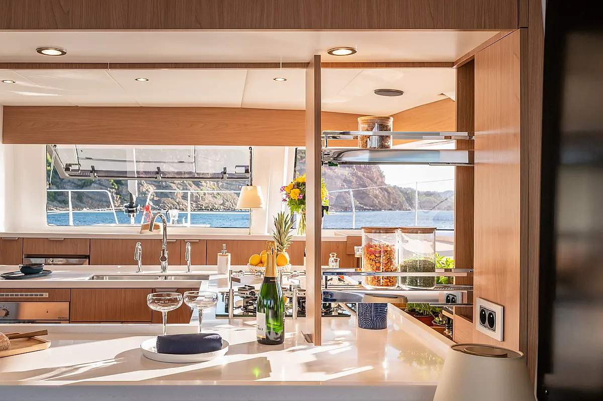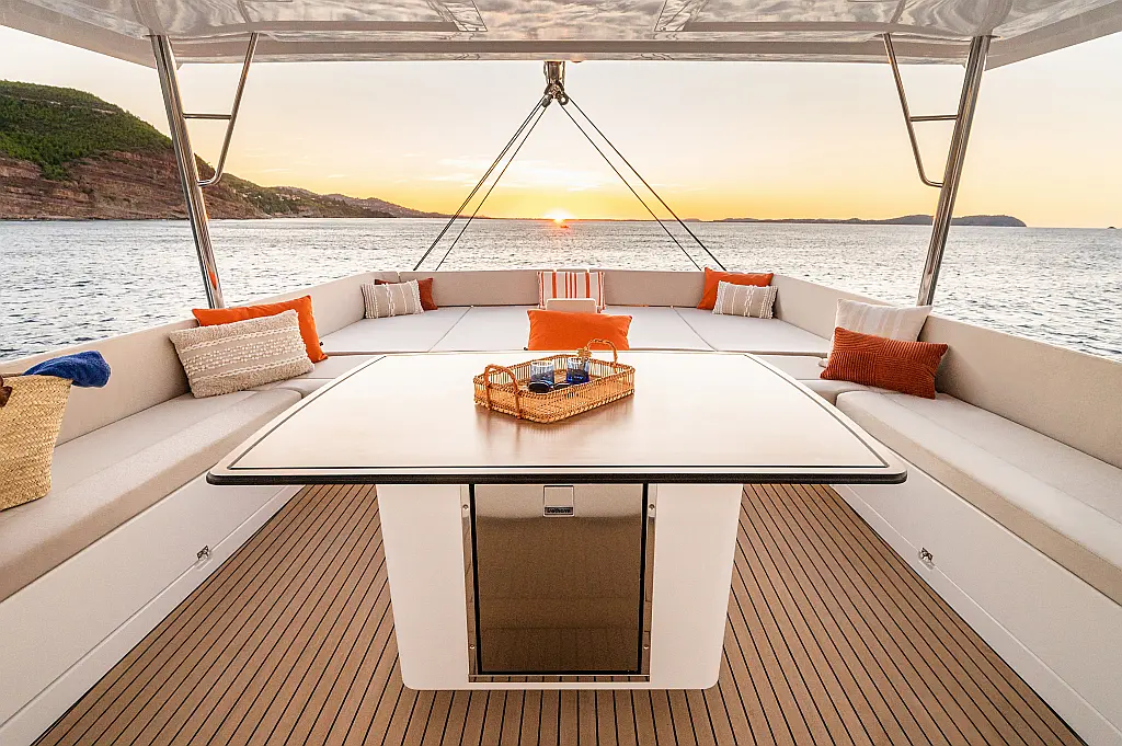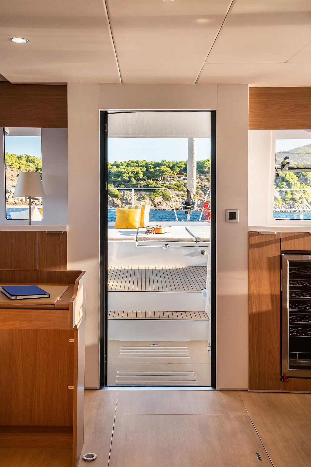 Inverter, Frigorifero, Cuscini in pozzetto, WC elettrico, Dissalatore, Macchina del ghiaccio, Pannelli solari, Altoparlanti in pozzetto, Aria condizionata, Verricelli elettrici, Ponte in Teak