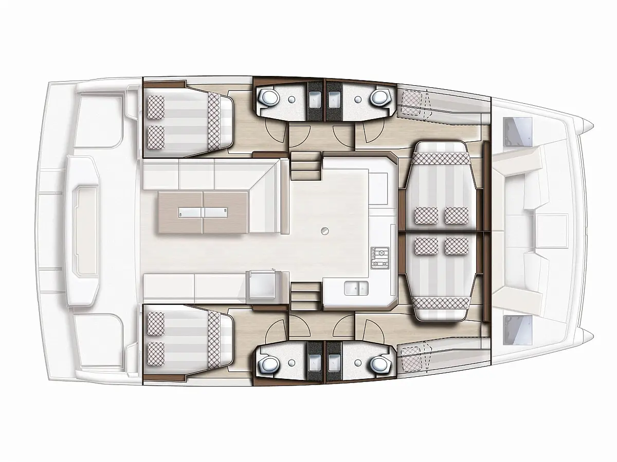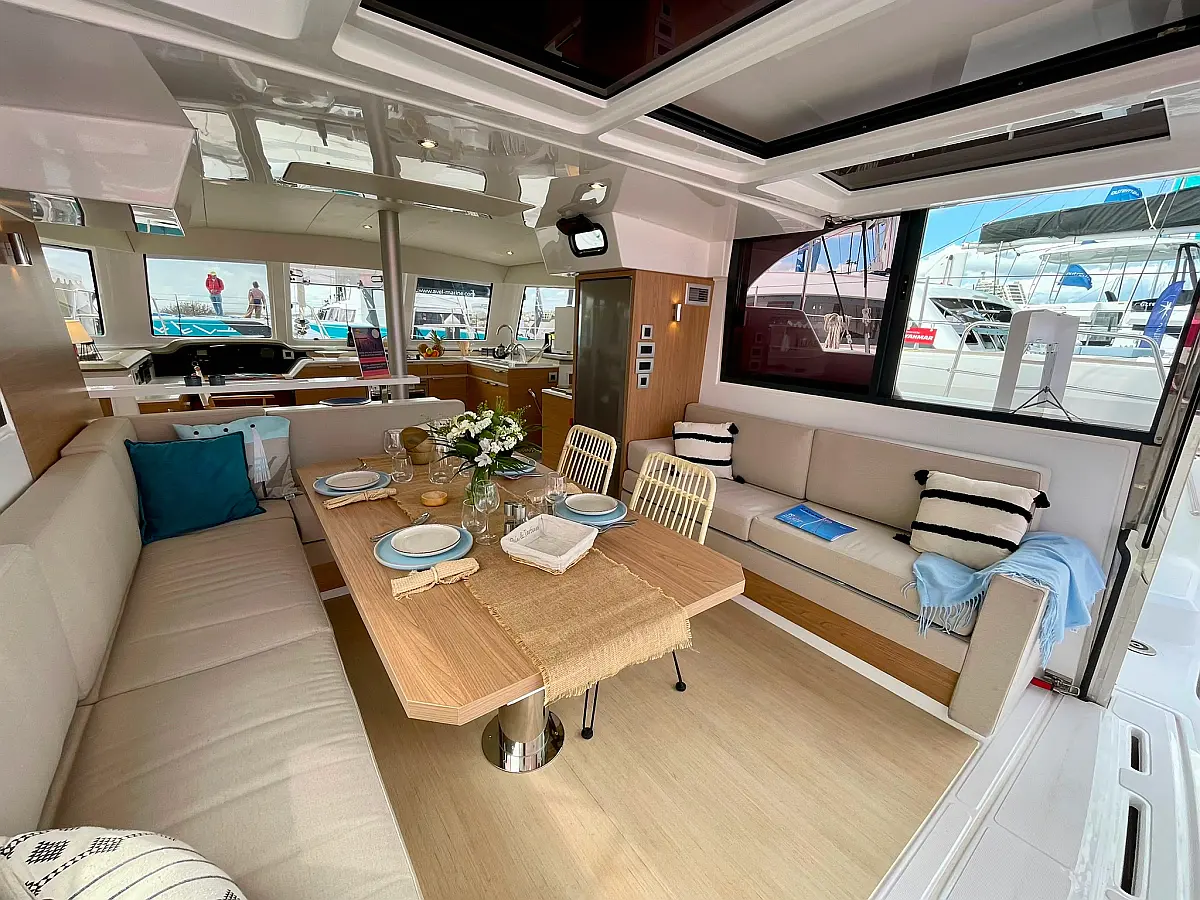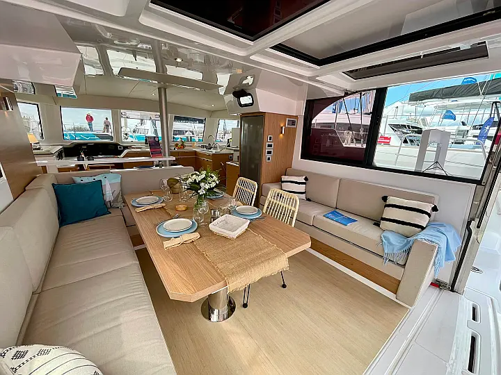 Fridge, Freezer, Electric winch, Electric windlass, Cockpit cushions, Autopilot, Chart plotter, VHF, 12V/230V converter, Fresh water purifier filter, 12V - 130 amp gel service batteries, Gas oven, Swim ladder, Cockpit shower, Safety equipment, Watermaker 65L/h, Solar pannels, Air condition, Plancha, Genset
