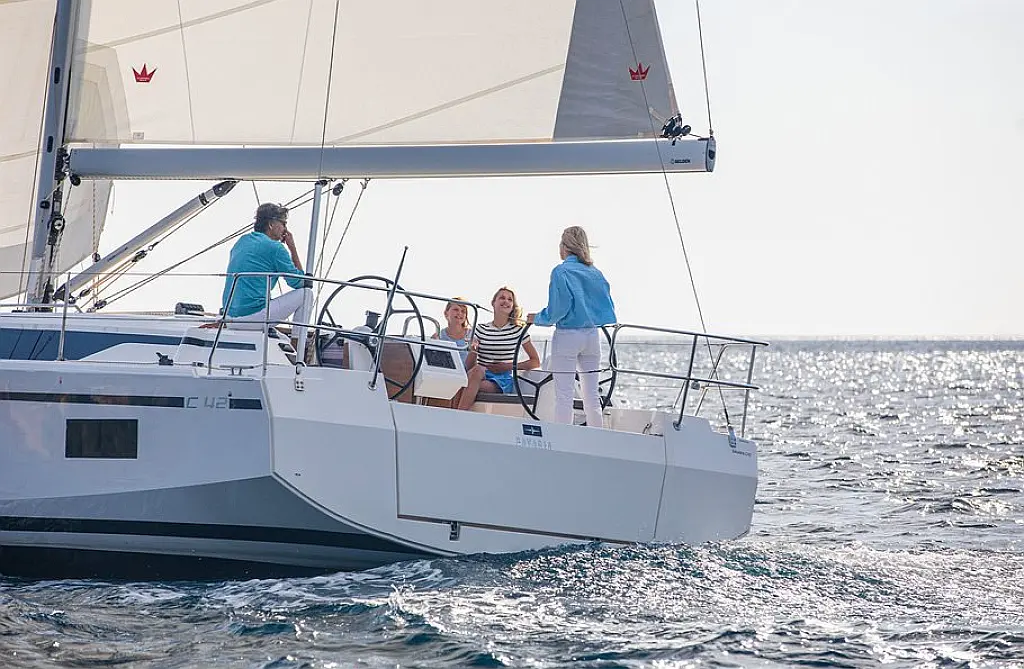 Anchor, Bimini top, Cockpit/stern, outside shower, Deck brush, Dinghy, Electric anchor windlass, Fenders, Folding cockpit table, Plastic bucket, Sprayhood