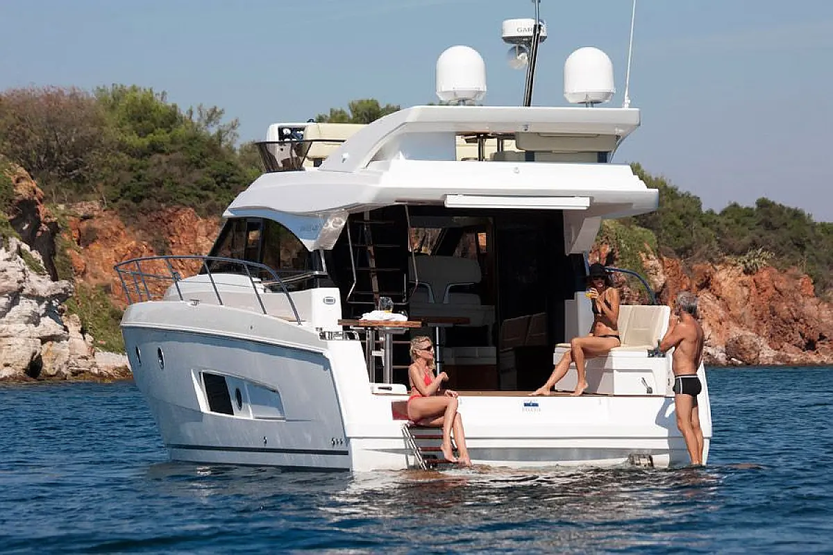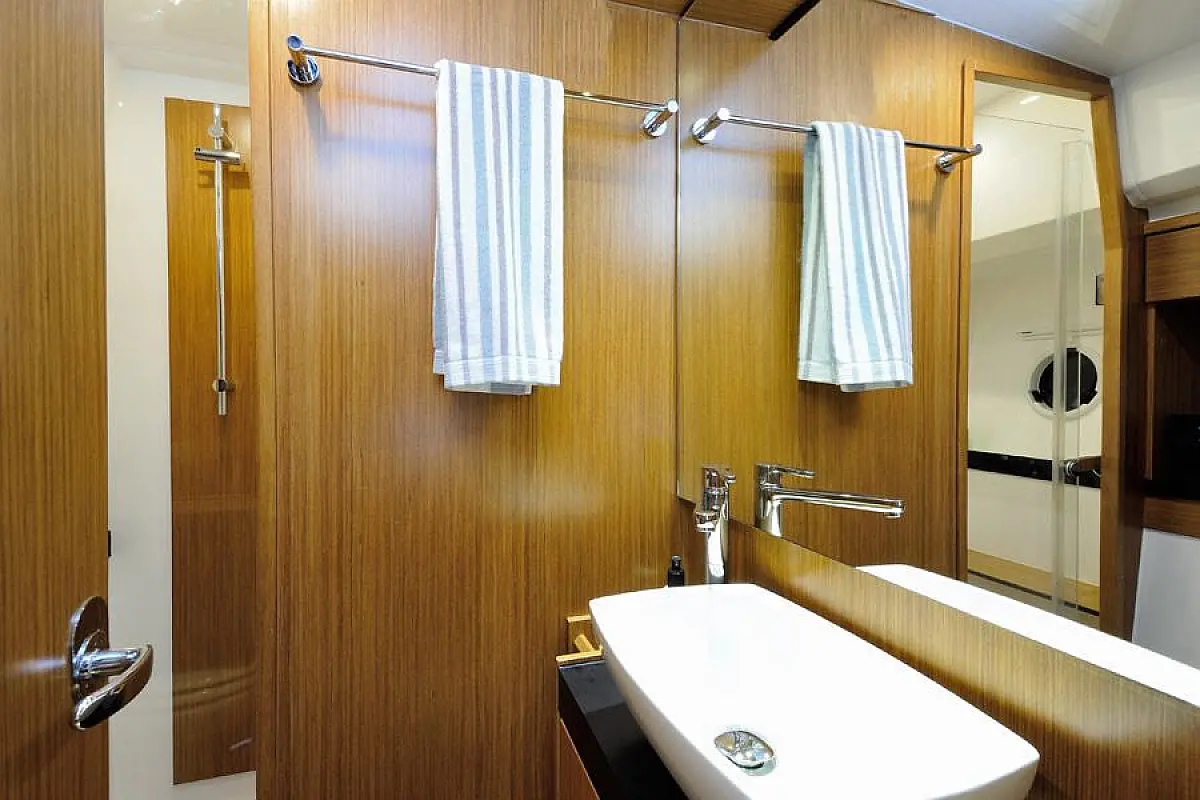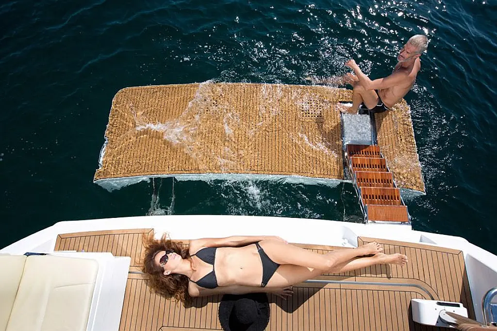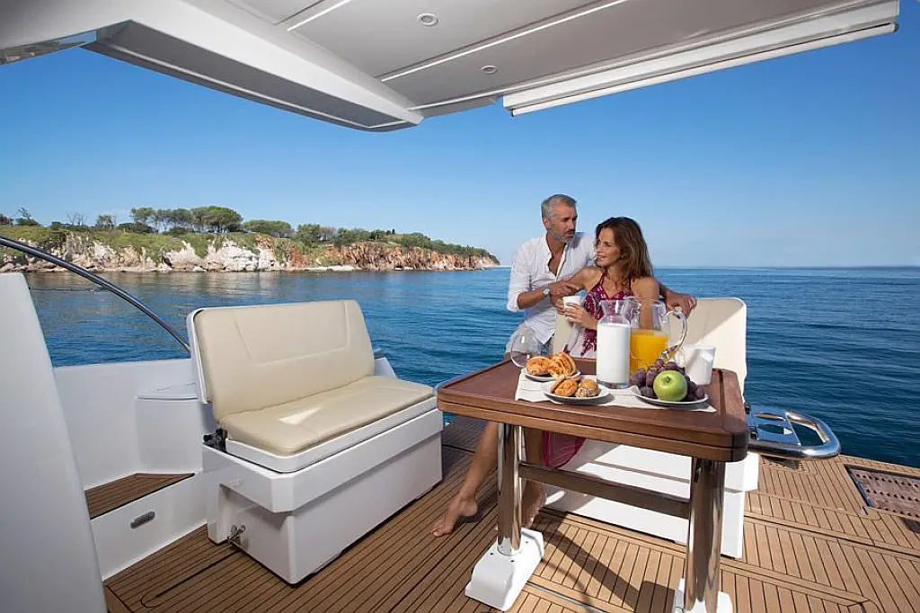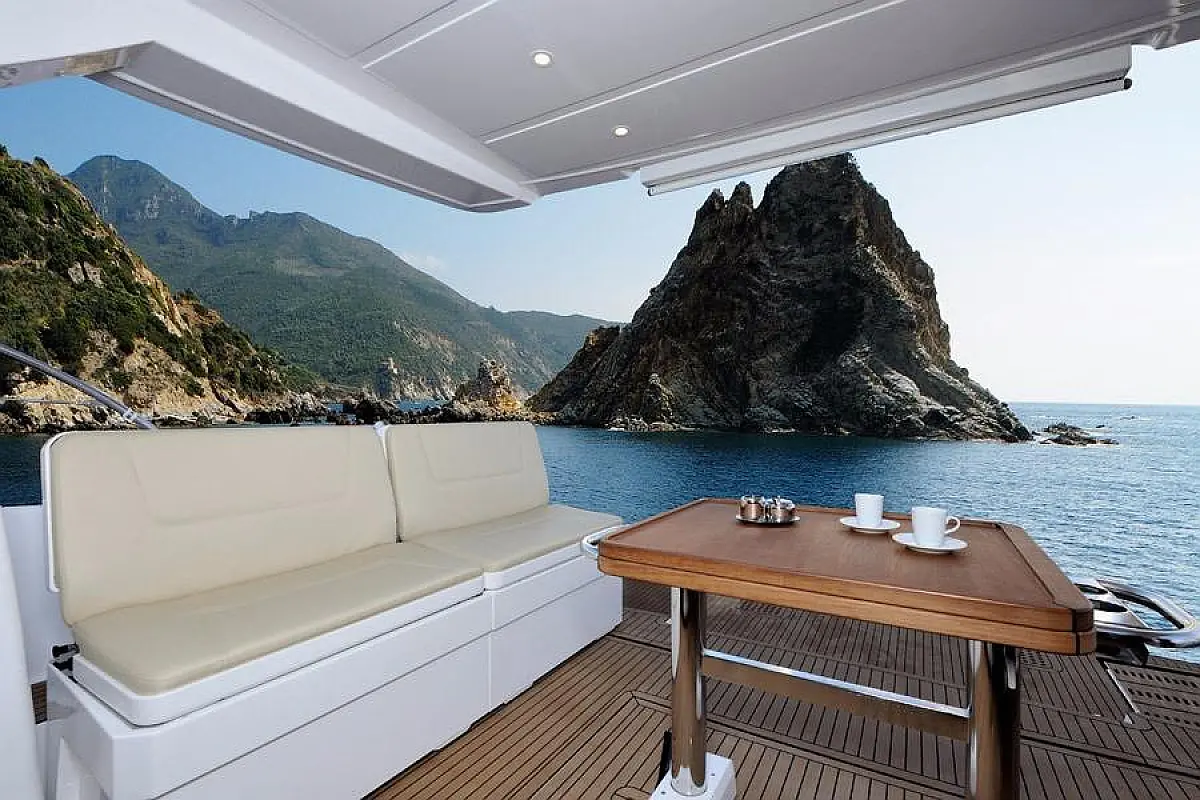 Ice maker on flybridge, Fridge on flybridge, Bathing platform, Bimini top, Hydraulically lifting bathing platform, Electric flybridge grill, Sunbed on flybridge, Movable deck lounge chairs, Sun pad on foredeck, Movable carbon gangway