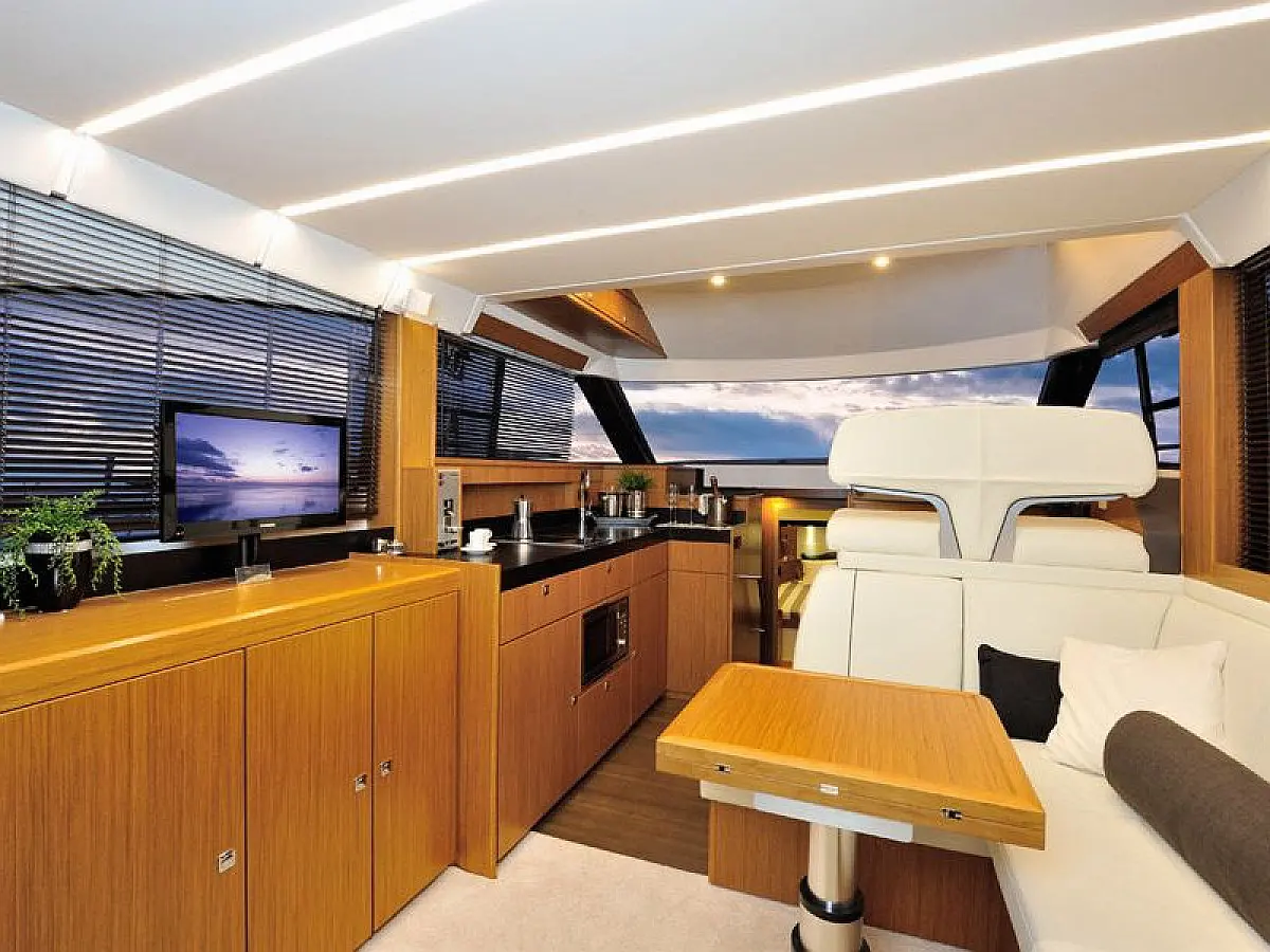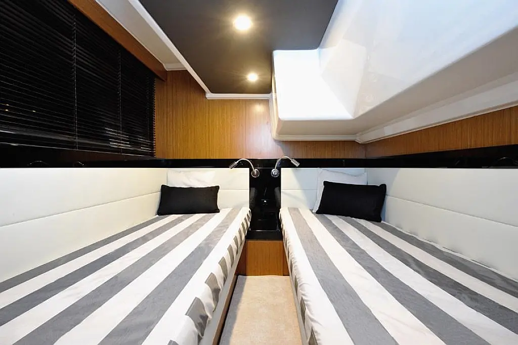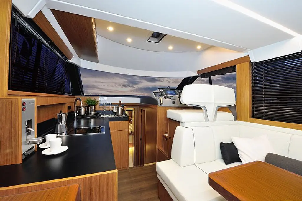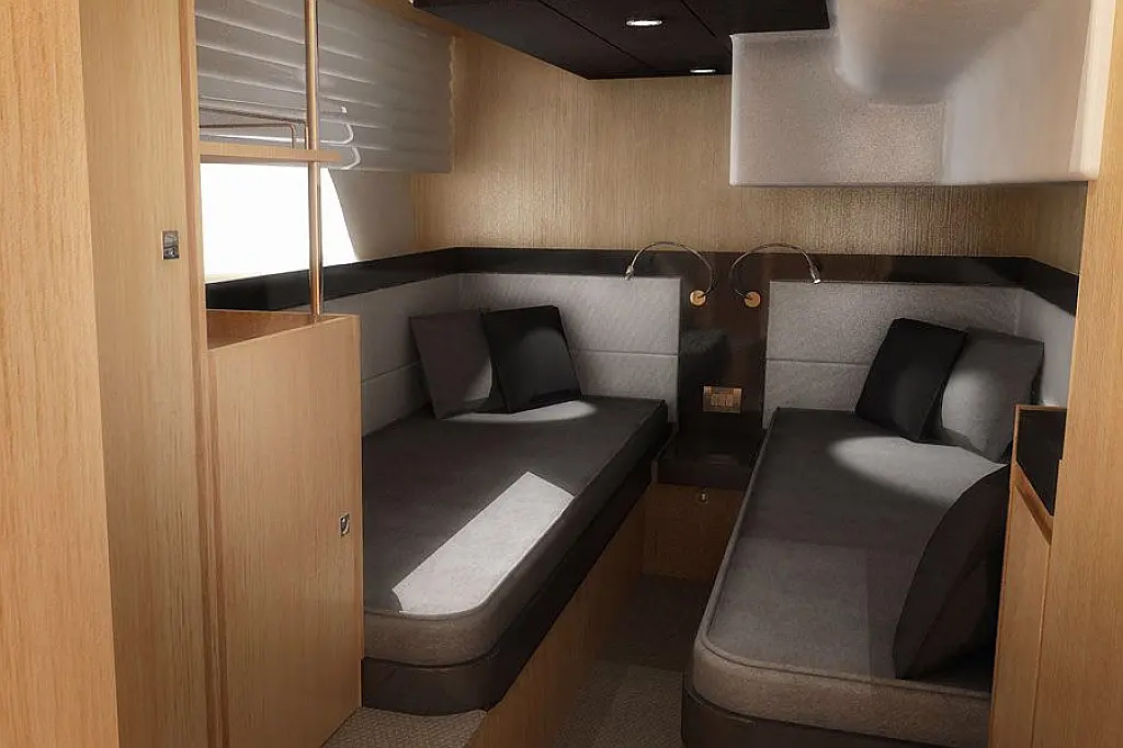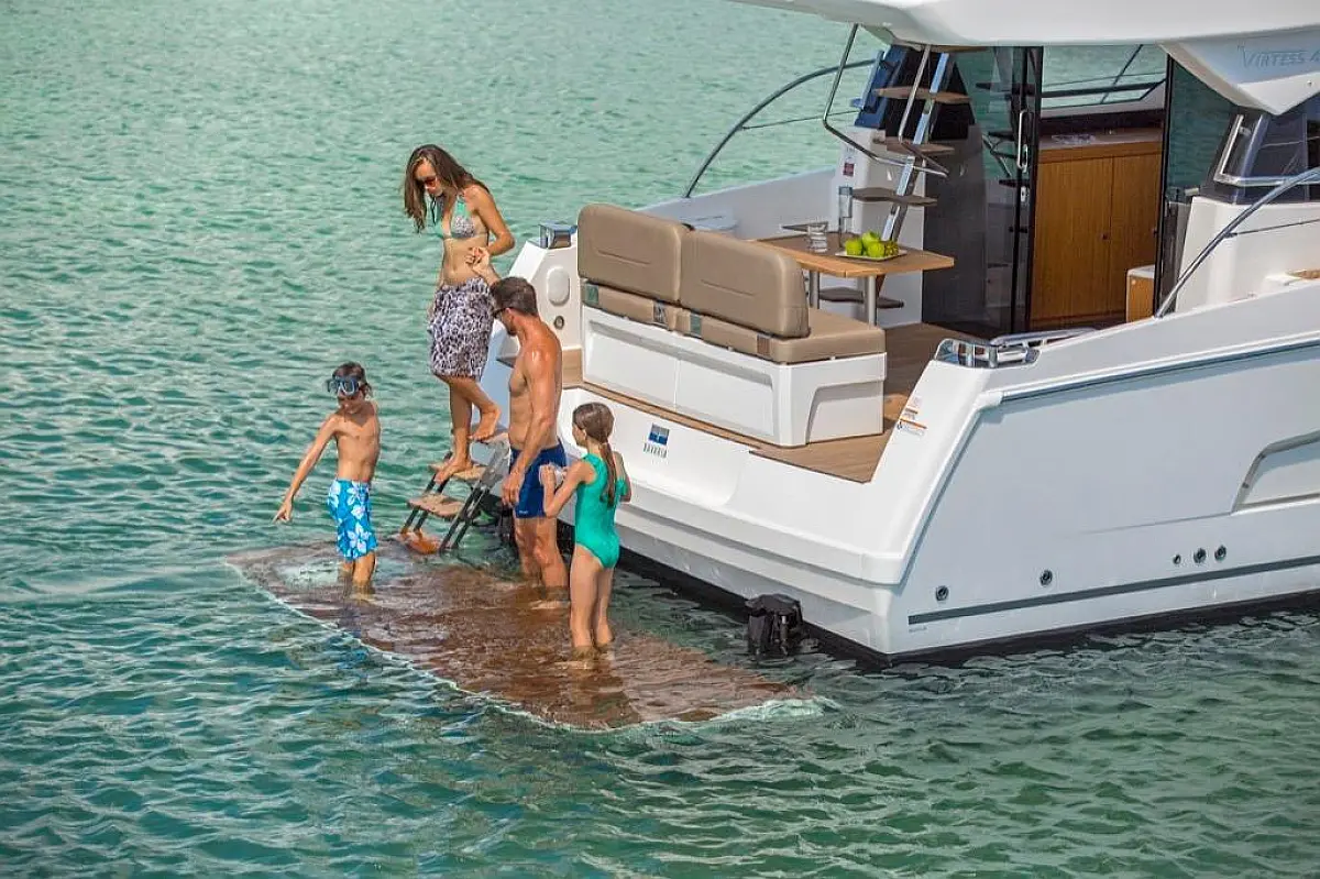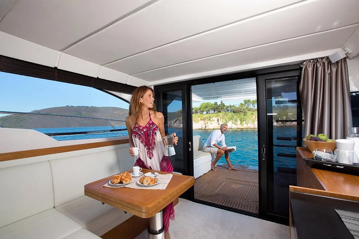 Ice maker on flybridge, Fridge on flybridge, Bathing platform, Bimini top, Hydraulically lifting bathing platform, Electric flybridge grill, Sunbed on flybridge, Movable deck lounge chairs, Sun pad on foredeck, Movable carbon gangway