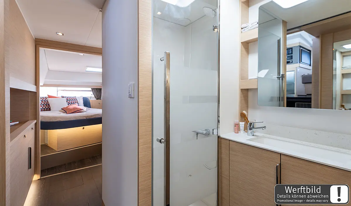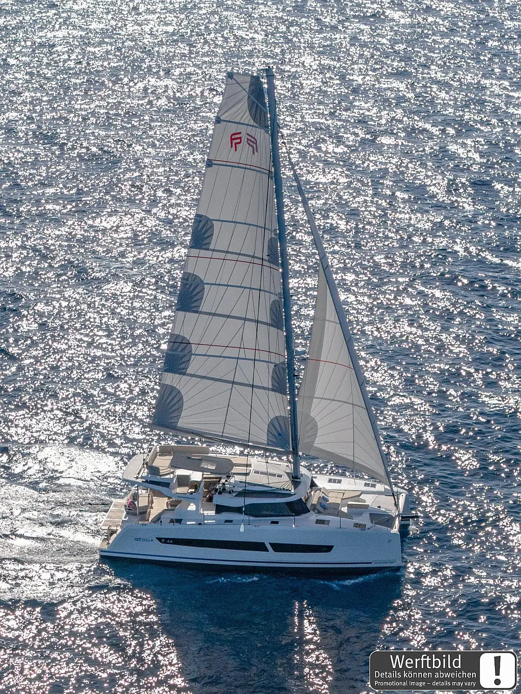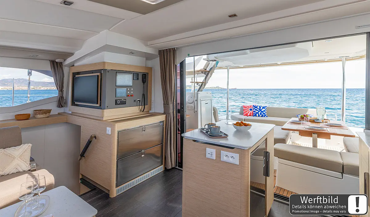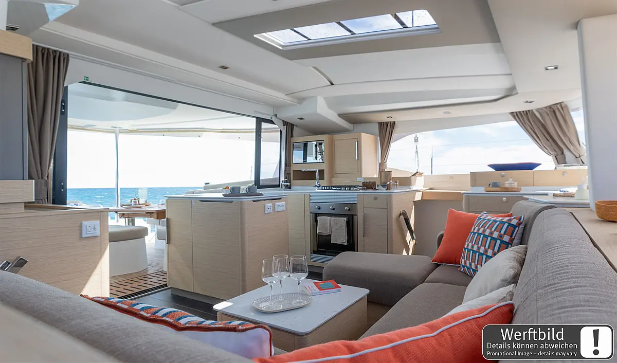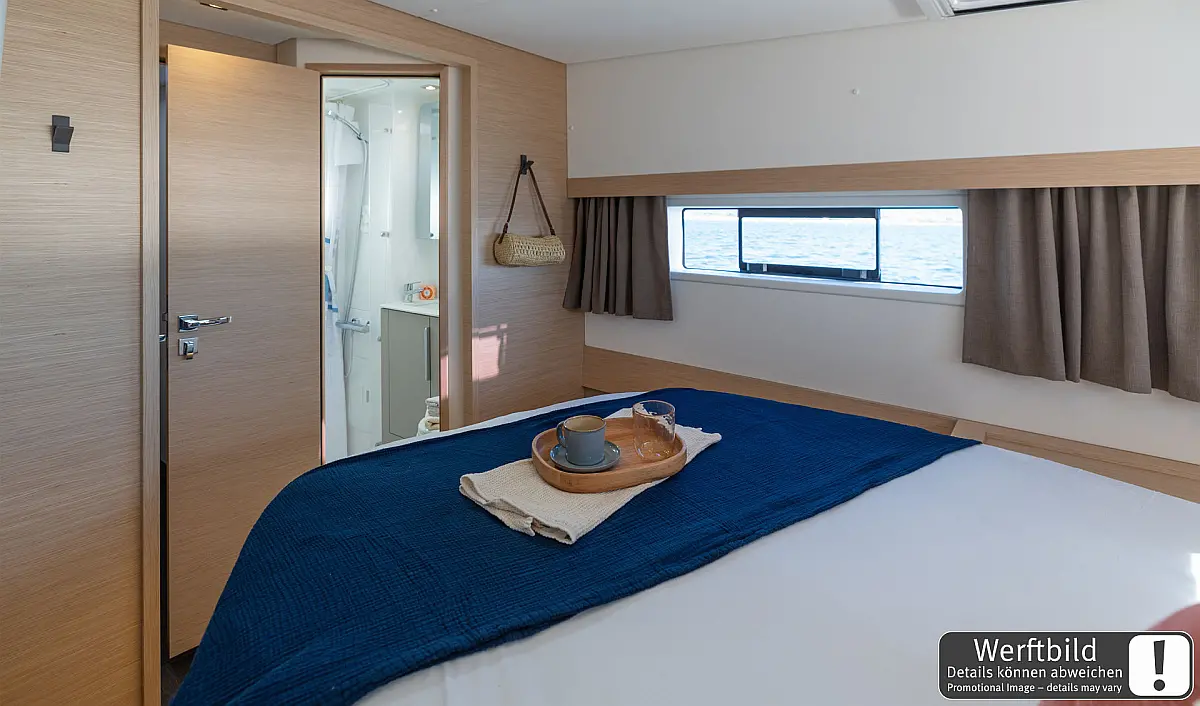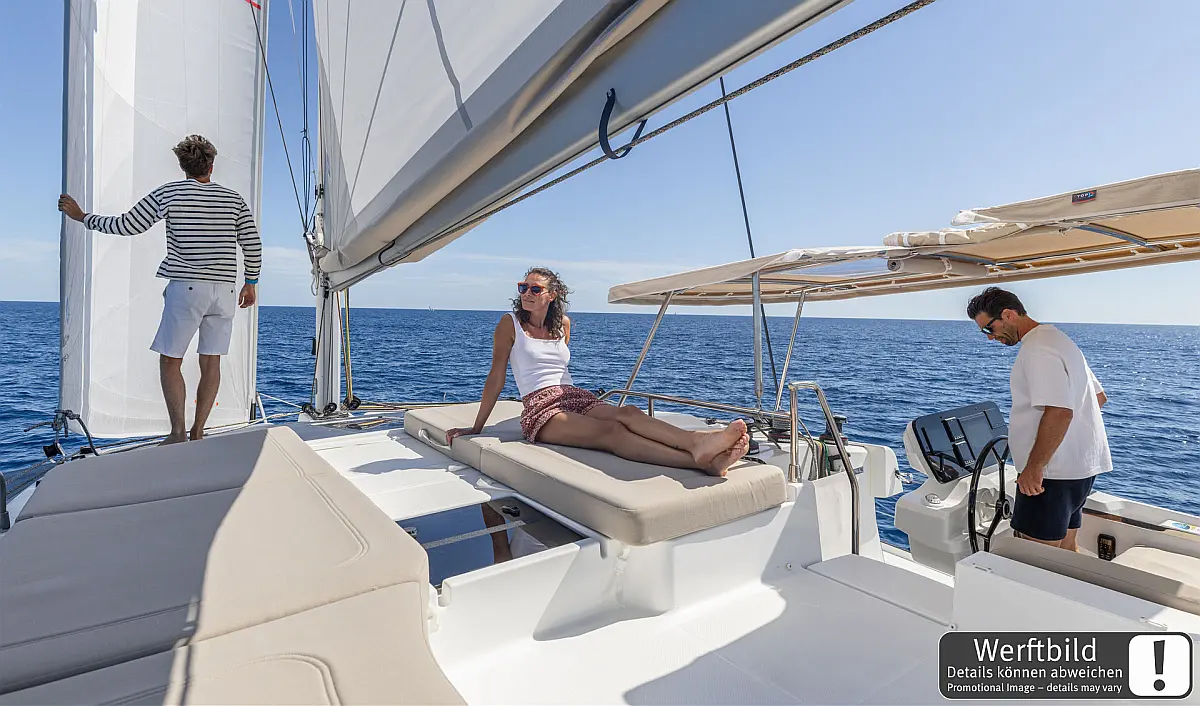 Skipper's cabin in the bow on the port side, bowsprit, electric bathing platform (max. 150 kg), outdoor cushions for cockpit and lounge deck, External upholstery for foredeck, protective strips at the stern of both hulls, sofa at the rear on the port side, Synthetic teak covering on stern steps, bathing platforms, and cockpit; additional mooring cleats; slatted frames under mattresses, Second VHF with AlS at the helm, Forward Scan Sonar Garmin PS 51-TH, radar, 3 refrigerators, heating via air conditioning for hulls and saloon, courtesy cockpit lighting, Water maker 12 V 105 l/h, two seats on the bow baskets, deck shower (hot), automatic switch for the bilge pumps, lazy bag and lazy jack, electric winch for main halyard, Seawater pressure system, Fusion audio package with 4 speakers, 2,000 W inverter/charger 220 V/50 Hz, all-round cockpit enclosure (cockpit canopy), External cover for saloon windows as sun protection, bimini for helm station, all-round trim for helm station bimini, curtains in cabins, CST mainsail with battens, 1,500W electric anchor winch
