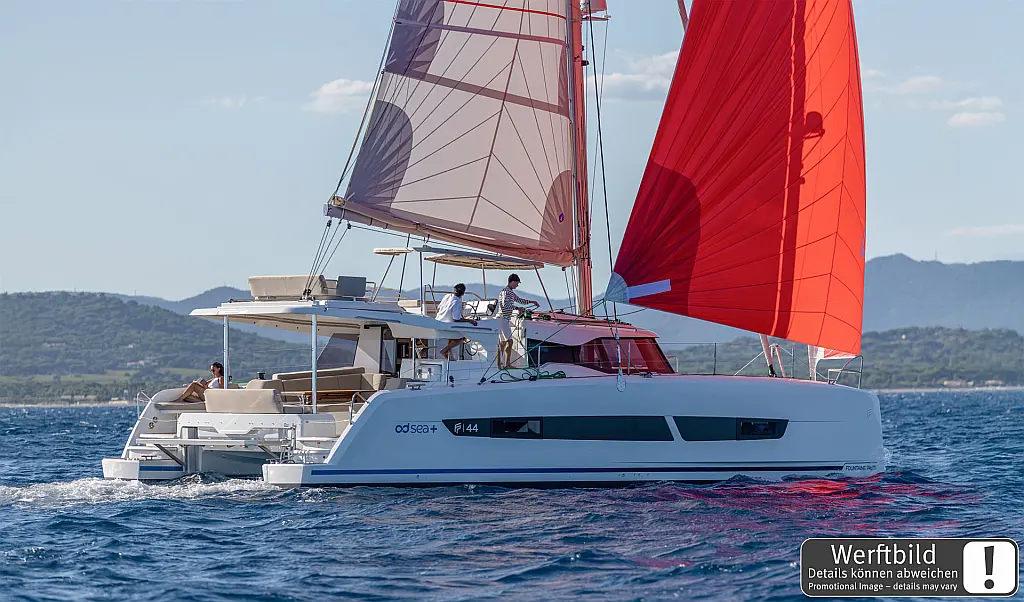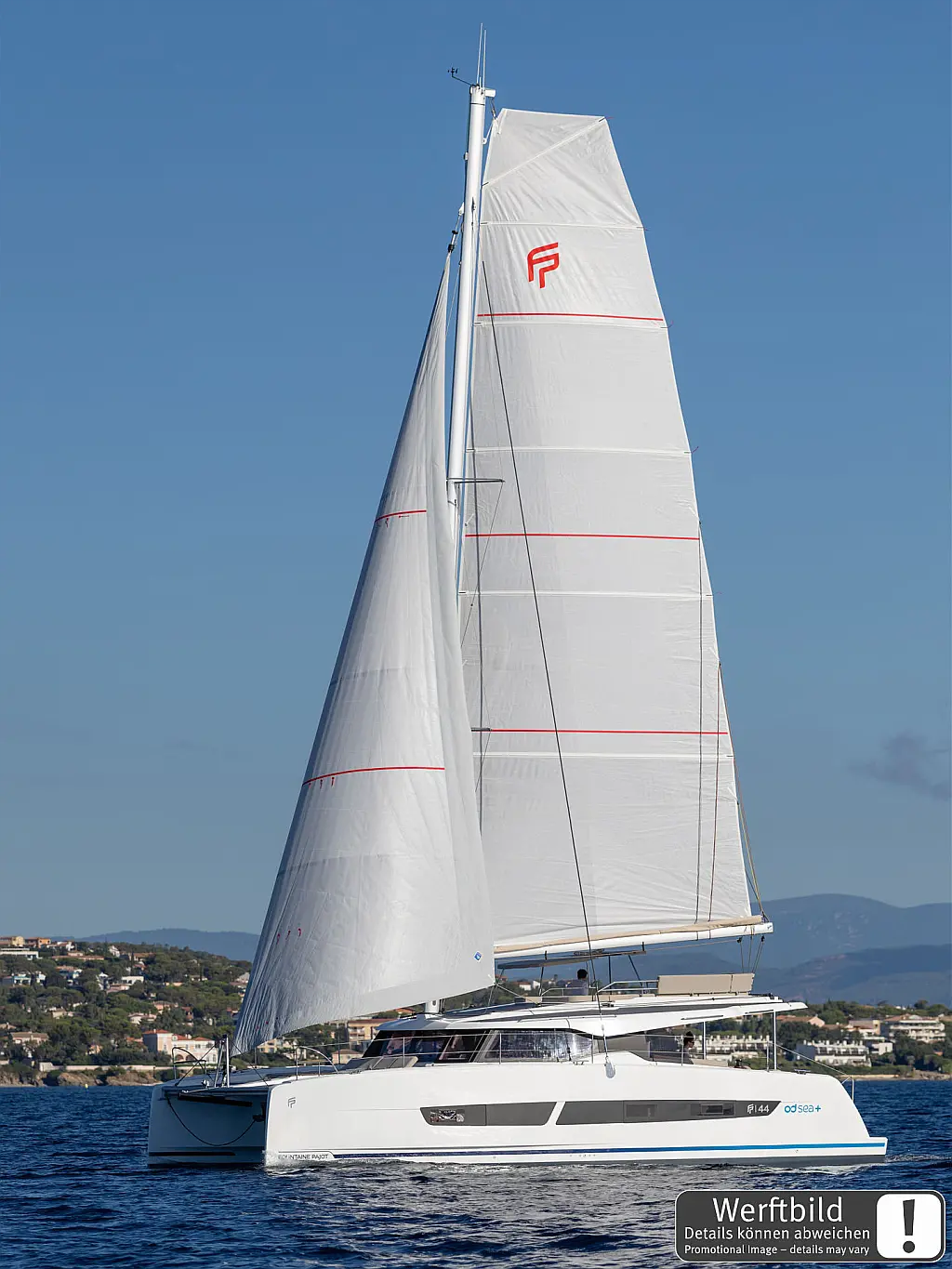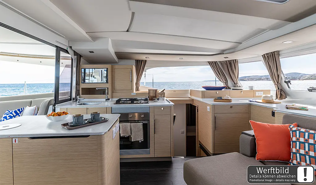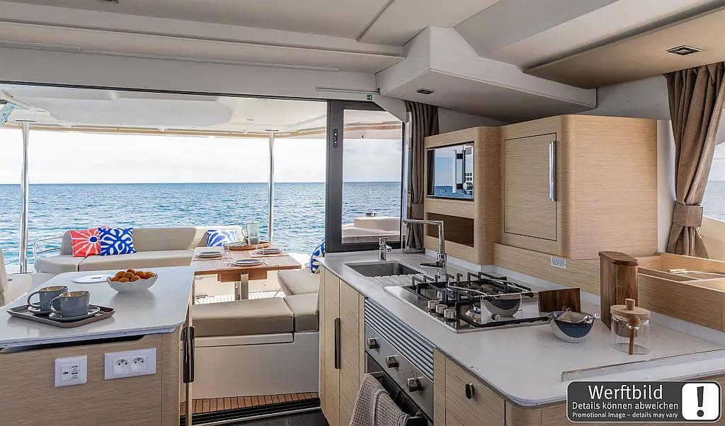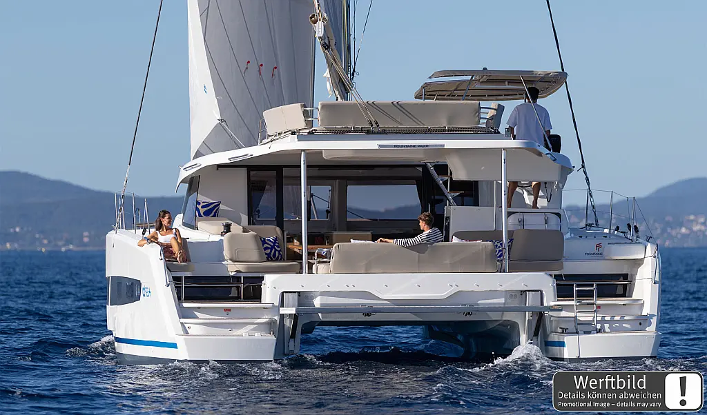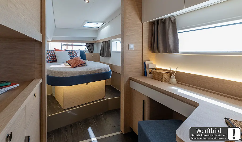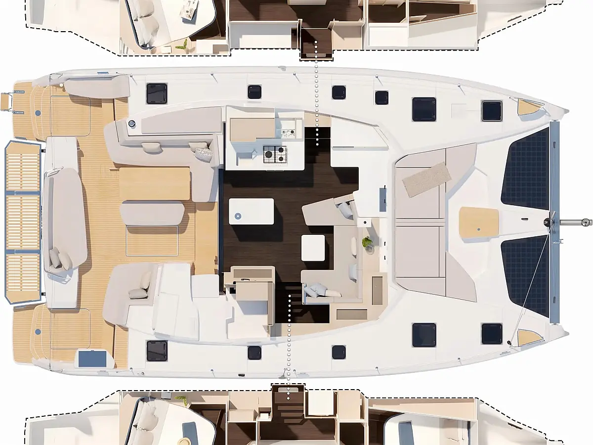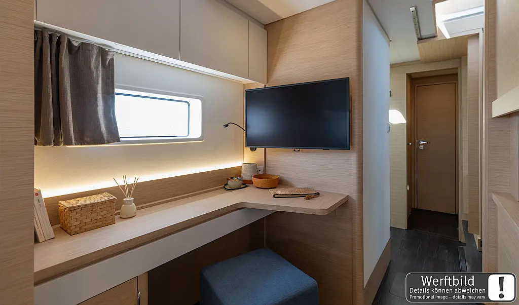 Skipper's cabin in the bow on the port side, bowsprit, electric bathing platform (max. 150 kg), outdoor cushions for cockpit and lounge deck, External upholstery for foredeck, protective strips at the stern of both hulls, sofa at the rear on the port side, Synthetic teak covering on stern steps, bathing platforms, and cockpit; additional mooring cleats; slatted frames under mattresses, Second VHF with AlS at the helm, Forward Scan Sonar Garmin PS 51-TH, radar, 3 refrigerators, heating via air conditioning for hulls and saloon, courtesy cockpit lighting, Water maker 12 V 105 l/h, two seats on the bow baskets, deck shower (hot), automatic switch for the bilge pumps, lazy bag and lazy jack, electric winch for main halyard, Seawater pressure system, Fusion audio package with 4 speakers, 2,000 W inverter/charger 220 V/50 Hz, all-round cockpit enclosure (cockpit canopy), External cover for saloon windows as sun protection, bimini for helm station, all-round trim for helm station bimini, curtains in cabins, CST mainsail with battens, 1,500W electric anchor winch