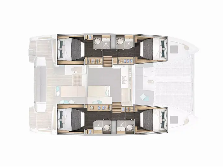 Frigo in pozzetto, Ventilatori in cabine, Pullman berth, Ventilatori in dinette, Bagni elettrici (4), A/C, Pannelli solari, Dissalatore