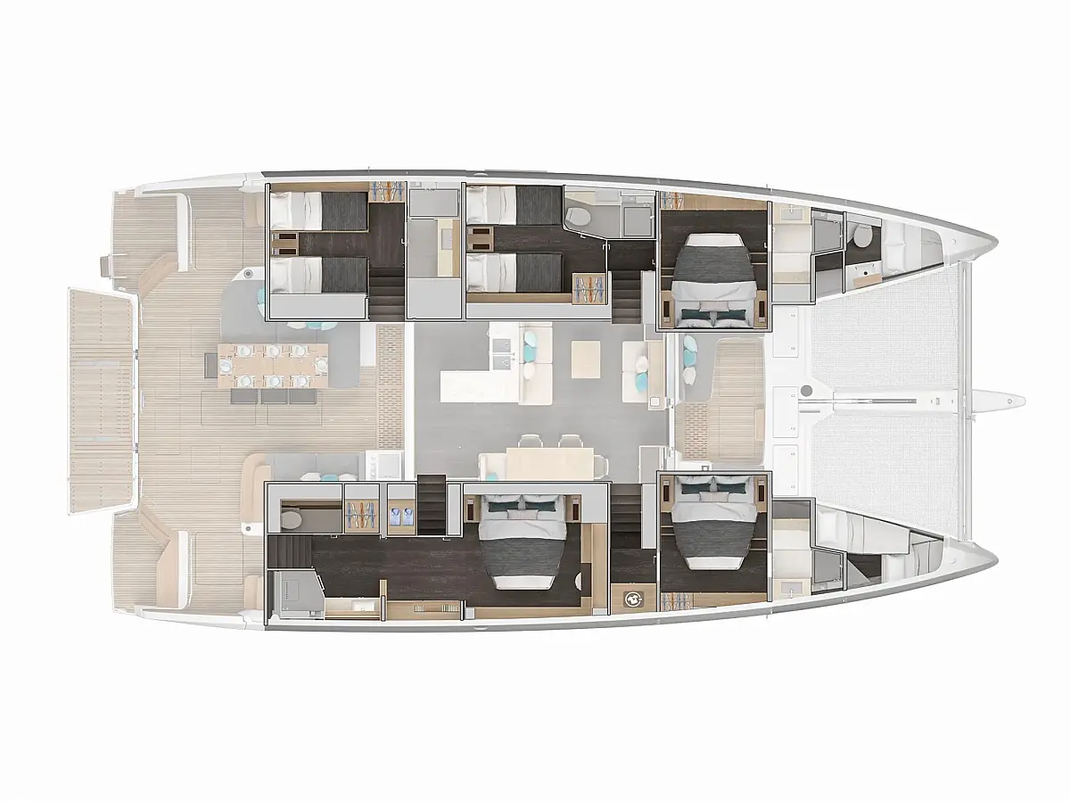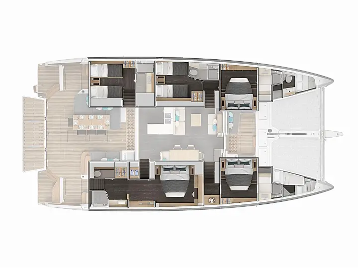 Frigo in pozzetto, Tenderlift, Bagni elettrici (5), A/C, Pannelli solari, Dissalatore, Lavastoviglie, SUP, Chart plotter in pozzetto, Set snorkeling (10), Flybridge, WC in front peak cabins