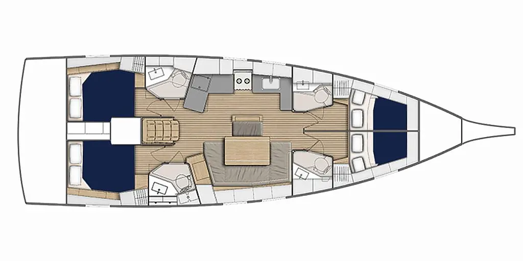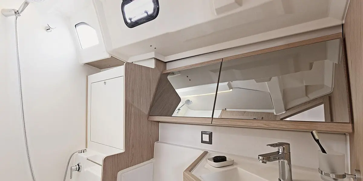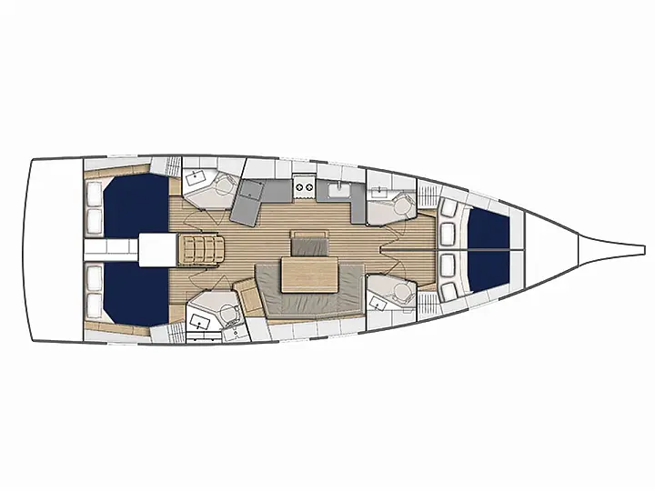 Steering wheel (1), Emergency tiller, Secondary anchor (15kg Britany anchor with 8m of chain and 61m warp), Stainless steel roller, Self-draining anchor locker w/ cover, Primary anchor (20kg Delta anchor with 50m of chain), Electric windlass, Swimming ladder, Horseshoe buoy, Flag pole holder