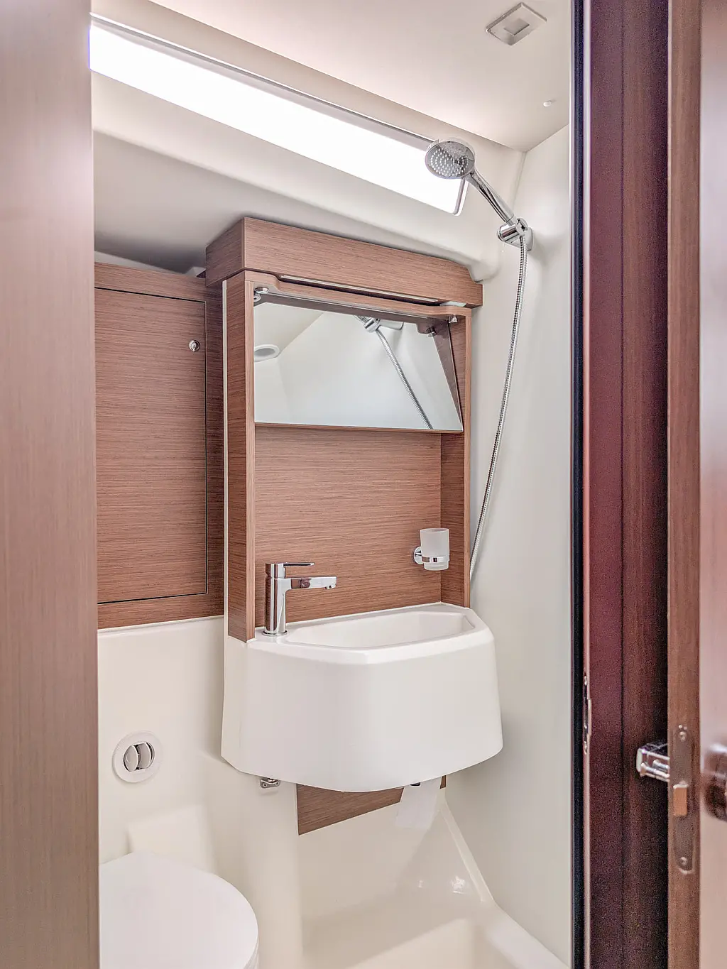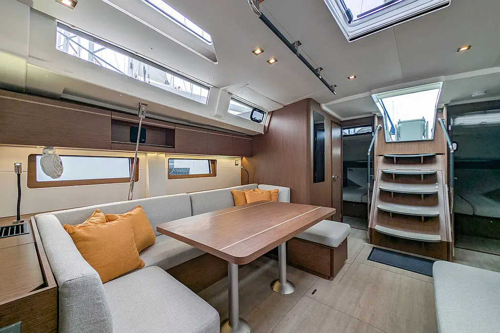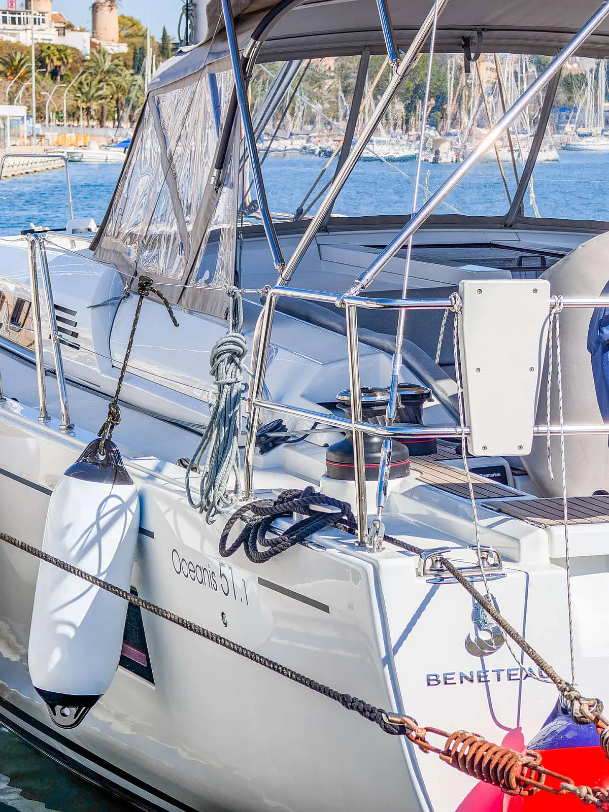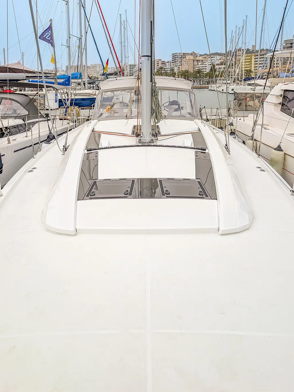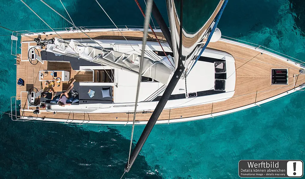 Anchor light, Automatic charger 220V, Cockpit Shower, Bimini, Bathing ladder, Bilge pump electric, Boat hook, Boatswain's chair, Bow and stern pulpit, Steamer light, Deck brush, Dinghi, Double sea railing, Electric shore connection cable 220V, 25 m, Electric windlass, Holding tank, Halyard winches 2 pieces, fenders 6-8 pieces, mooring ropes 4 pieces (30 m), Gangway, Main anchor with 50 m chain, national flag, Position light, contactor, towing line 25 m, Schootwinsche, Sprayhood, Diving goggles and snorkel (1 Set), Second anchor, Shroud cutter, tool box, yacht & engine key