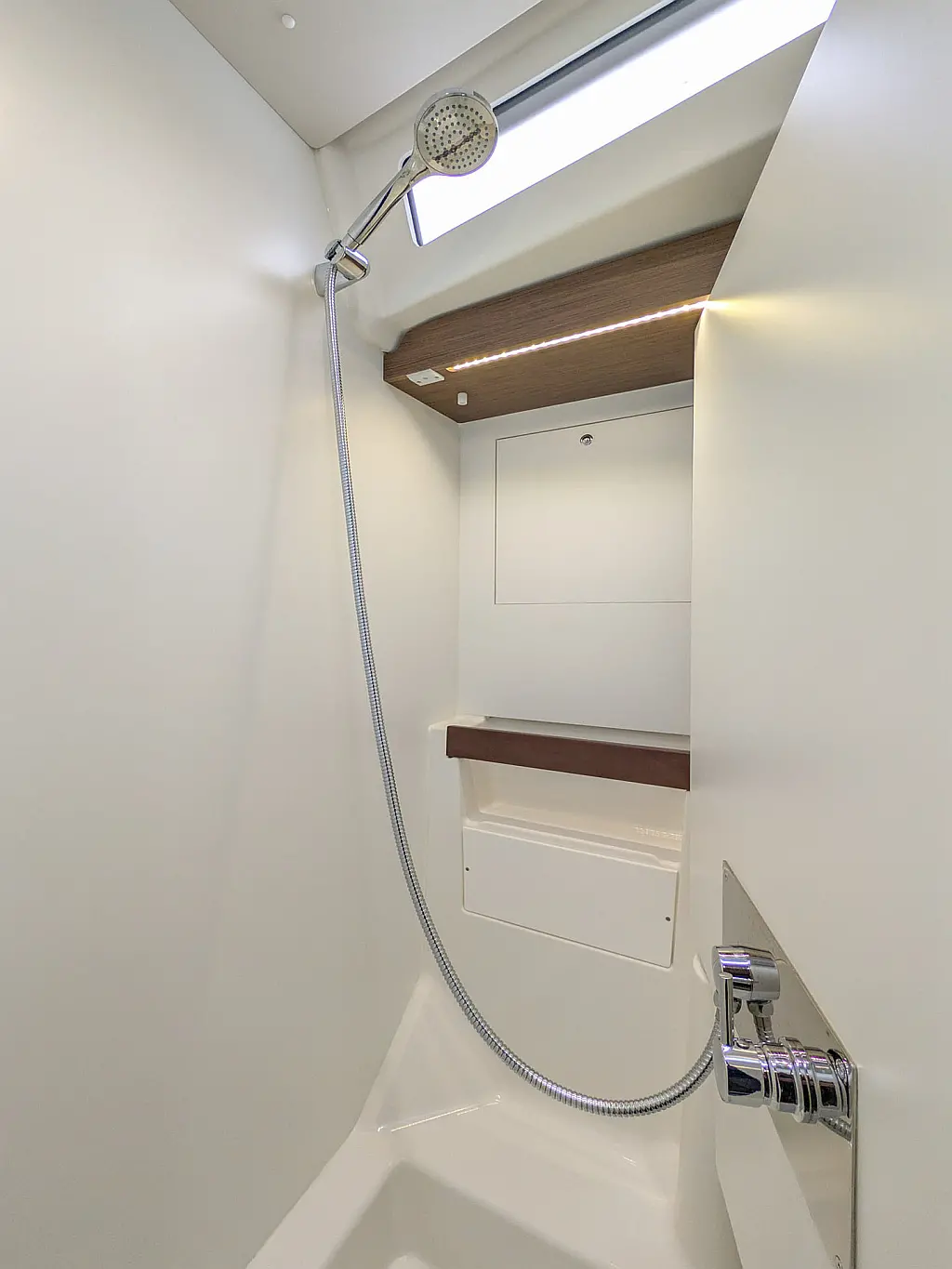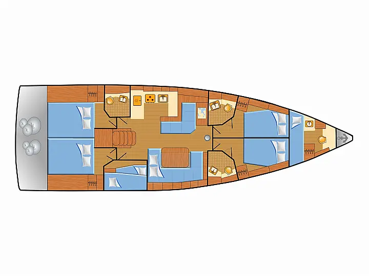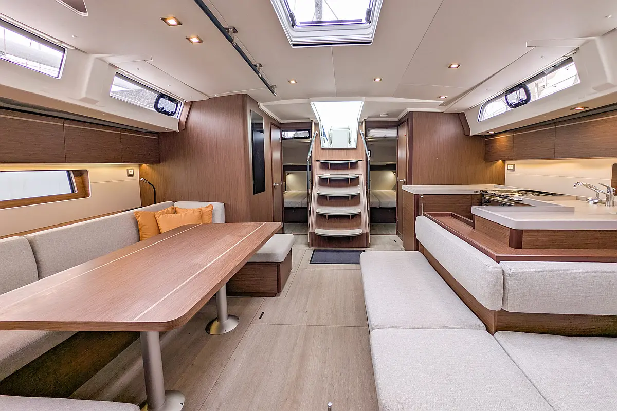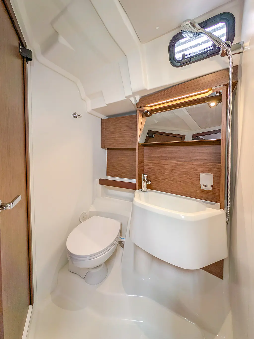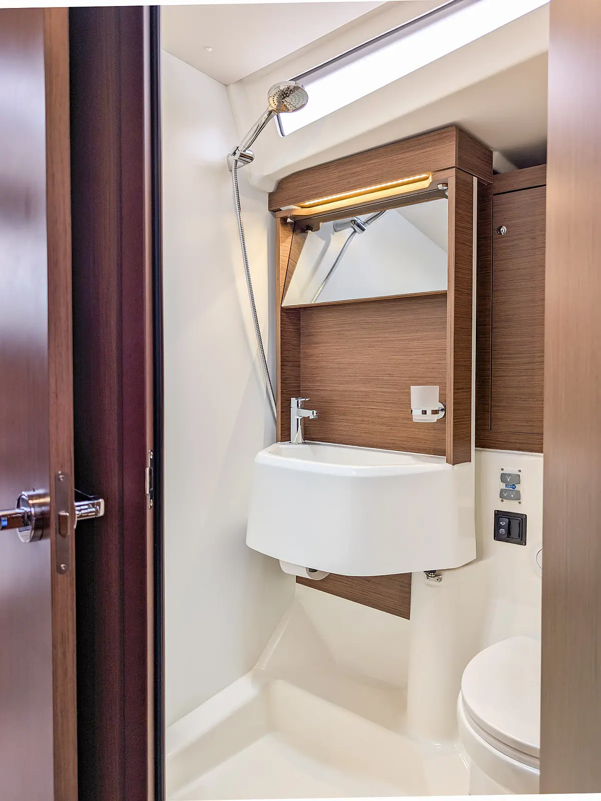 Anchor light, Automatic charger 220V, Cockpit Shower, Bimini, Bathing ladder, Bilge pump electric, Boat hook, Boatswain's chair, Bow and stern pulpit, Steamer light, Deck brush, Dinghi, Double sea railing, Electric shore connection cable 220V, 25 m, Electric windlass, Holding tank, Halyard winches 2 pieces, fenders 6-8 pieces, mooring ropes 4 pieces (30 m), Gangway, Main anchor with 50 m chain, national flag, Position light, contactor, towing line 25 m, Schootwinsche, Sprayhood, Diving goggles and snorkel (1 Set), Second anchor, Shroud cutter, tool box, yacht & engine key