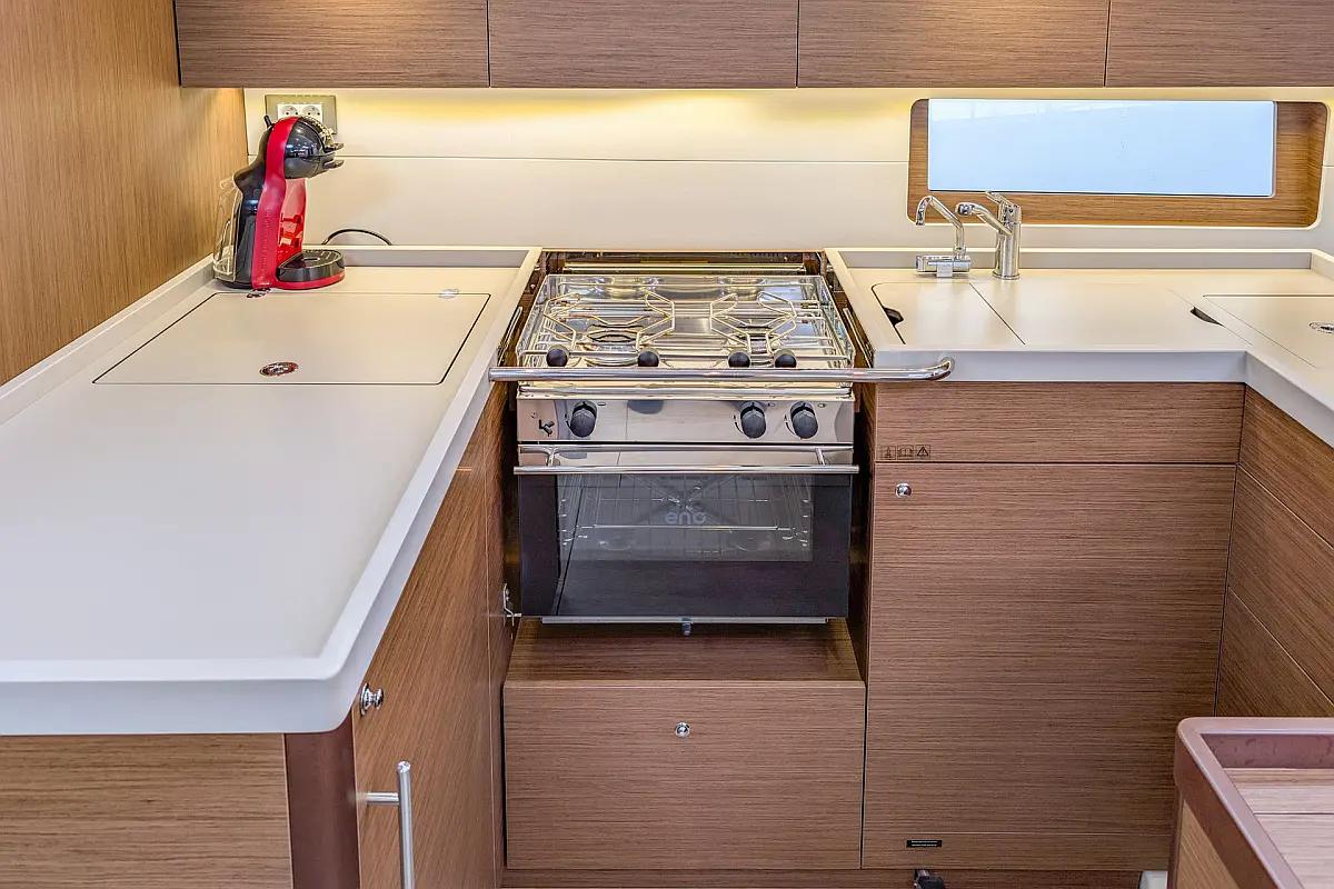 12 V sockets, 220 V sockets, Adapter cable, Automatic charger 220 V, Oven, Pressurized water system with taps pantry, 12 V Refrigerater, Fresh Water, Gas stove (2-3 flames), equipped pantry, Cabin lighting, Converter 12V-230V, Radio with MP3-CD-Player, Safe, Sink in the pantry, Hotwater, WIFI