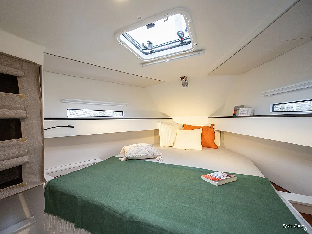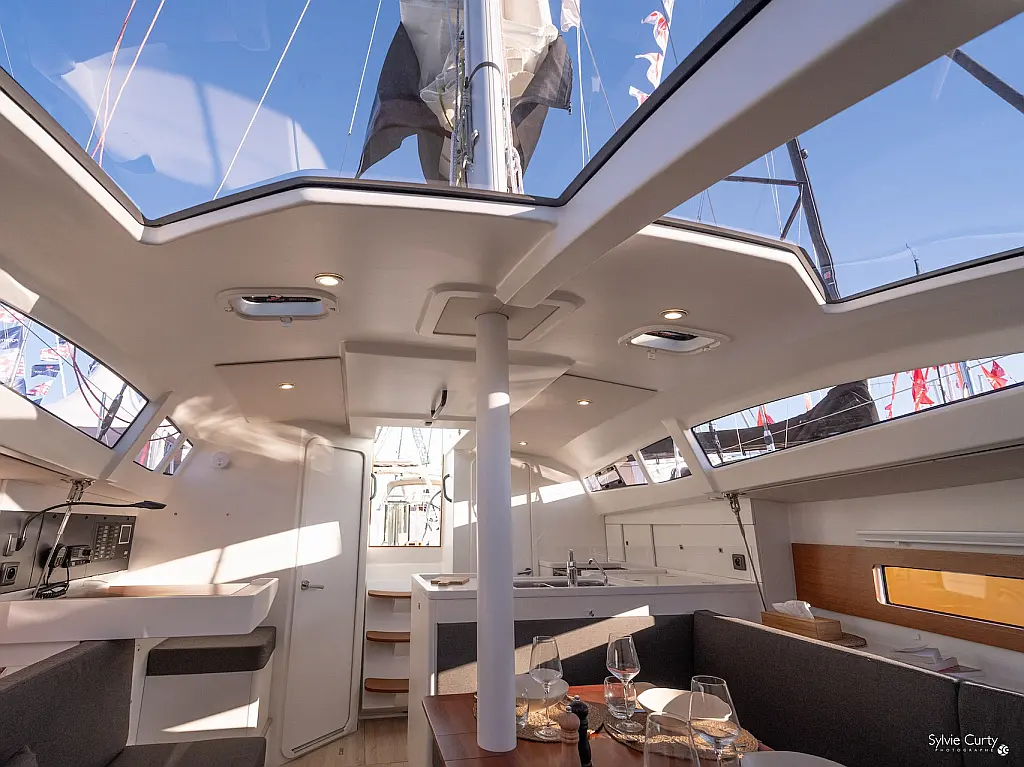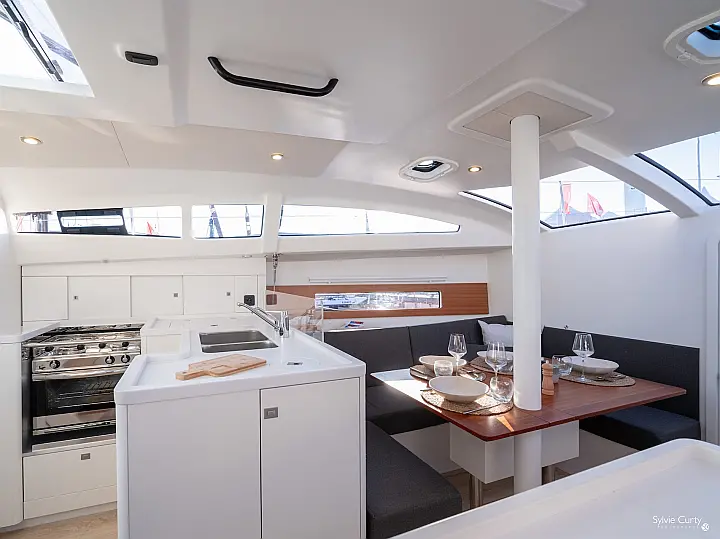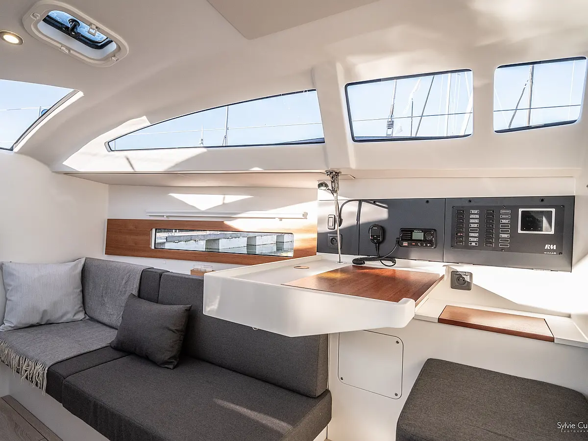 Spray hood, Carbon mast, Indoor shower, Fridge, Self-inflating vests (6), Nautical guides and maps, Autopilot, Gennaker on furler, AIS Transmitter / Receiver, Electric windlass, Black water tank, Multifunction screen instrument: log-speedo-depth sounder, Keel (2), Rudders, Asymettric spinnaker (option), DST800 analog tri-probe, Kitchen utensils, 3 batteries pack, Dinghy, Safety equipment, Miscellaneous small equipment, Pressurized hot water, Deck shower (hot water), 2-cabin version + technical hold, Two steering wheels, Mailsail, Furling solent, Furling staysail, Navigation unit with Axiom 9 plotter + cartography, VHF DSC Ray 53 with splitter and integrated GPS, Shore charger, Removable cockpit table