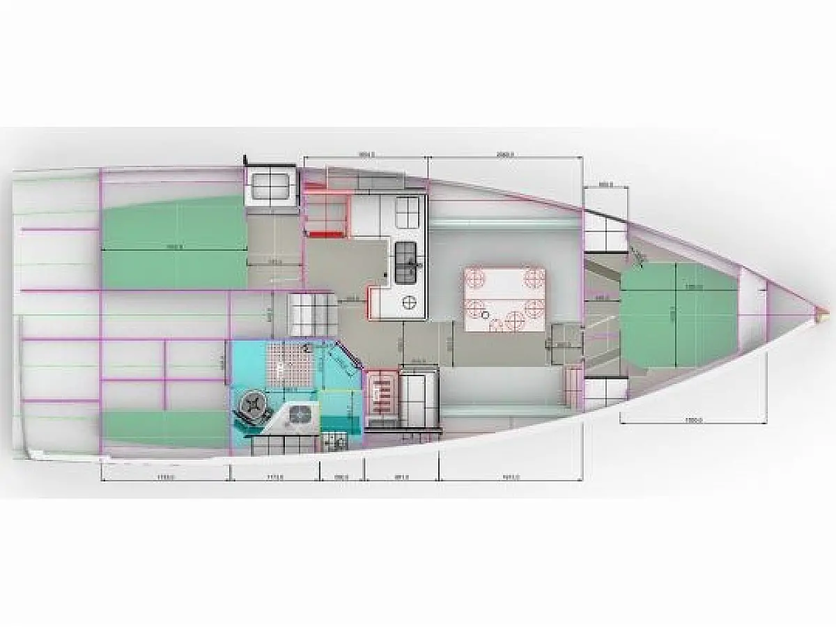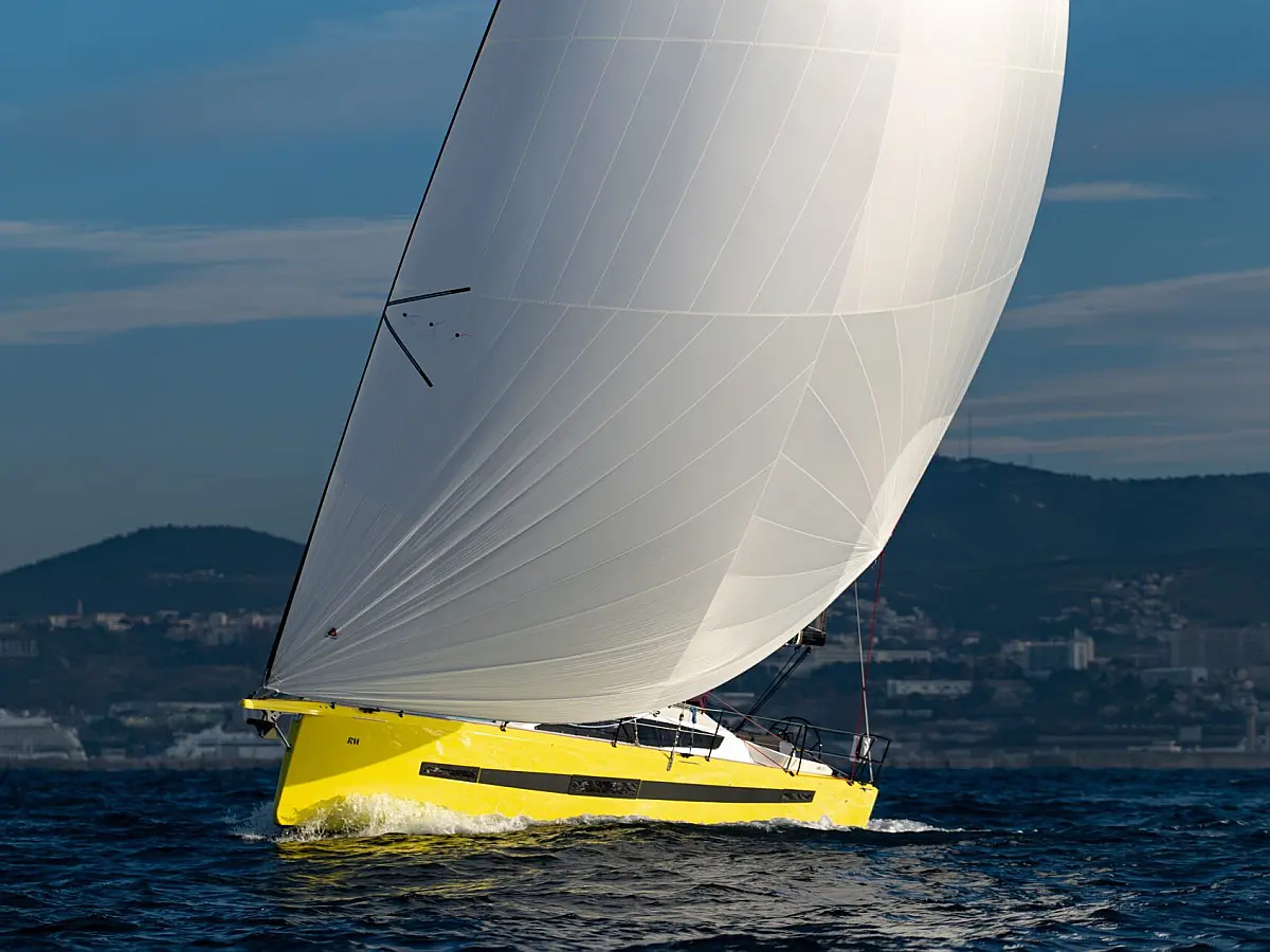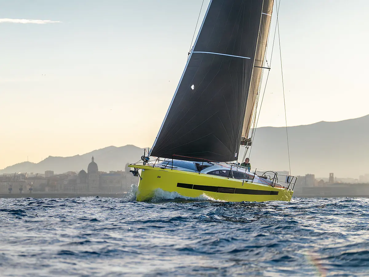 Spray hood, Carbon mast, Indoor shower, Fridge, Self-inflating vests (6), Nautical guides and maps, Autopilot, Gennaker on furler, AIS Transmitter / Receiver, Electric windlass, Black water tank, Multifunction screen instrument: log-speedo-depth sounder, Keel (2), Rudders, Asymettric spinnaker (option), DST800 analog tri-probe, Kitchen utensils, 3 batteries pack, Dinghy, Safety equipment, Miscellaneous small equipment, Pressurized hot water, Deck shower (hot water), 2-cabin version + technical hold, Two steering wheels, Mailsail, Furling solent, Furling staysail, Navigation unit with Axiom 9 plotter + cartography, VHF DSC Ray 53 with splitter and integrated GPS, Shore charger, Removable cockpit table
