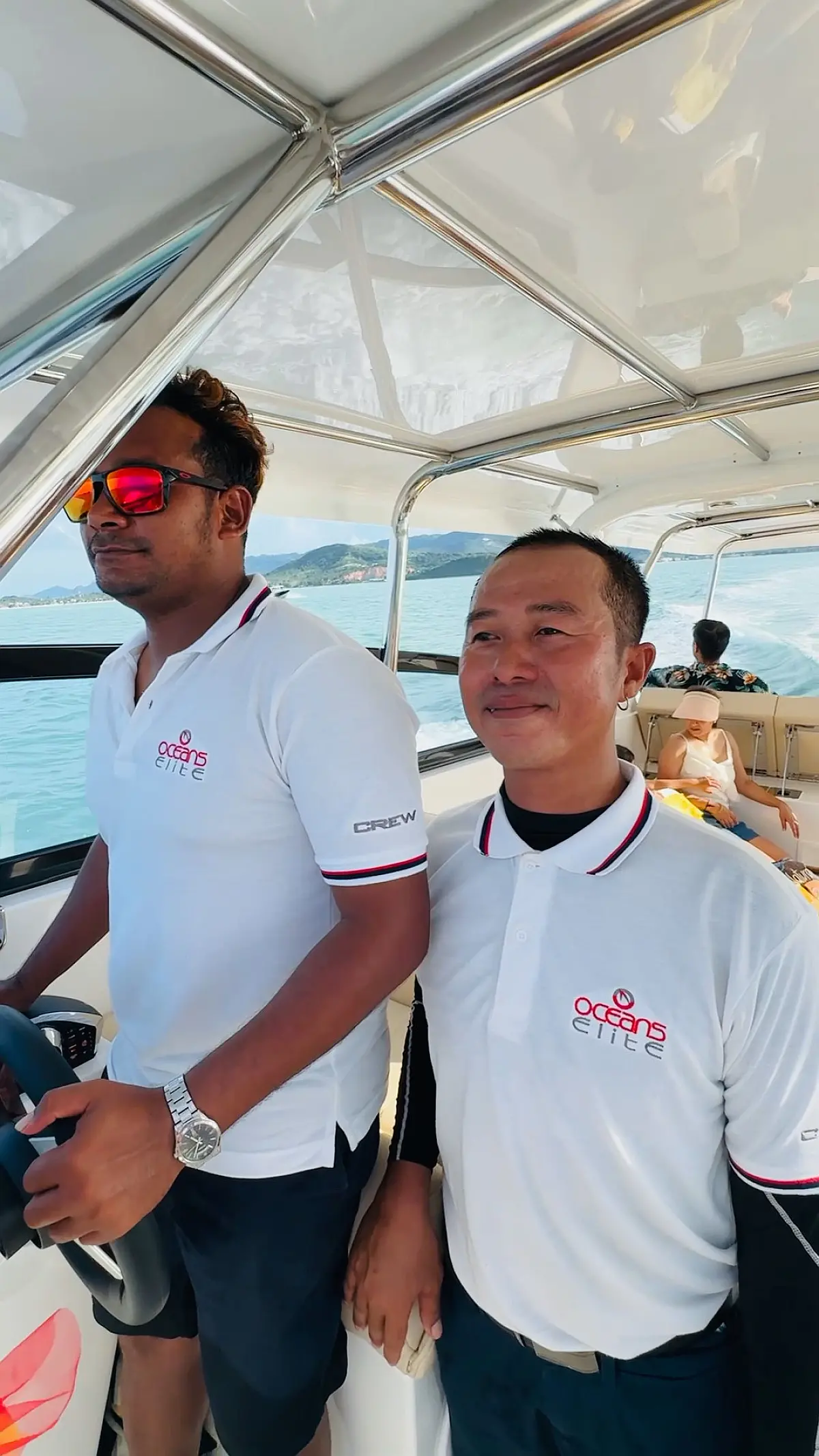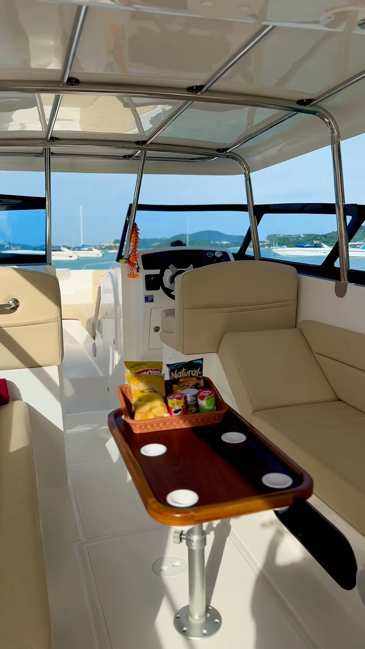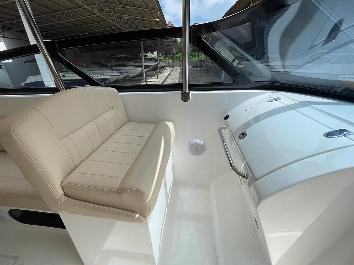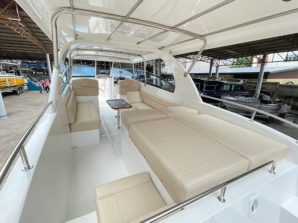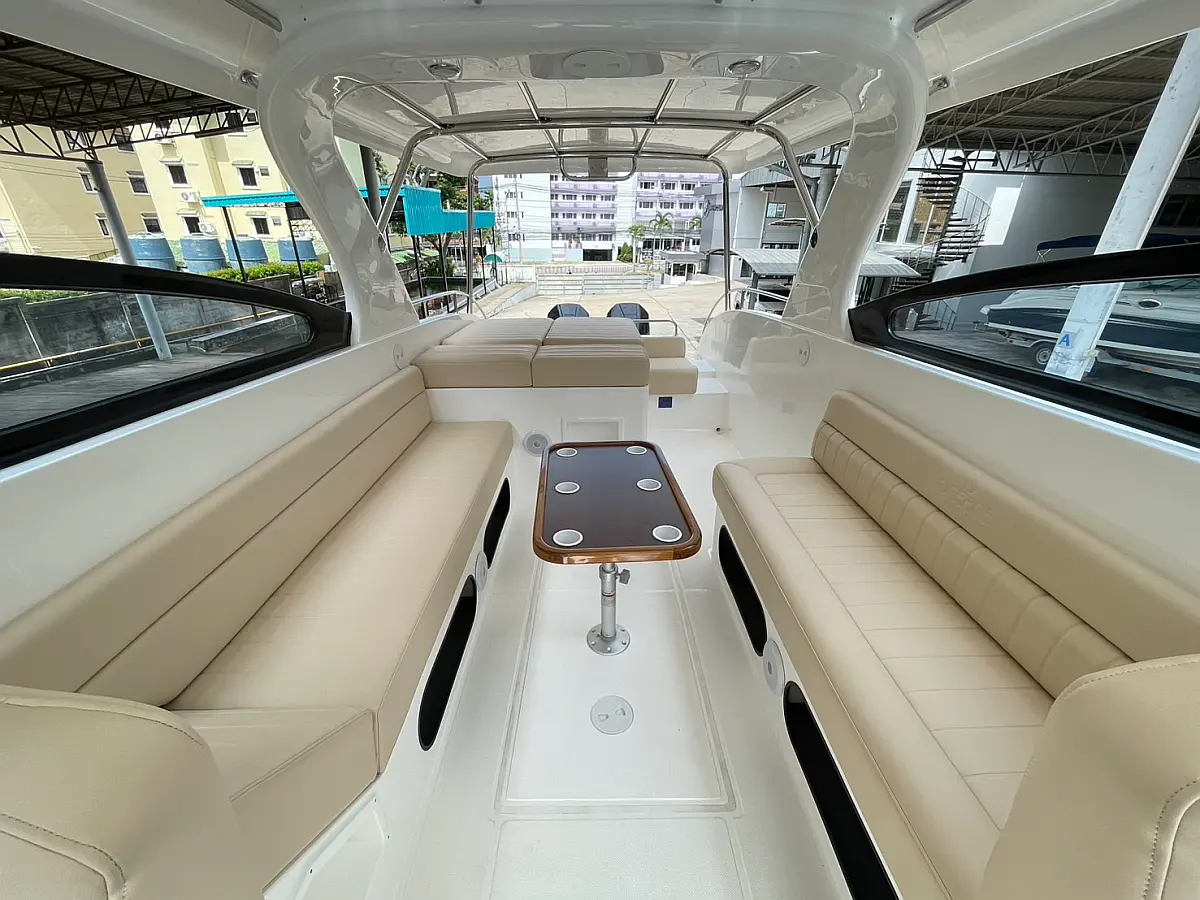 Electric toilets, VHF, Fusion Marine Stereo with 3 pairs of 6.5? speakers and amplifier, Removable table (6 cup holders), Compass, Ski pole, GPS, Life jackets, First-aid kit, Snorkeling equipment