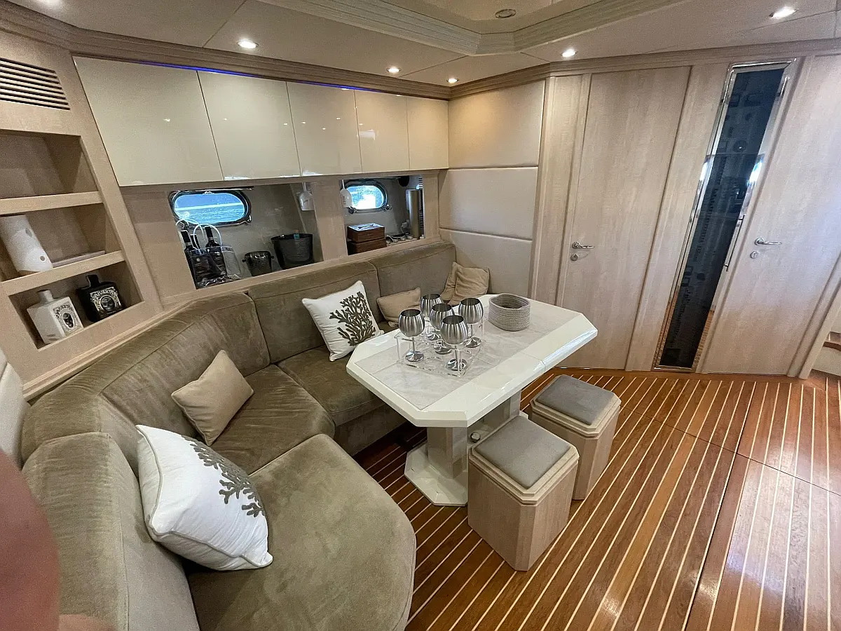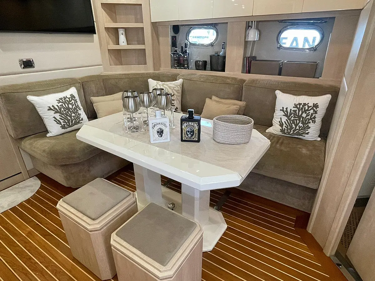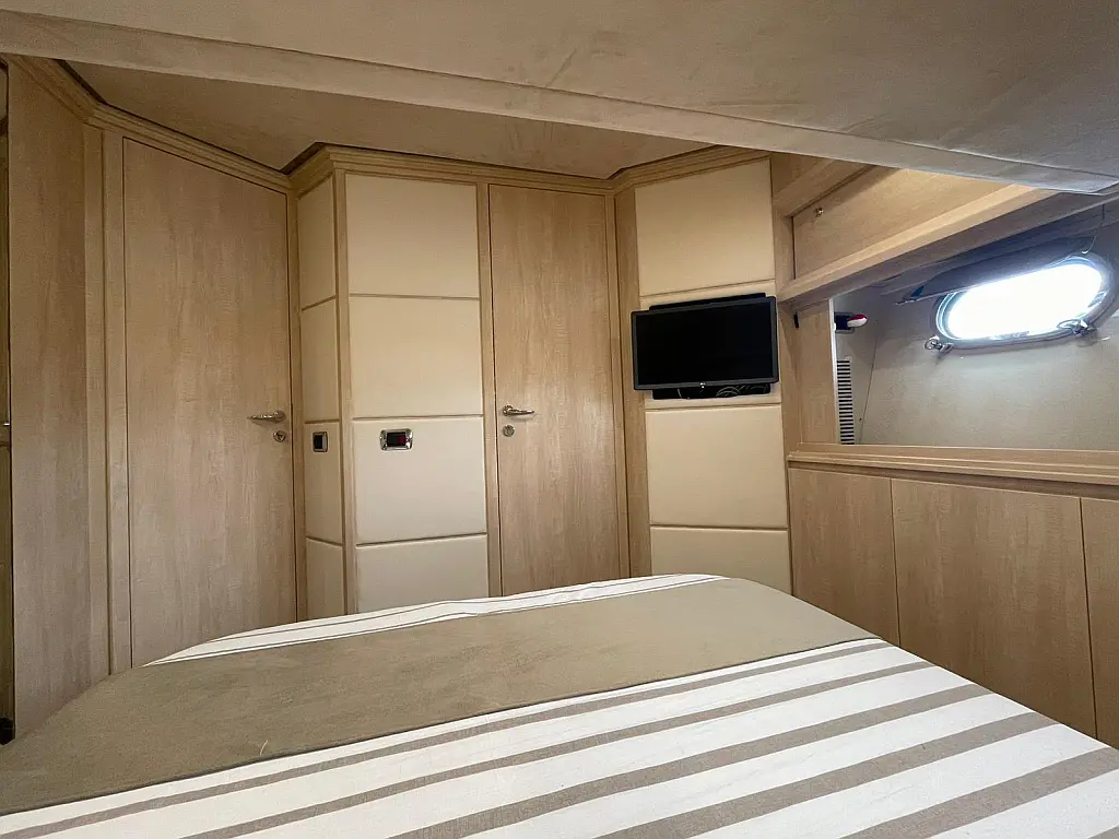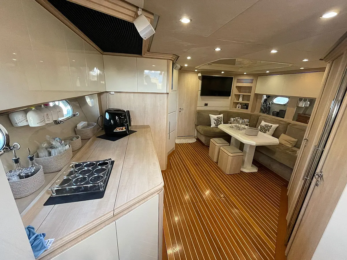 Autopilot, Bow thruster, Electric Generator, Fridge, Freezer, Sink, Hob, Oven, Watermaker, Coffee machine (electric), Cutlery and pots, Microwave oven, Ice Maker, Air Conditioning, Cushions on deck, Heating System, Covered shower, Radio CD / MP3 player / Audio system, Internal speakers, External speakers, Flat screen TV, Sunbathing cushions, External GPS plotter, Inverter, Radar, Teak deck (entire deck), Bimini, Bathing platform