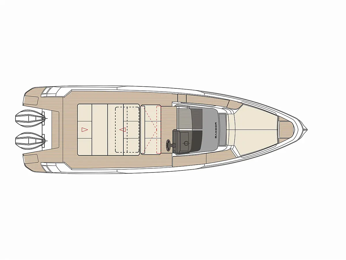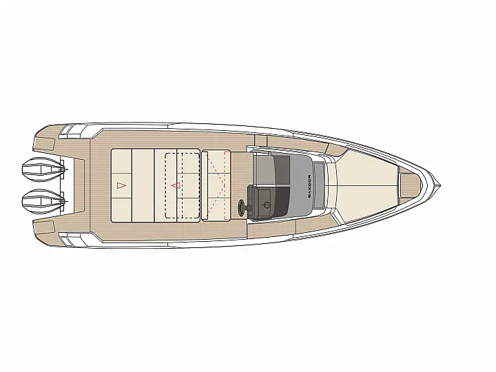 Skytop roof, Soft Deck flooring, Clarion Audio system (8 speakers + Subwoofer), Twin sofa with sunbed option, Fresh water tank, Electric toilet, Shower on aft deck, Fridge, Sunshade over aft area, Front sunshade cushions, Canopy, Autopilot, Bow thruster, Bimini, Outside GPS plotter, Sink, Bathing platform, Outside speakers
