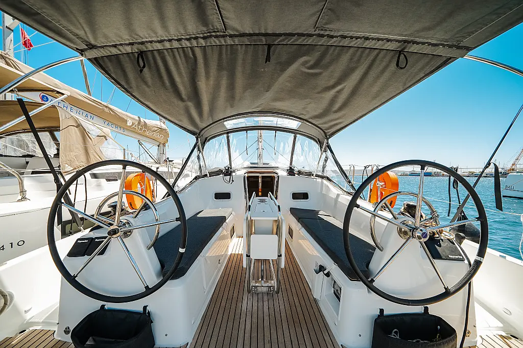 Bimini top, Fixed gangway, Cockpit table, Outboard, Tender, Snorkeling equipment (2), Sprayhood, Bimini top (1), Cockpit cushion, Dinghy, Bathing ladder, Bathing platform