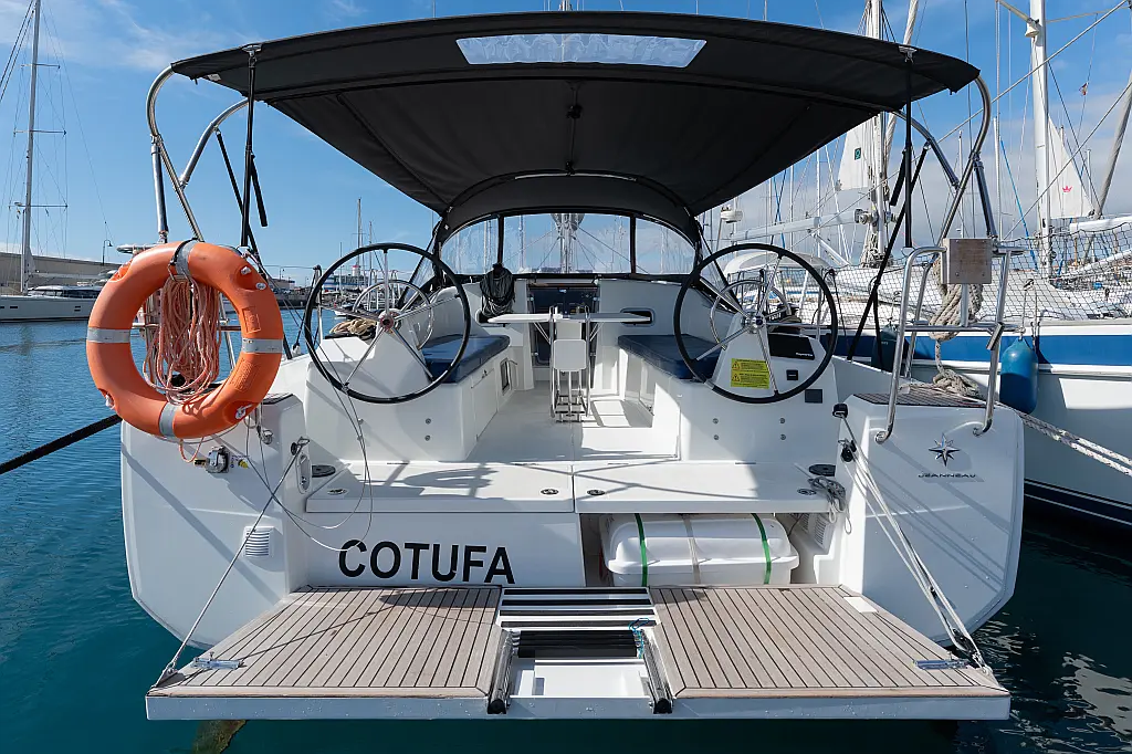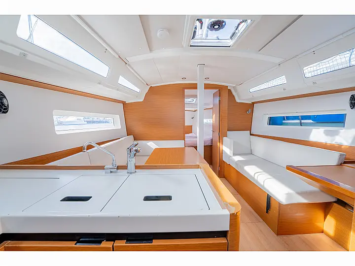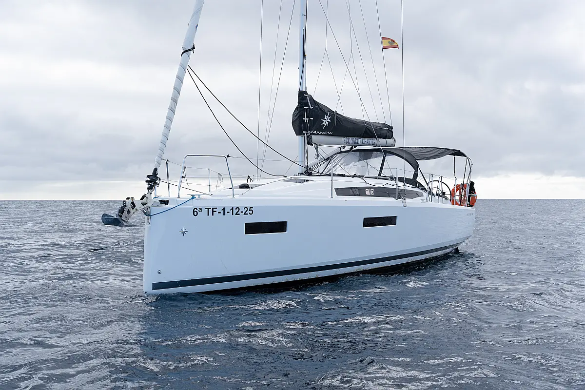 Boiler, First aid kit, Tool box, Fridge, Battery charger, 220V cable adapters, Lifevests, Harnesses, 2nd Anchor, Emergency tiller, Extinguishers, Boat hook, Exterior shower, Cockpit table, Bathing ladder, Freezer, Full electronic equipment, Full safety equipment, Furling genova, Sprayhood, Bimini, Mainsail battens, Fans, Autopilot