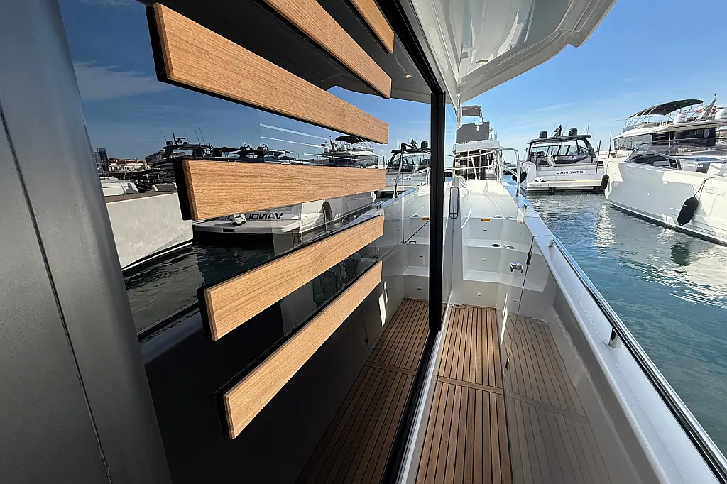 12V cockpit socket, Bilge pumps, Cockpit chairs (2), Cup holders, Deck washing pump, Bimini-Top, Flybridge fridge (40 L), Gangway (foldable), Led navigation lights, Mooring anchoring kit, Solid wood cockpit floor and starboard catwalk, Sunbathing cushions, Teak cockpit table (foldable), sun tent in cockpit
