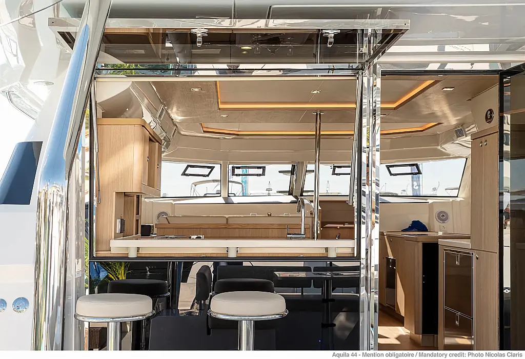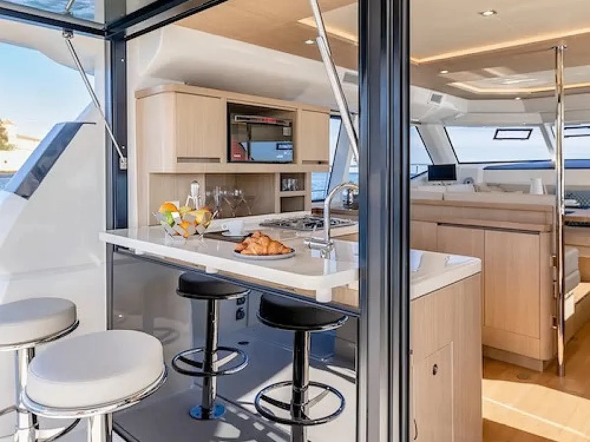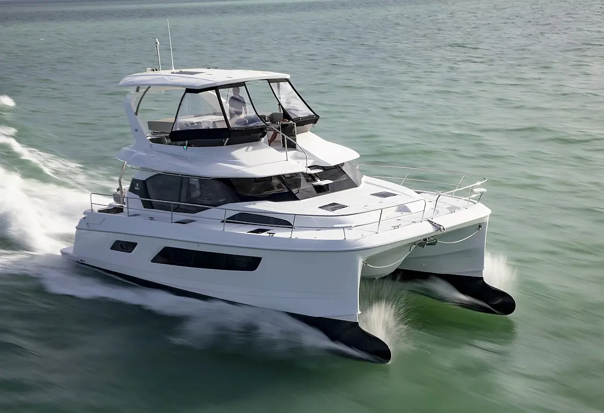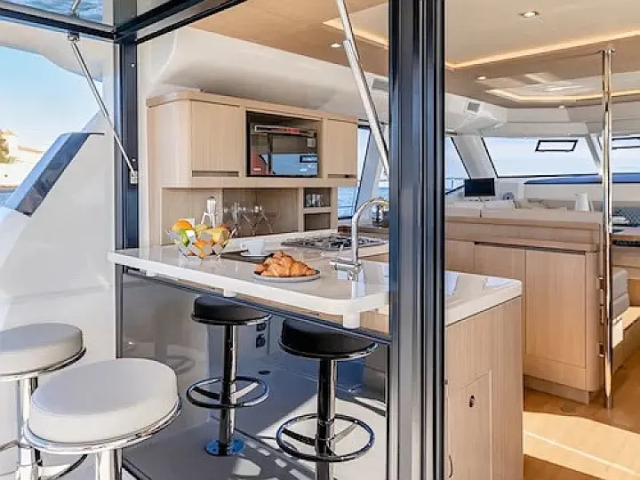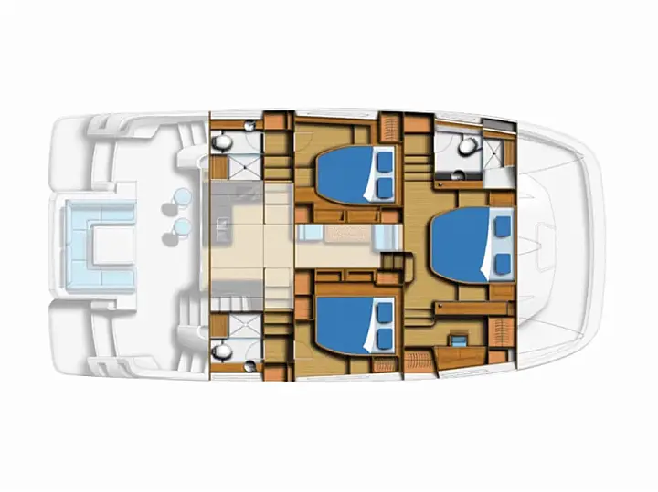 Bow thruster, Aft cockpit, Swimming ladder, Flybridge, Cockpit cushions, LED navigation lights, Speakers, Dinghy