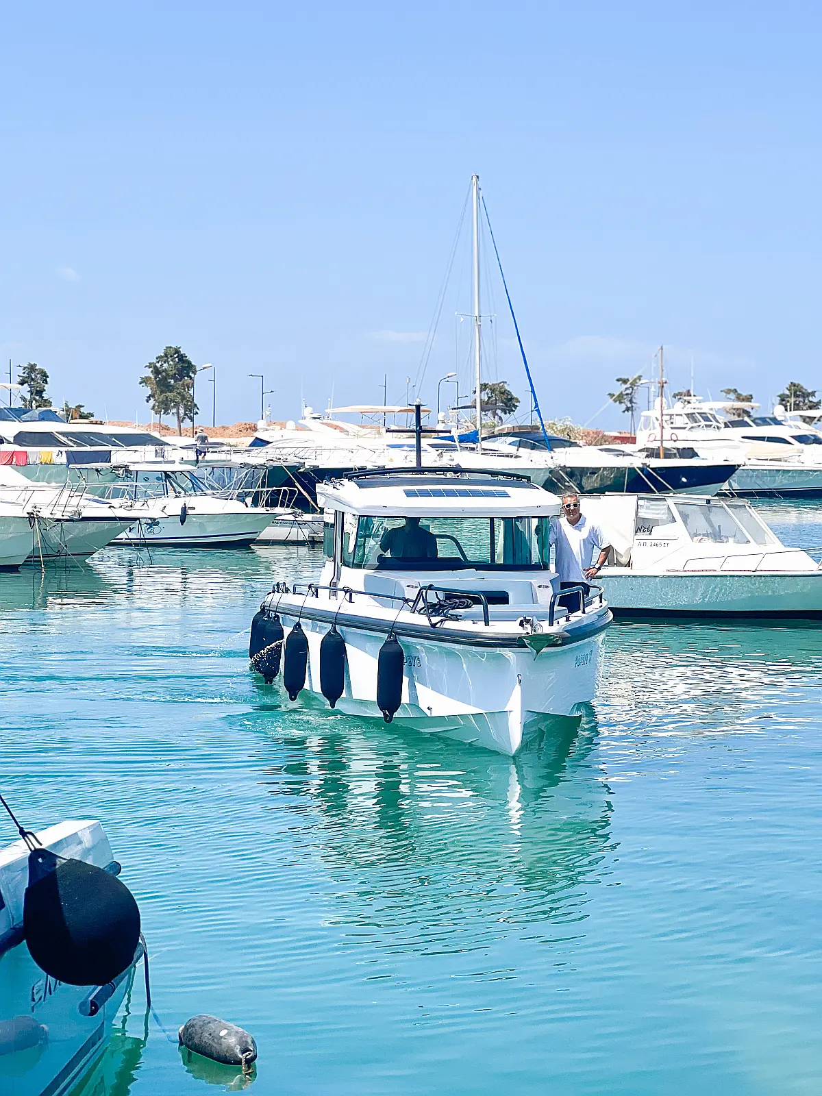 Steering wheel, Full audio Entertainment system, Speakers, Sonar, Shore power 230V with 40Ah charger, Solar Panels, Bilge pump, Bathing platform, Waterski frame, Sunshade, aft deck, Search lights, 12 Volt Socket (1), Fridge on Flybridge, Windlass, Inverter, Swimming ladder, Hot water
