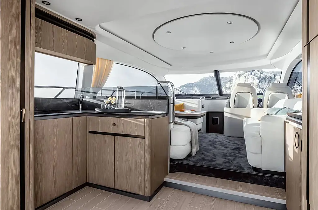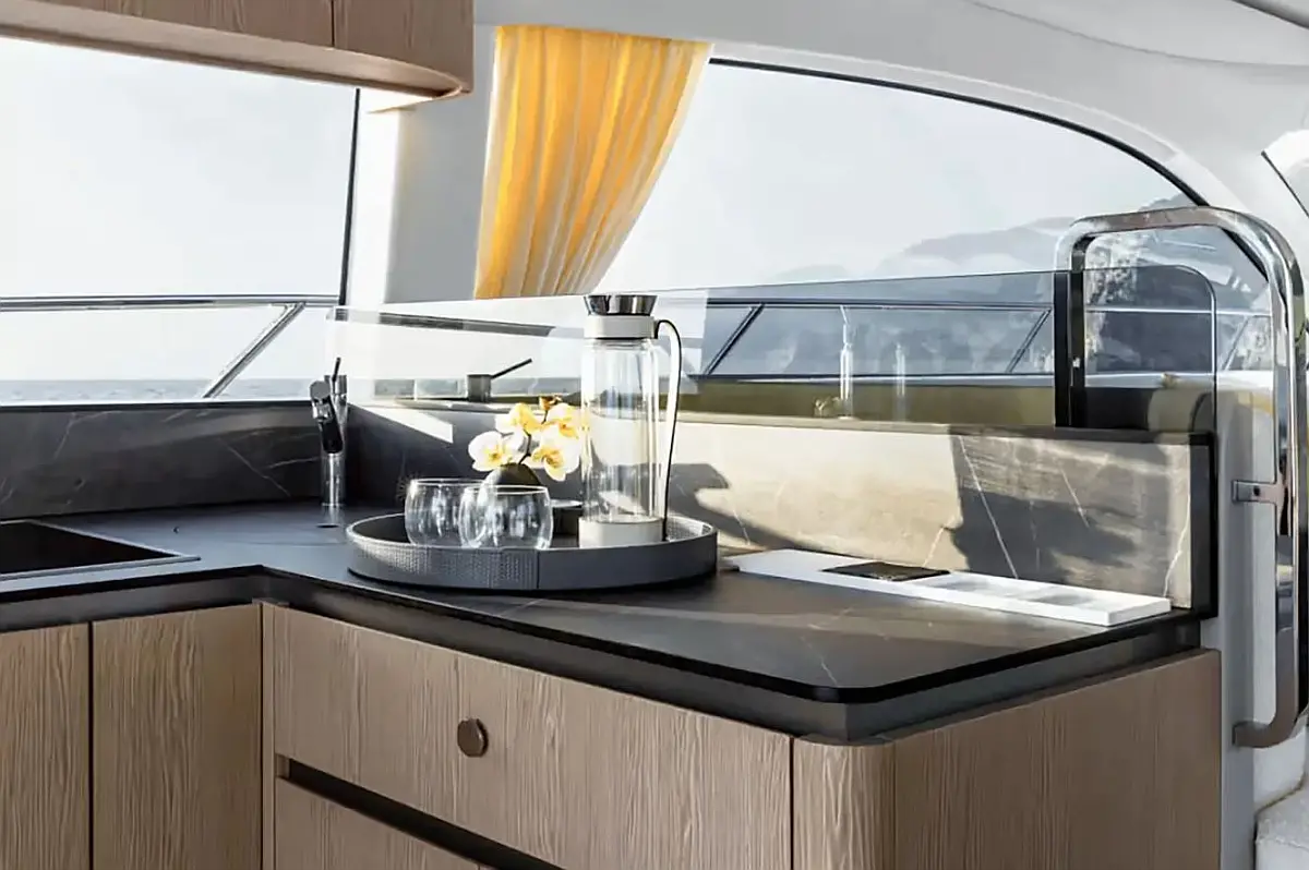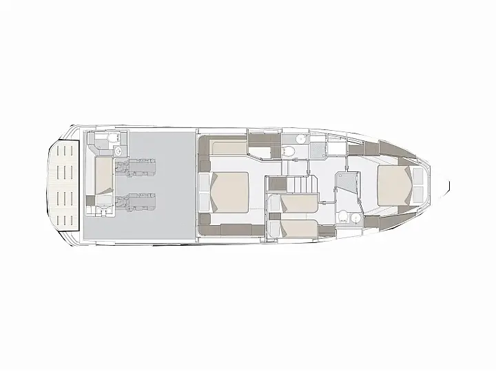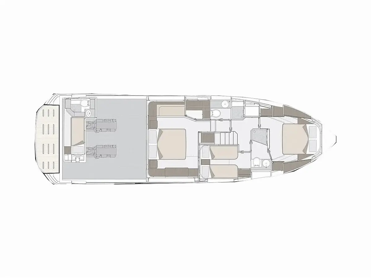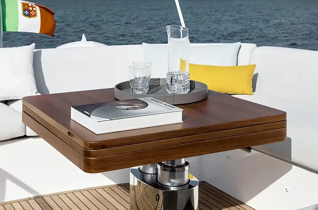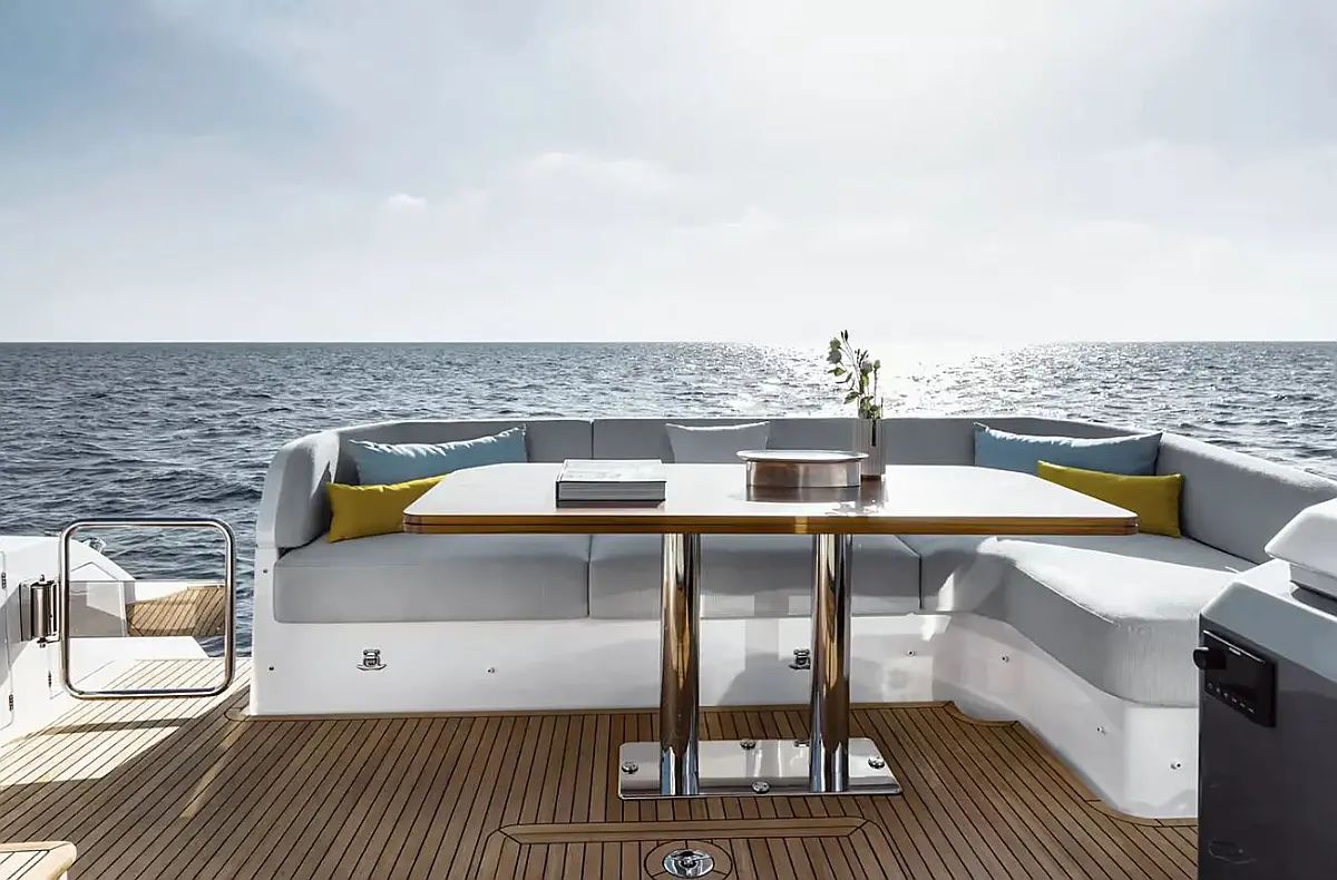 Blue teak in cockpit, Blue teak on side decks, Blue teak on swim platform, Flybridge furniture with refrigerator and barbecue, Flybridge top in synthetic material, Folding backrest for flybridge bow sunbathing cushions (Batyline fabric), Sunshade sail on bow with removable carbon fiber poles