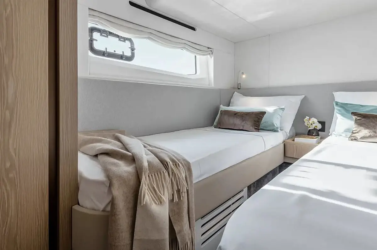 Wine cooler in galley, Crew cabin, Dimmer lighting in salon and cabins, Toilets with bidet faucet feature in Master and VIP bathrooms