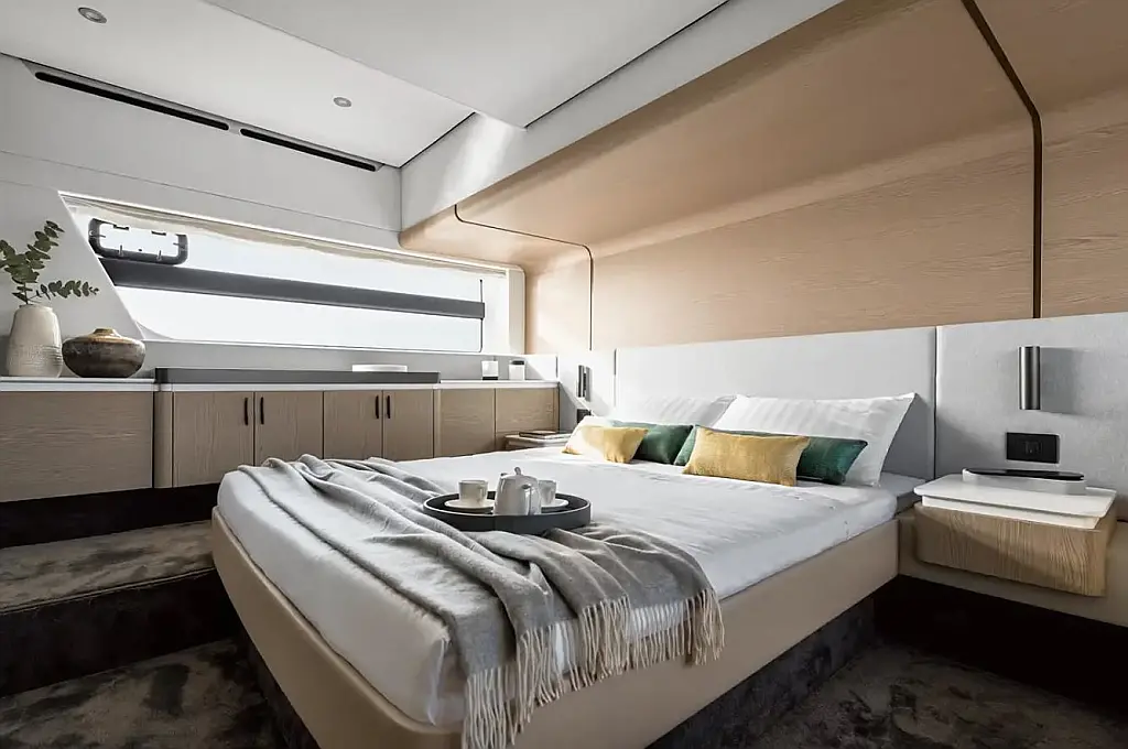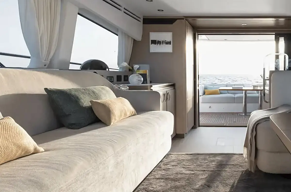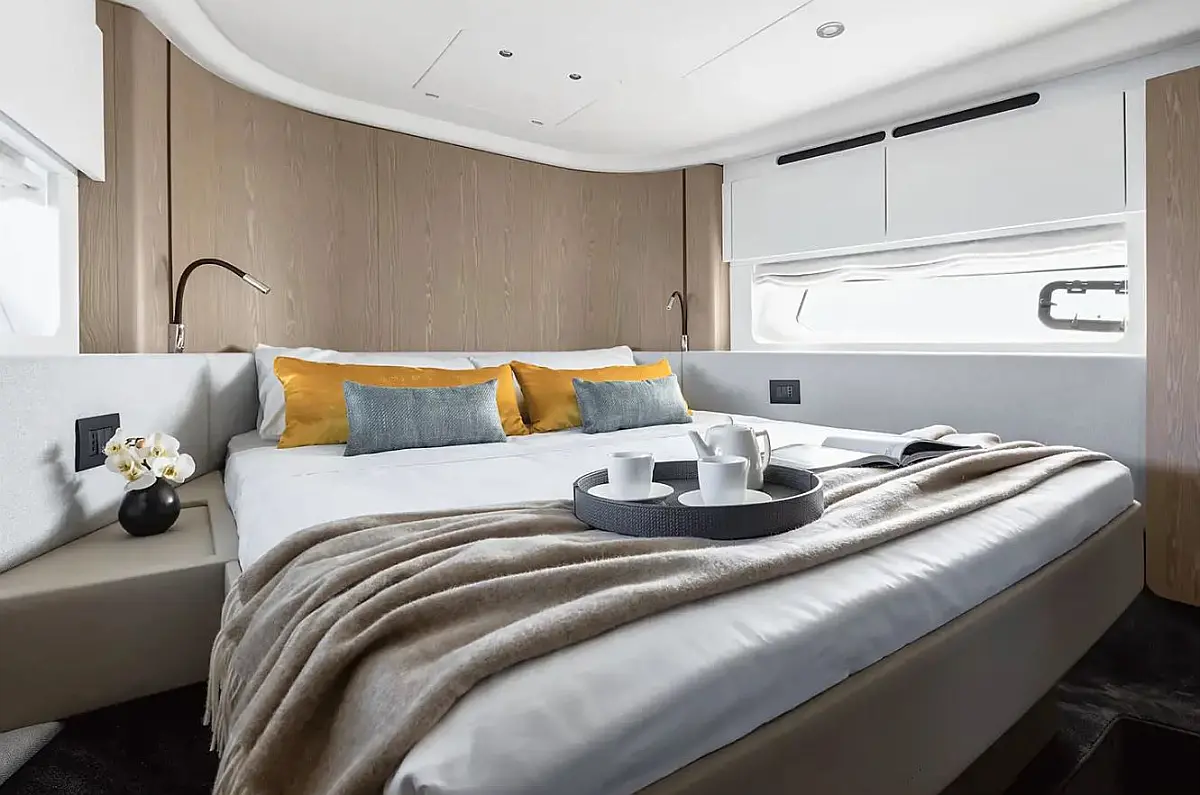 Proportional bow thruster, Automatic Bimini on flybridge (usable during navigation), Washer dryer combo unit, Telescopic gangway, Seakeeper stabilizer 9, Garmin Gold package, Garmin AIS 800, 2 additional cleats on transom, Stainless steel anchor, 2 underwater lights on transom, Upgraded external cushions in Batyline fabric