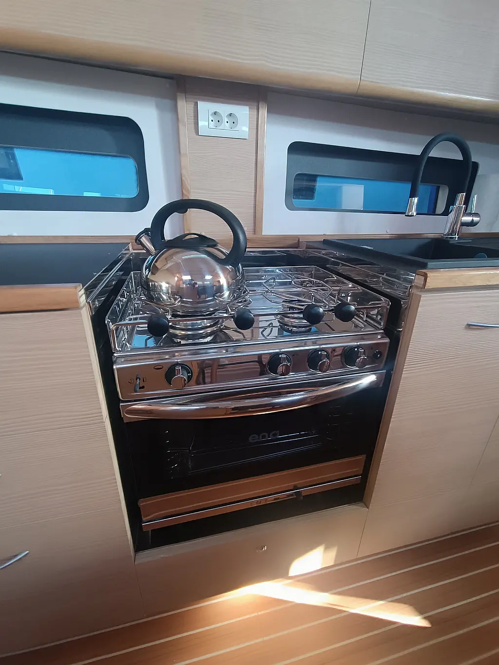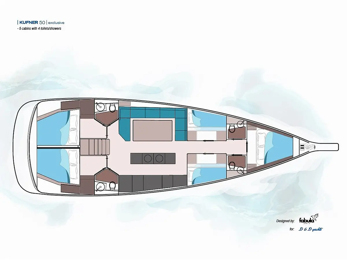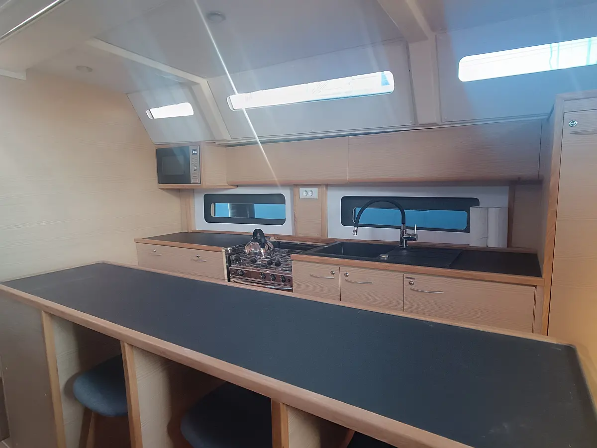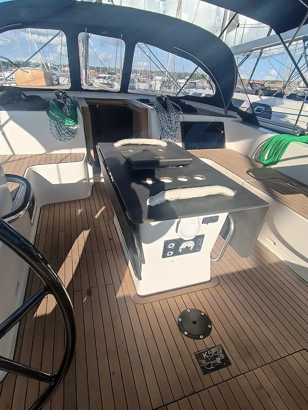 Dinghy (1), Refrigerator, Outside shower, Cockpit table (1), Bimini top (1), Sprayhood, Bathing platform, Steering wheel (2), Teak cockpit, Teak deck, Grill/Barbecue/Plancha