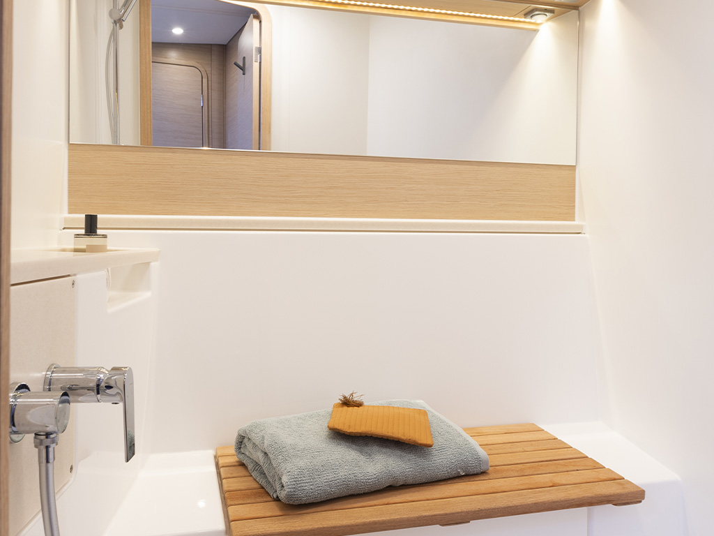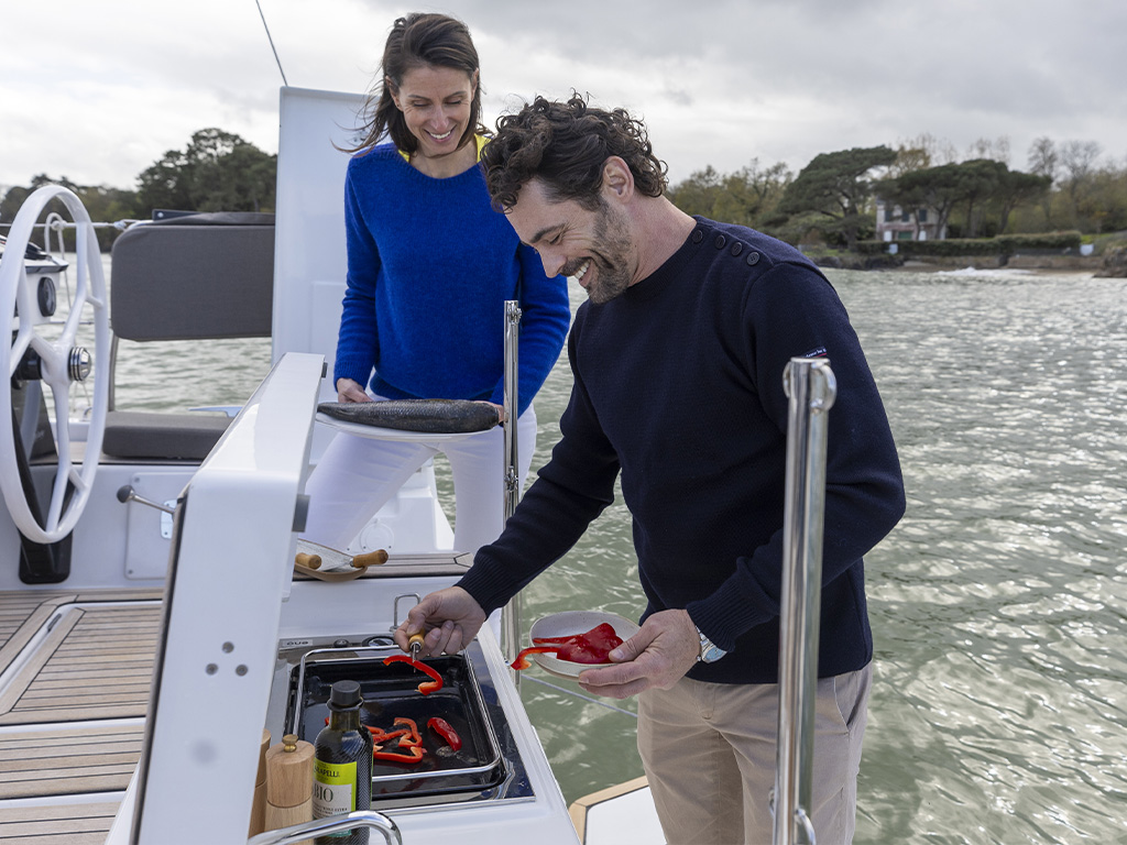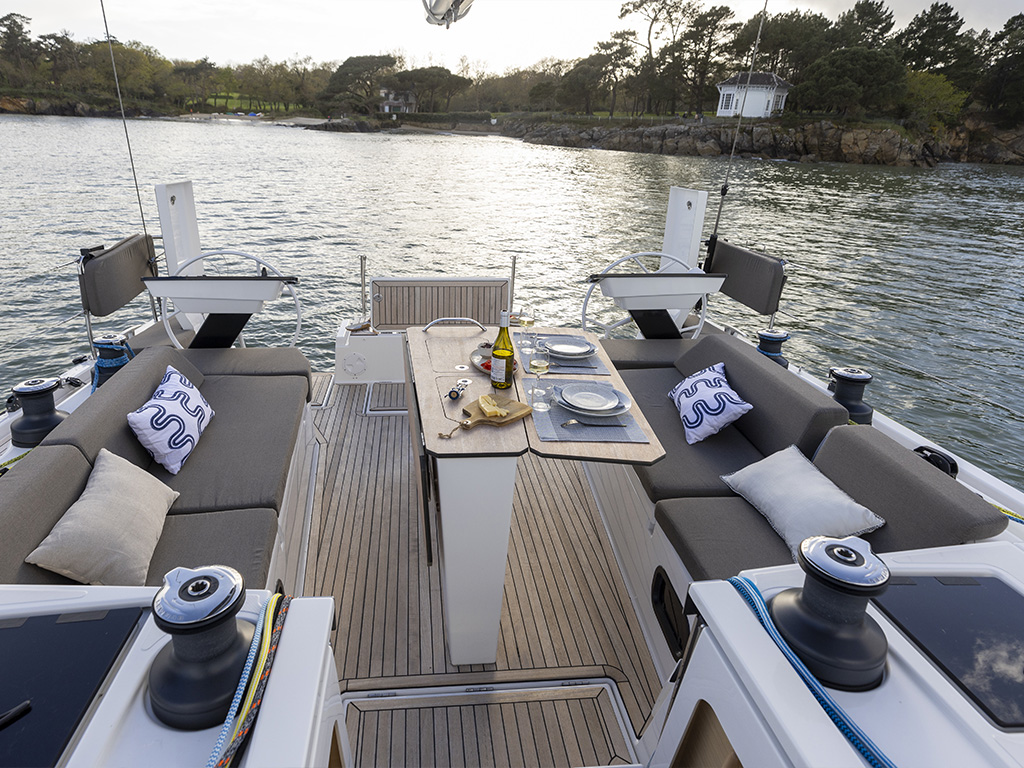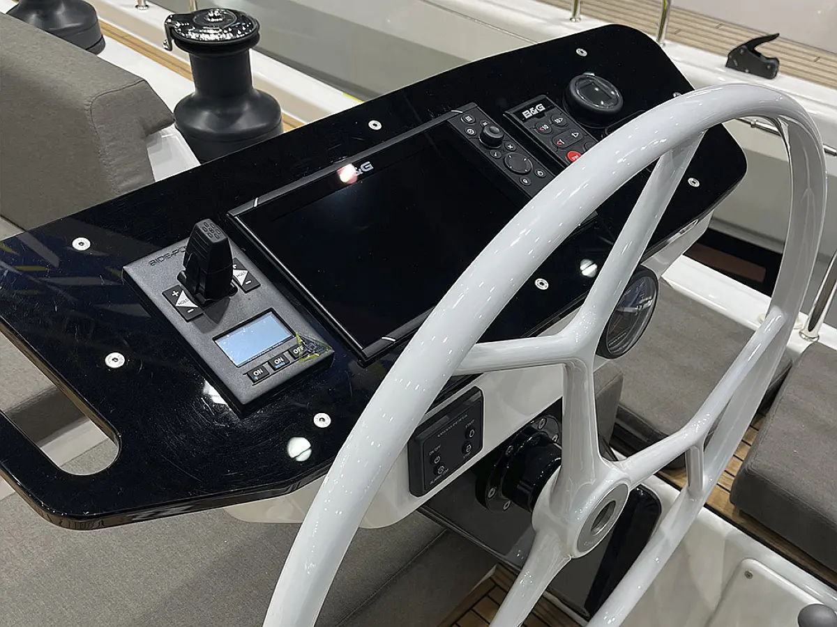 2 helm stations, Aluminium Gangway, Barbeque, Bathing platform lowerable (manual), Bimini, Cockpit cushions, Cockpit lighting LED, Cockpit table, Sprayhood, Stern shower (hot/cold) (1), Wetbar