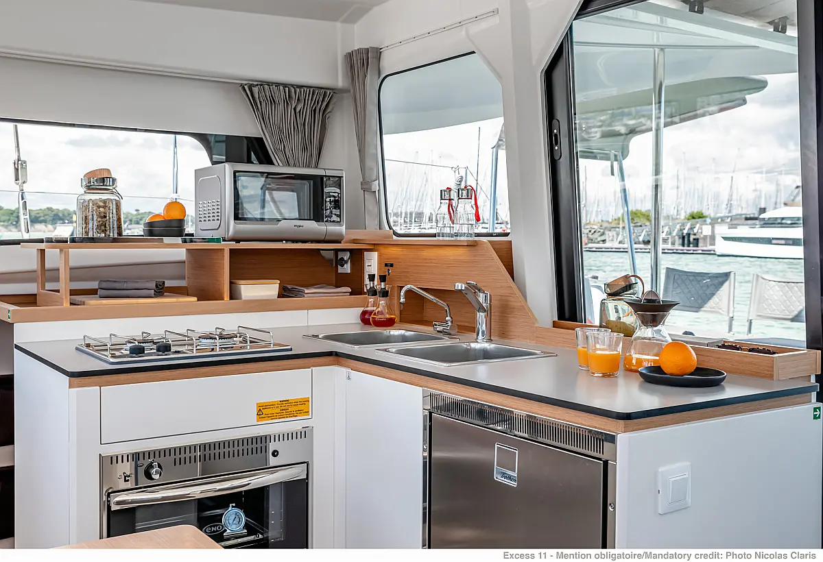 Hot water, Kitchen utensils (Galley equipment, cutlery), Oven, Refrigerator, Stove