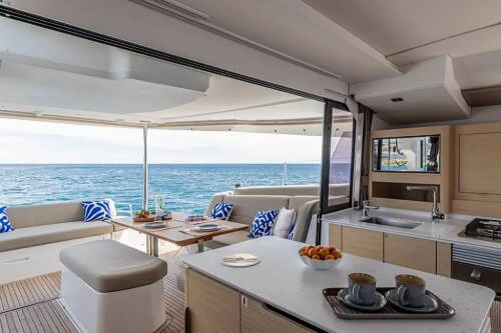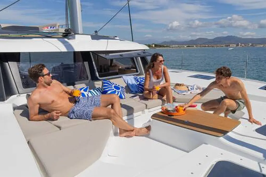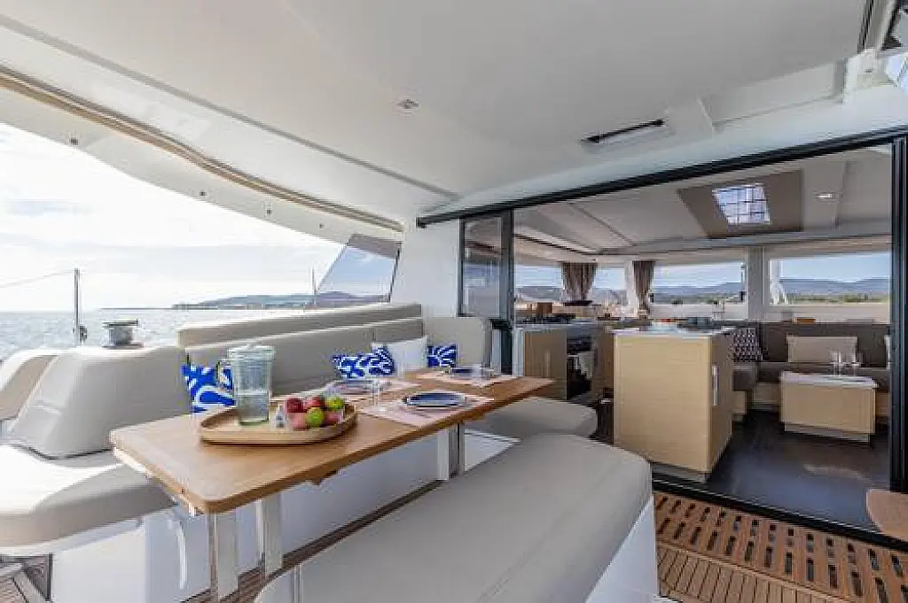 1 helm station, Aluminium Gangway, Barbeque, Bimini, Cockpit cushions, Cockpit lighting LED, Cockpit table, Cockpit table extension, Double rudder system, Electrically lowerable bathing platform, Fridge in cockpit, Solarium pads, Stern shower (hot/cold), Sun pad