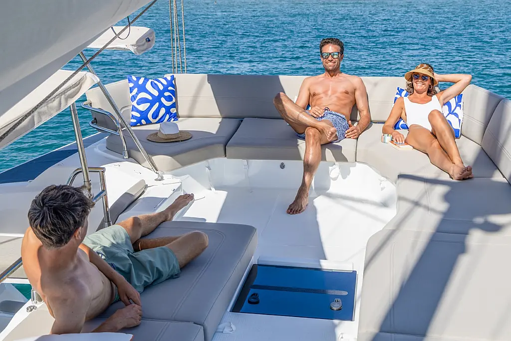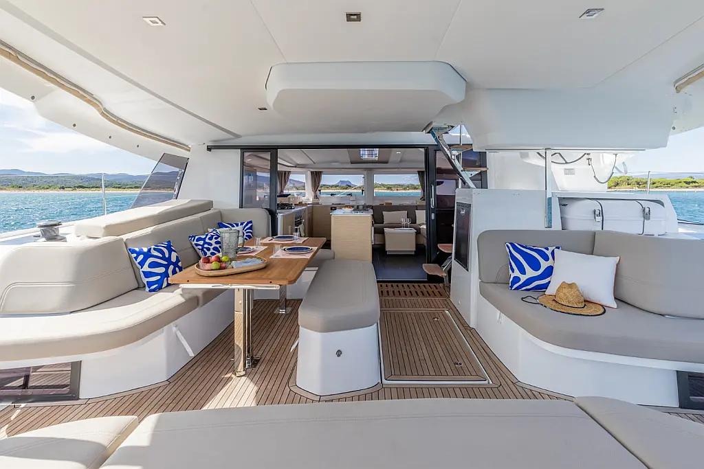 Helm (X 1), Bimini (plastic), Anchor (yes), Electric windlass (1500 Watts), Stern shower (hot water), Cockpit speakers (yes), Cockpit table (yes), Teak (fleksiteak in cockpit), Cockpit cushions set (Cockpit cushions & Flybridge and front cockpit cushions), Cockpit fridge (1), Cockpit shower (yes), Boat hook (yes), Baloon fender - aft (yes), Chain and rope for spare anchor (yes), Fenders (yes), Gangway (yes), Grill (Plancha gas)
