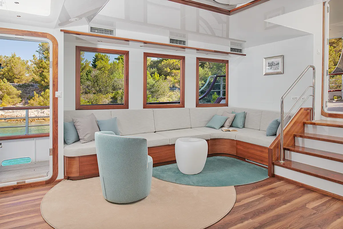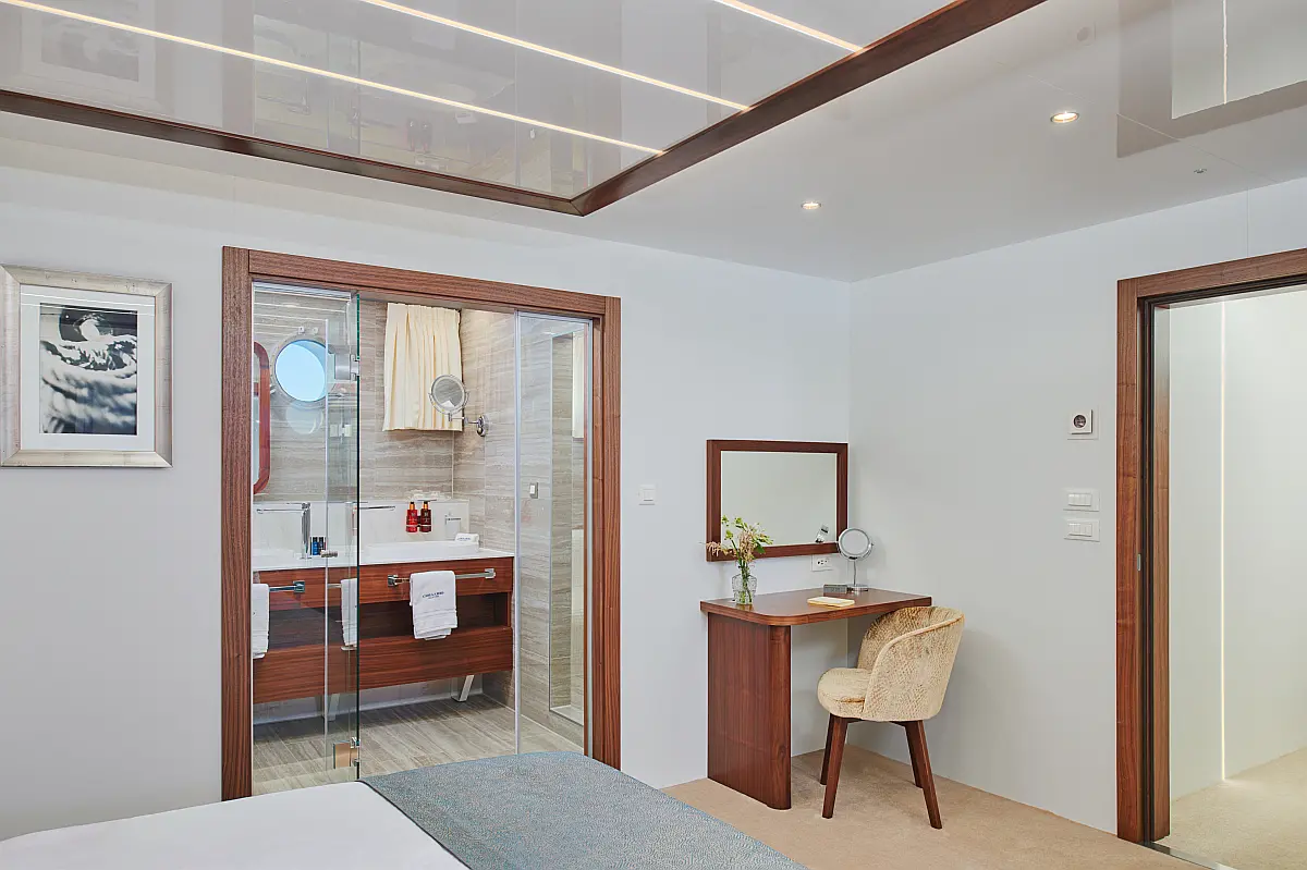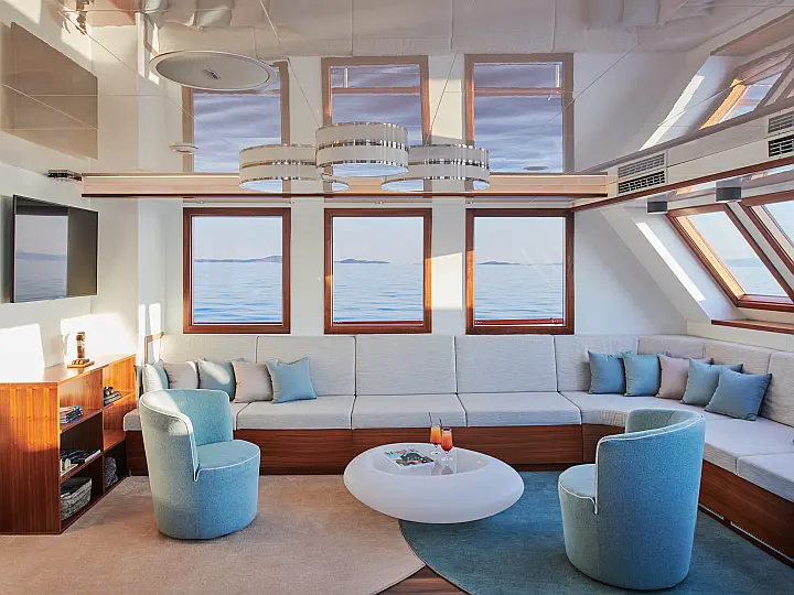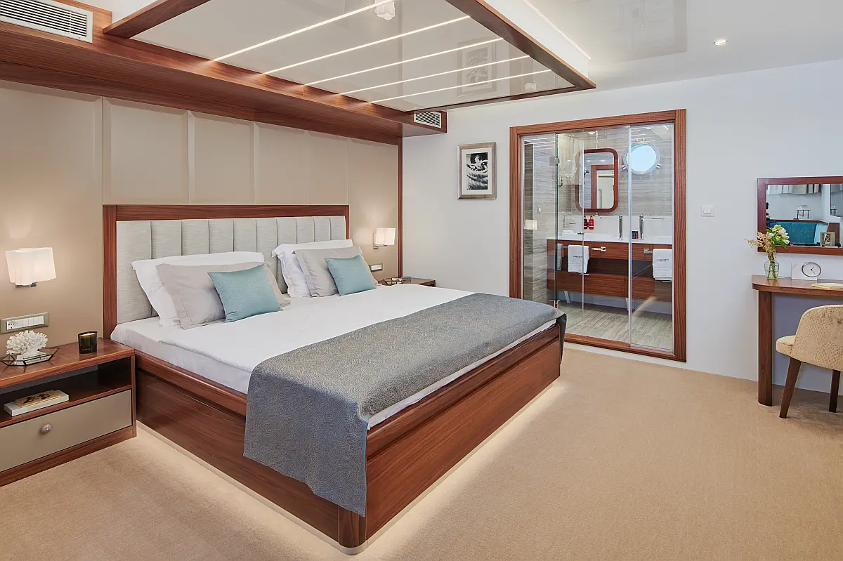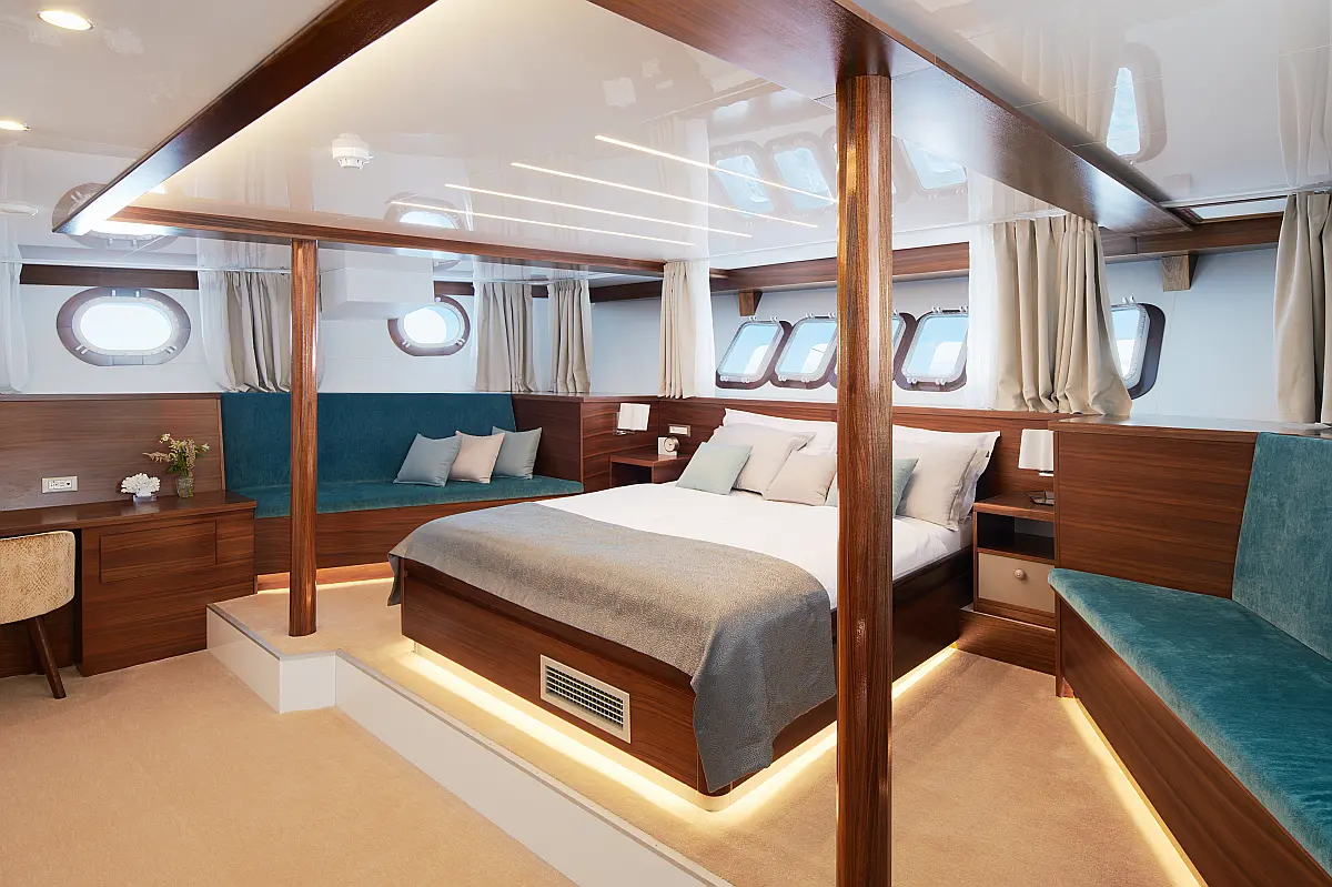 Master cabin (32m2, double bed (200*205cm), private bathroom with floor heating, SMART TV, Bose sound system, A/C 24/7), VIP cabin (30m2, double bed (180*200cm), private bathroon with floor heating, SMART TV with Bose sound system, plenty of natural light, A/C 24/7), Two double cabins (18m2, double bed (160*205cm), private bathroom, SMART TV with Bose sound system in both cabins, A/C 24/7), Two twin cabins (17m2, two twin beds (85*200cm), private bathroom, SMART TV with Bose sound system in both cabins, A/C 24/7)