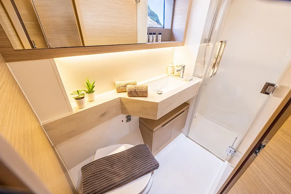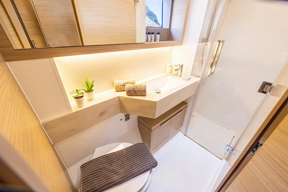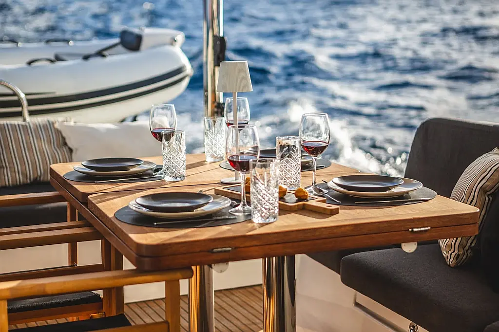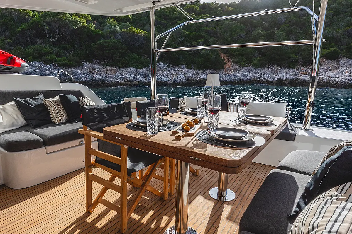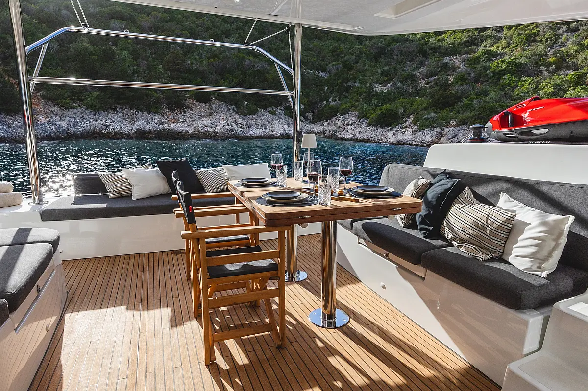 Ice-Maker, Teak Deck, Air Conditioning, Bimini (Hard Top), Watermaker, Generator, Inverter, Electric Toilet, Electric winch, Underwater lights, Gangway (Hydraulic), Large Flybridge